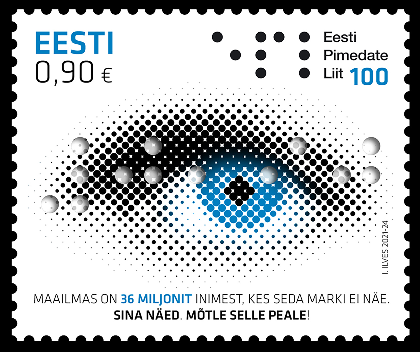 „Eesti Pimedate Liit 100“ (19.10.2021, kunstnik Indrek Ilves) margile on pimekirjas stantsitud margi nominaal 0,90. Sellise trükitehnikaga marke ei ole Eestis varem ilmunud.