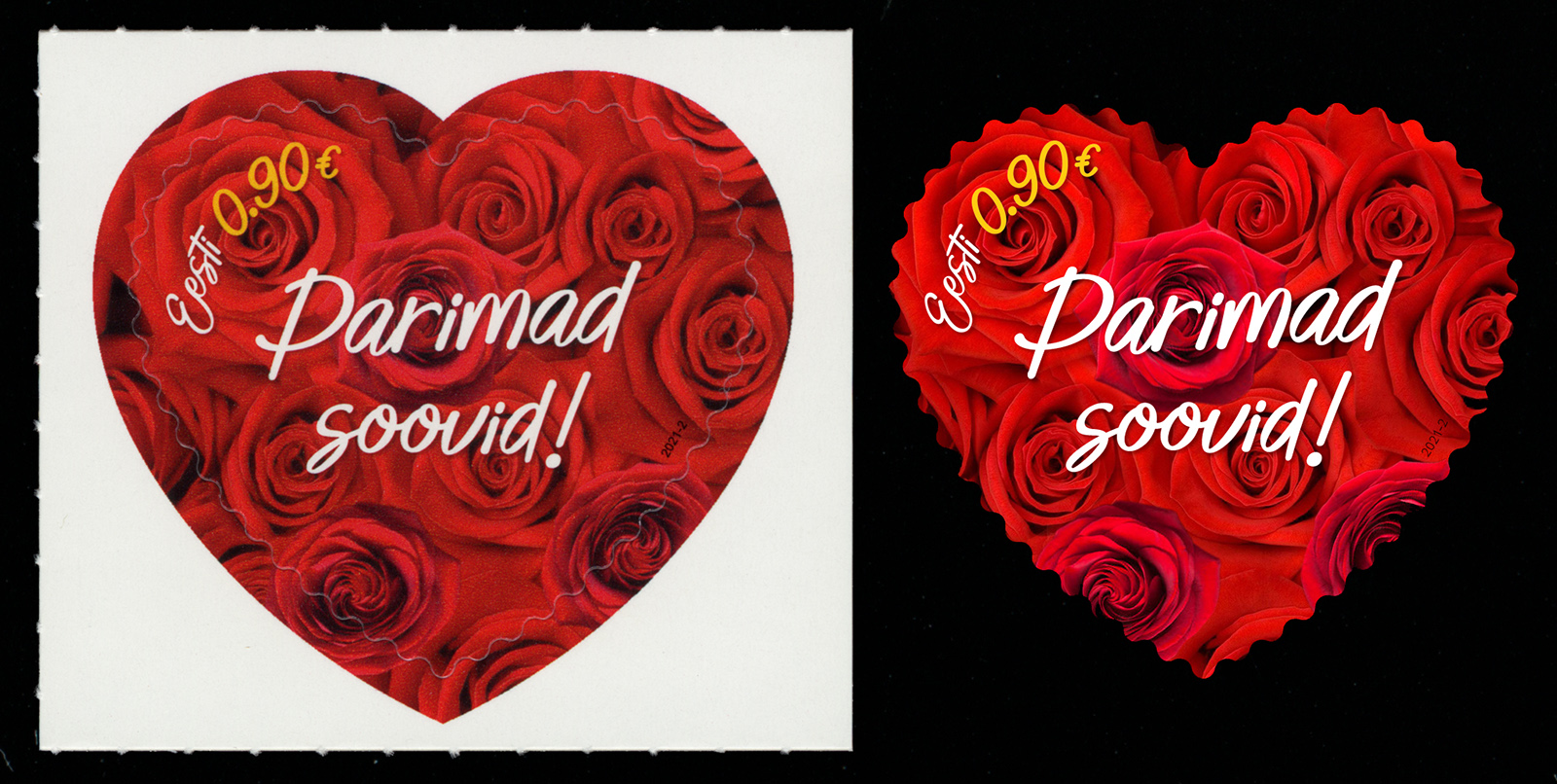Ülemise margi trükiarv 40 000, alumise 100 000, iseliimuvad, trükikoda Cartor Security PrintingSõbrapäev, 4.02.2021, kunstnik Indrek Ilves