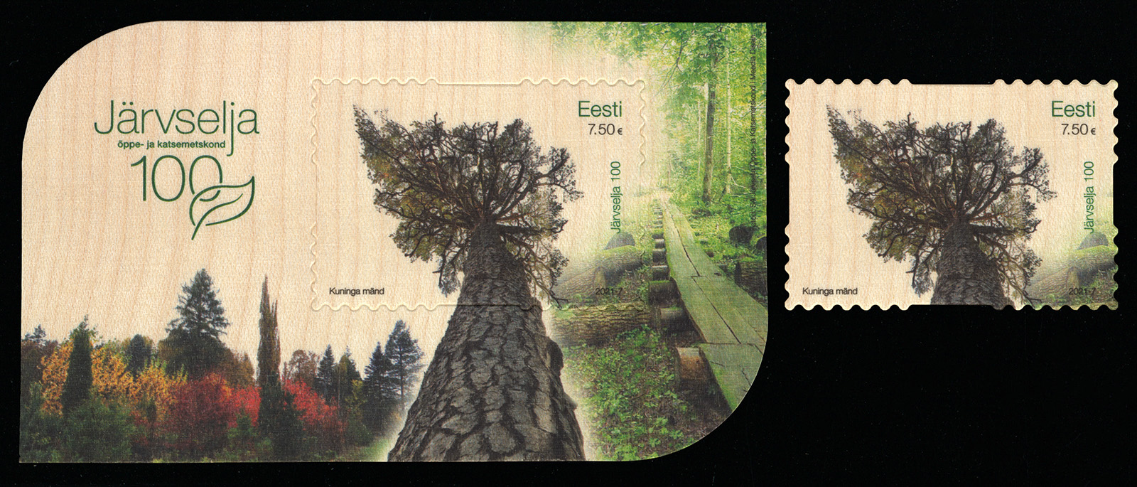 „Järvselja 100“ puidust margiploki puhul (13.04.2021, kunstnik Indrek Ilves) on tegu esimese puiduspoonile trükitud margiga Eestis. Kunstnik Indrek Ilvese sõnul ei erine margi kujundamine puidule väga palju pabermargist. Arvestada tuleb sellega, kõik, mis on kujunduses valge, jääb margil puidustruktuurina näha. Mark on trükitud mägivahtraspoonile. Margil kujutatud suursugune Järvselja kuninga mänd on looduskaitse all. 1999. aasta andmetel oli selle tüve ümbermõõt 3,25 m ja kõrgus 33 m. Vanust on puul peaaegu sama palju kui Tartu Ülikoolil, üle 380 aasta.