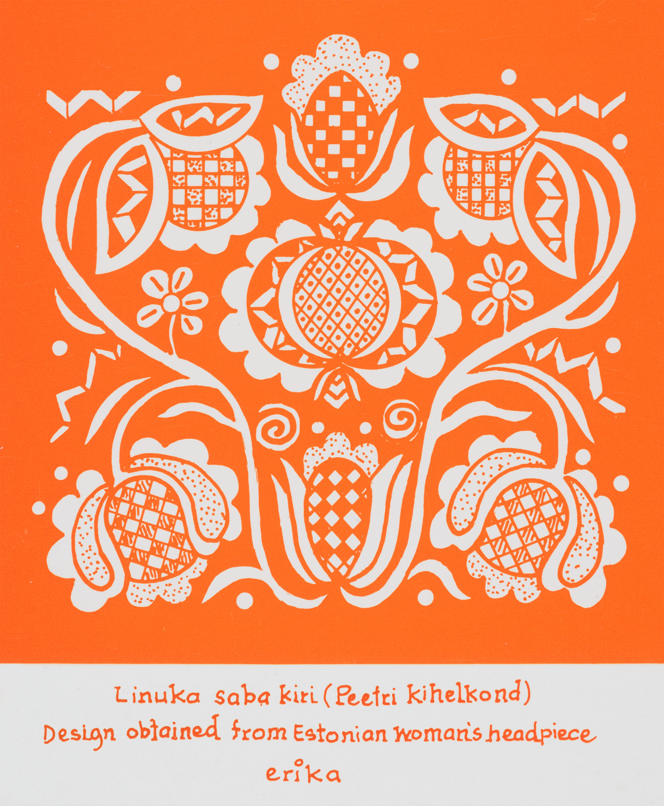 Haapsalu salli motiividHalliste kihelkondHelme kihelkondHelme kihelkond. VärvilehtIisaku kihelkondJõelähtme kihelkondLihula kihelkondLihula kihelkondLihula kihelkondLillekirjaga postkaart 1991Mustrimotiiv jõulukaardilPeetri kihelkondPõlva kihelkondSeto vöökiriSokimuster. VõrumaaTarvastu kihelkondTarvastu kihelkondTarvastu kihelkondTarvastu tanukiri. VärvimislehtTarvastu tikand. VärvimislehtVigala kihelkondSokimuster. Võrumaa. Värvimisleht