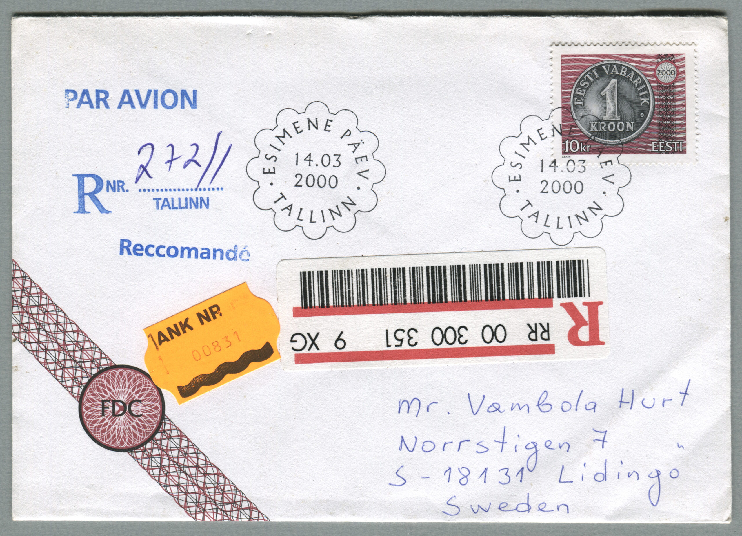 ErakoguTähitud kiri, mis on saadetud õhupostiga Tallinnast 14.03.2000 Lidingö (Rootsi).