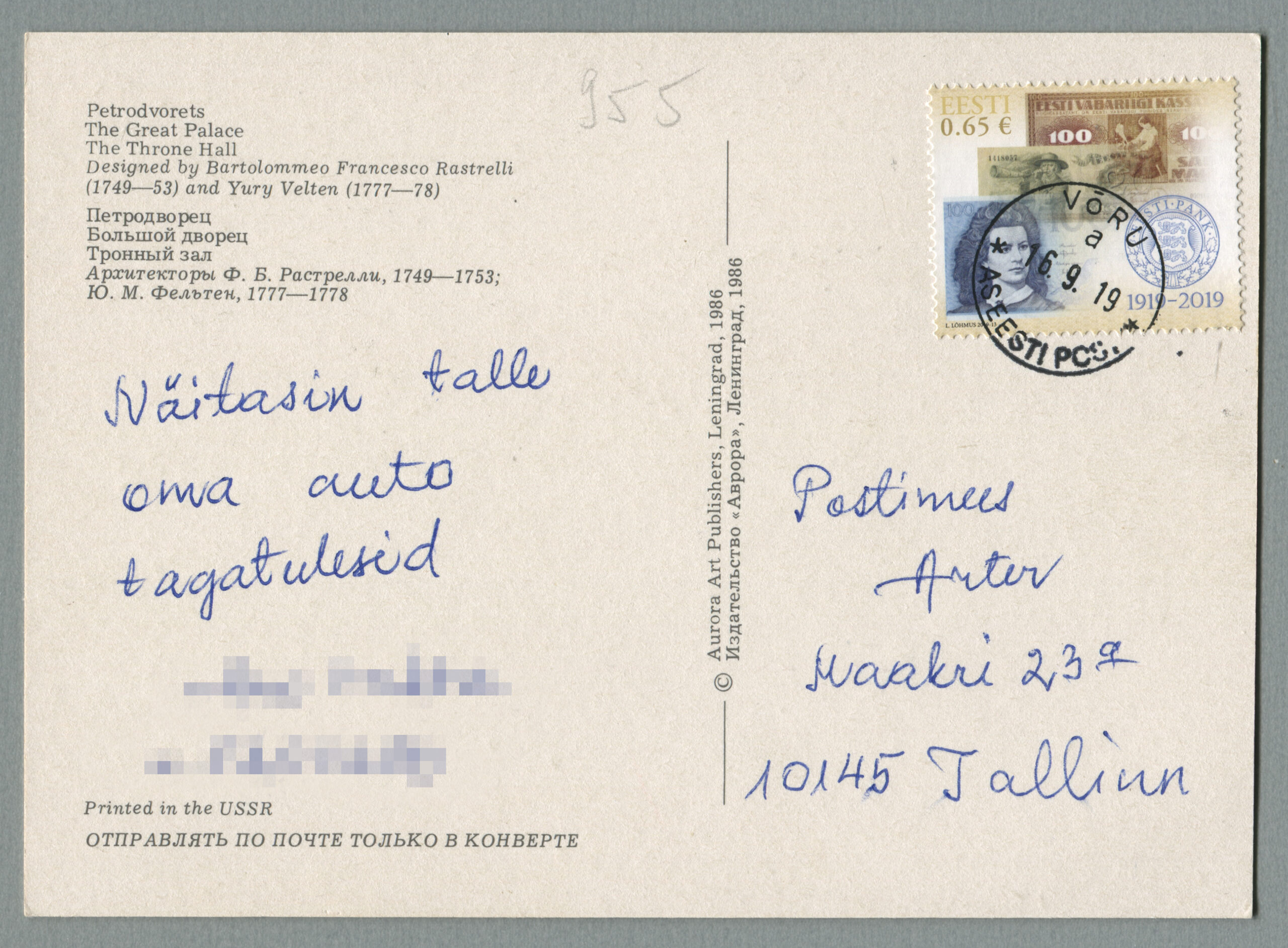 ERMi koguPostkaart, mis on saadetud Võrust 16.09.2019 Tallinna.