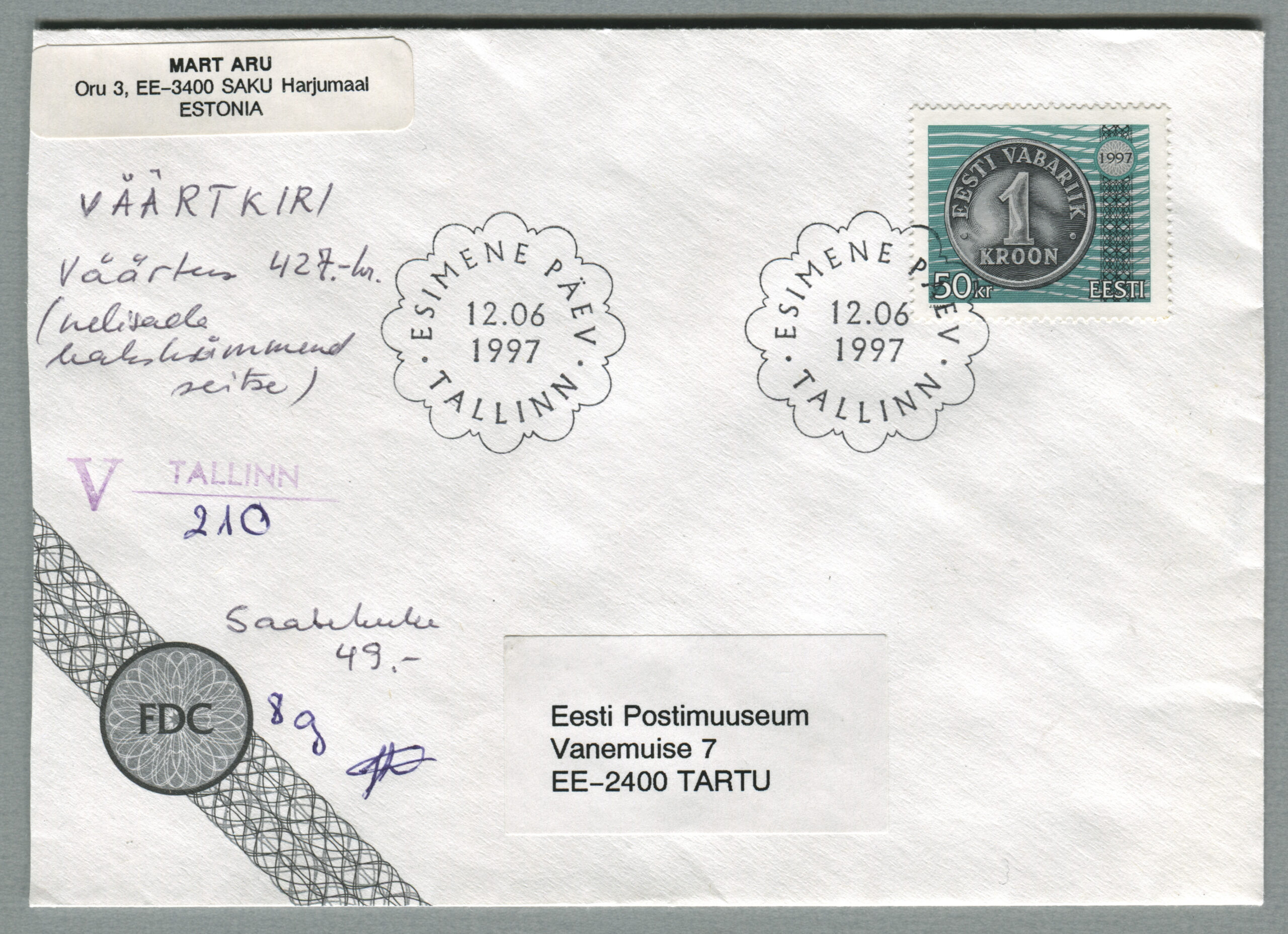 ERMi koguTähitud kiri, mis on saadetud margi ilmumise päeval Tartust, 12.06.1997.