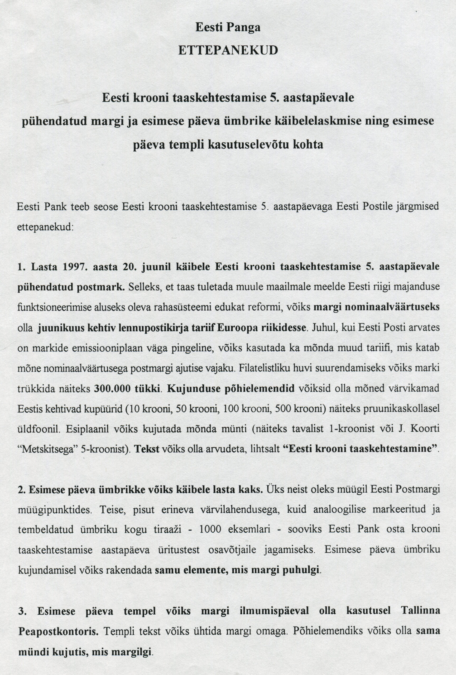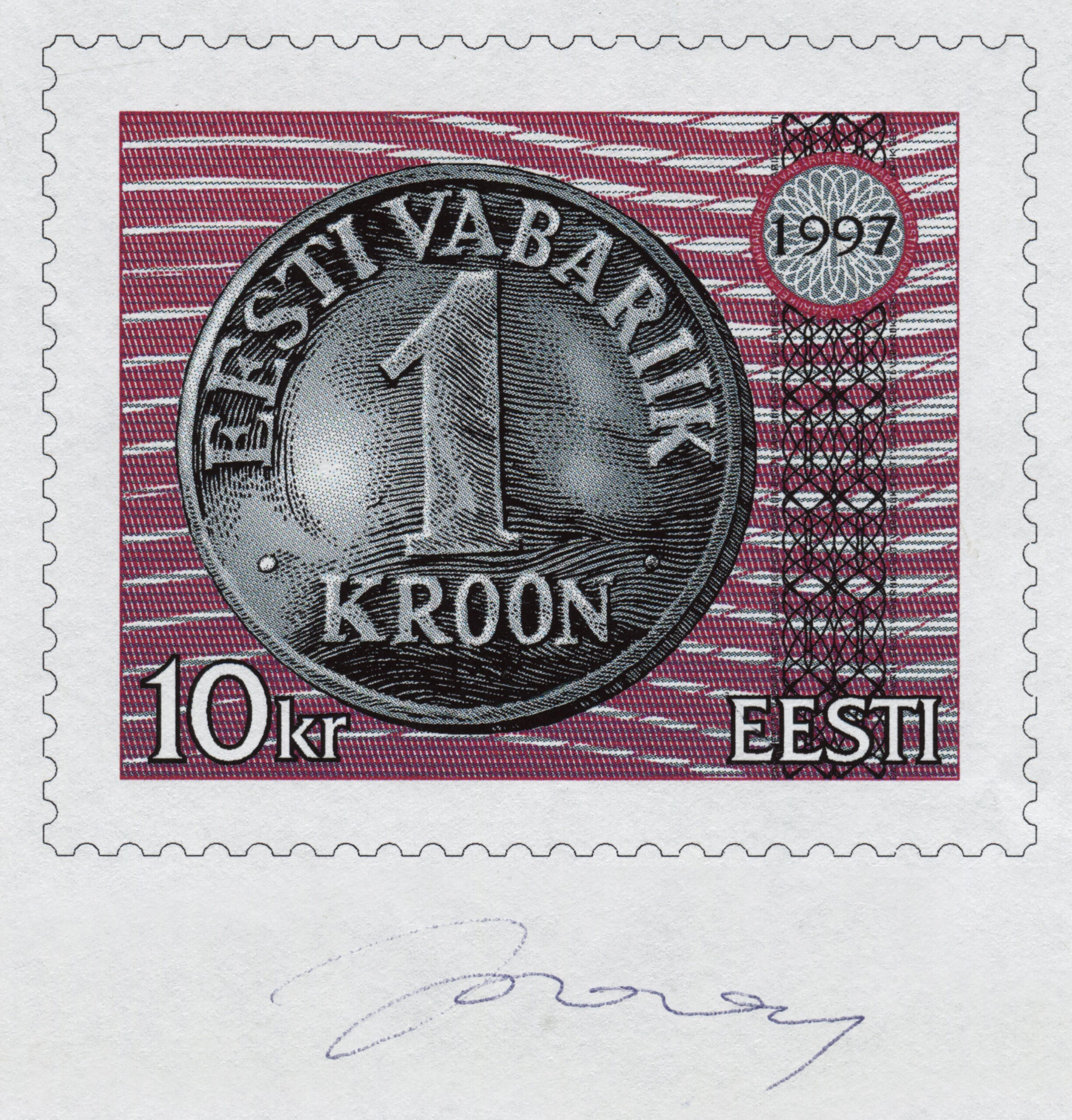 Eesti kroonile pühendatud margid Eesti Pank pöördus 6. detsembril 1996 Eesti Posti poole ettepanekuga välja anda kroonile pühendatud postmark: 1997. aasta 20. juunil möödub 5 aastat Eesti krooni taaskehtestamisest. Eesti rahareformi edukus lõi eeldused meie riigi majanduse siirdumisele turumajandusse. Eesti kogemused ja edu oma raha ning majanduse valdkonnas tähendavad muu hulgas seda, et tuleva aasta juunis toimuvaist krooni taaskehtestamise aastapäeva rahvusvahelistest üritustest, mis tipnevad konverentsiga, võtavad teiste seas eeldatavasti osa paljude Euroopa riikide juhtivad poliitikud, majandusteadlased ja rahandusringkondade esindajad. Seoses eeltooduga palume Eesti Postil lisada väljaspool üldist kava 1997. aasta postmarkide emissiooniplaani Eesti krooni taaskehtestamisele pühendatud margi väljaandmine koos esimese päeva ümbrike ja templi kasutuselevõtuga. Seda põhjusel, et majanduspoliitiliselt kaalukuselt on krooni taaskehtestamise 5. aastapäev võrreldav enamiku majandus-, poliitika- või kultuurisündmustega, millest on möödunud või möödumas ümmargused 100 aastat.