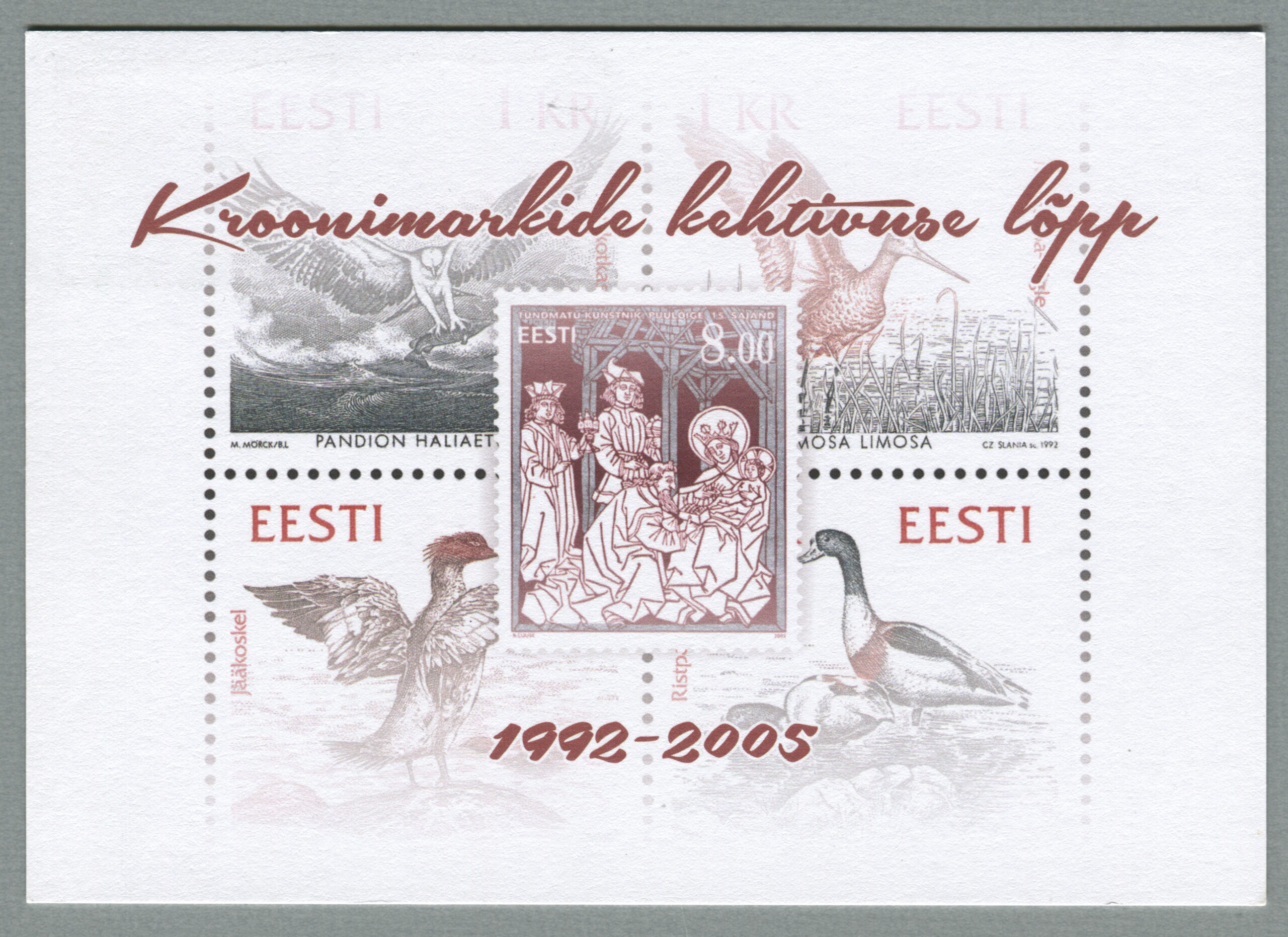 Esimene kroonivääringus mark oli Eesti–Läti–Leedu–Rootsi ühisväljaanne, margivihik „Mare Balticum. Merelinnud“, 3.10.1992. Eesti margil on jääkoskel ja selle kujundas Lembit Lõhmus.