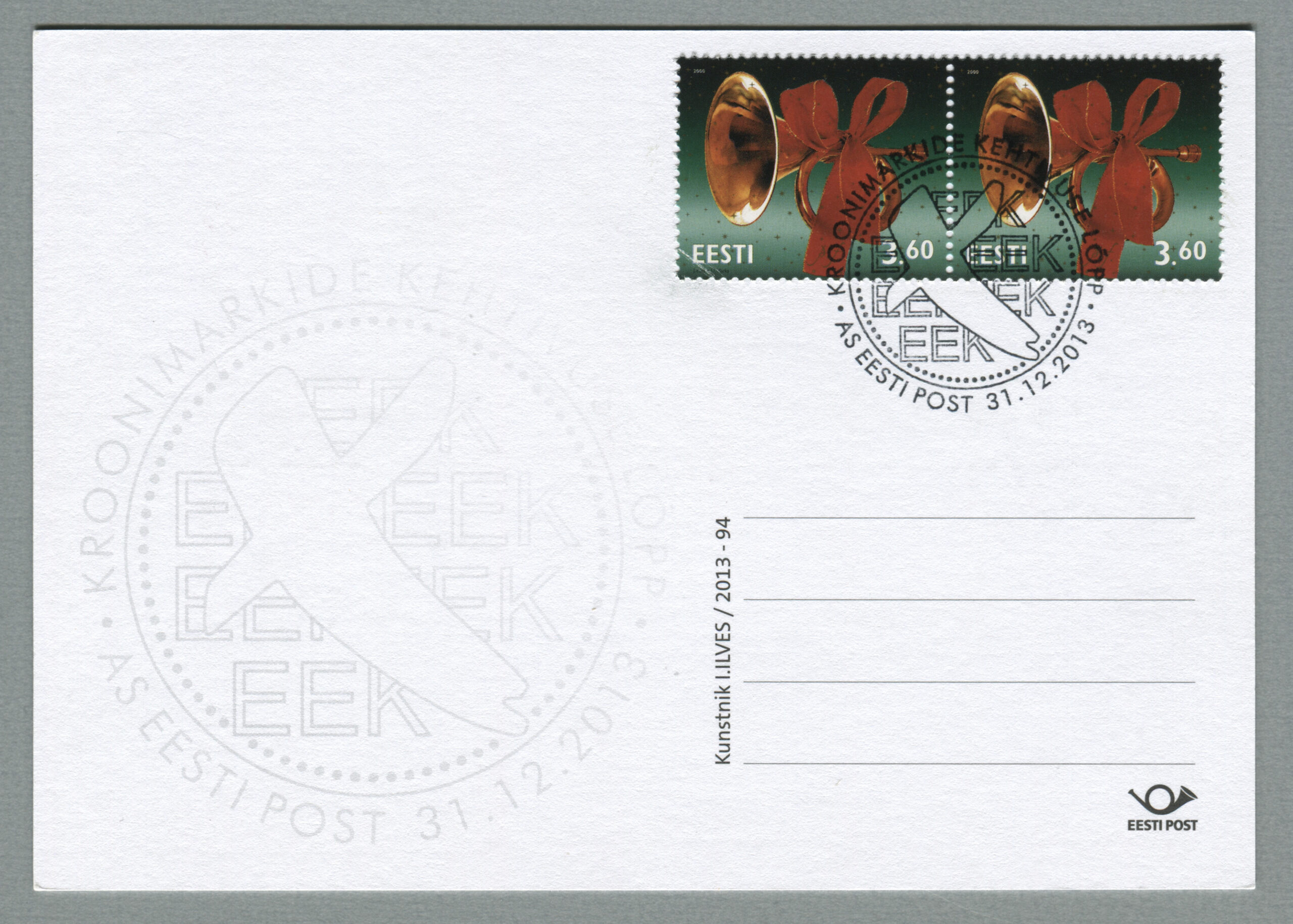 ErakoguEesti Posti postkaart nr 94 (tagumine külg). Kunstnik Indrek Ilves. Eritempel „Kroonimarkide kehtivuse lõpp, 31.12.2013“.