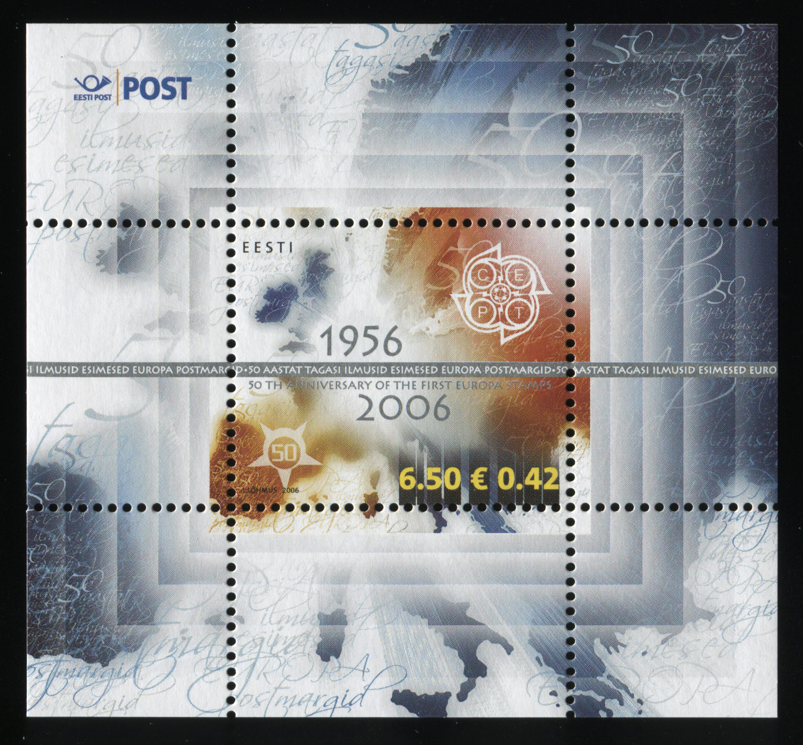 ERMi koguEUROPA postmark 50, margiplokk, 4.01.2006. Kunstnik Lembit Lõhmus. Markidel, mis ilmusid 4.01.2006–25.11.2010, oli kohustuslikult kaks nominaali (kroon ja euro).