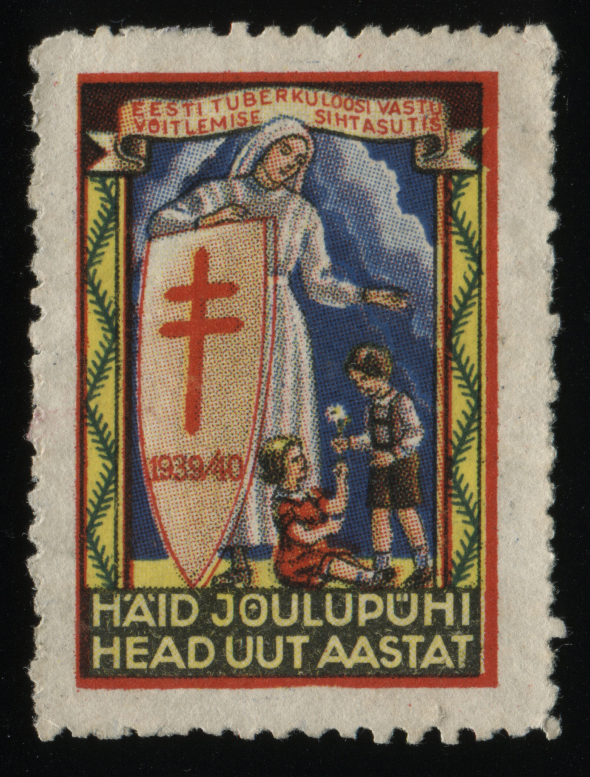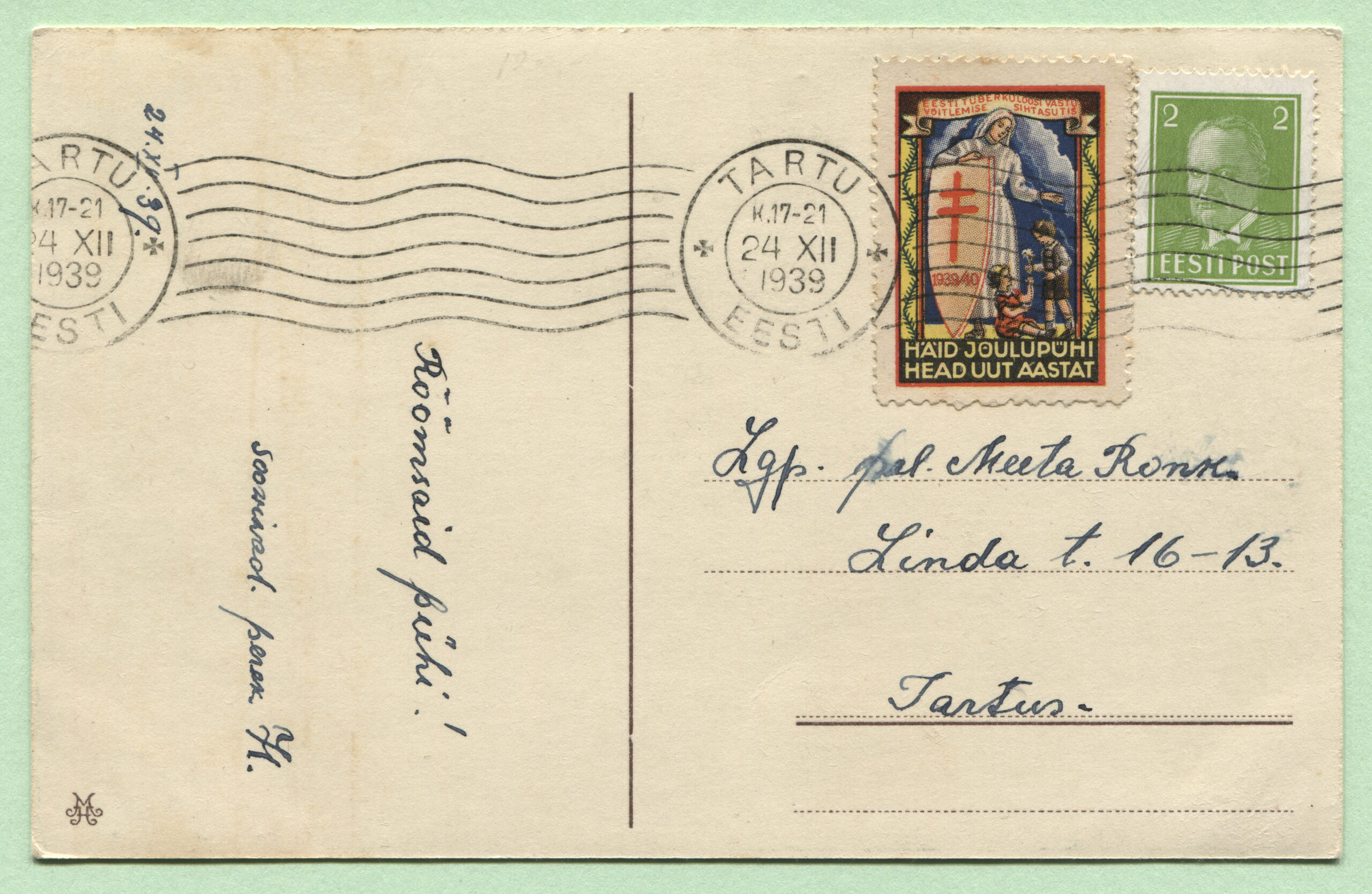 ErakoguPostkaardil meenemark „Häid jõulupühi, head uut aastat“. Eesti Tuberkuloosi vastu võitlemise sihtasutus, 1939/40