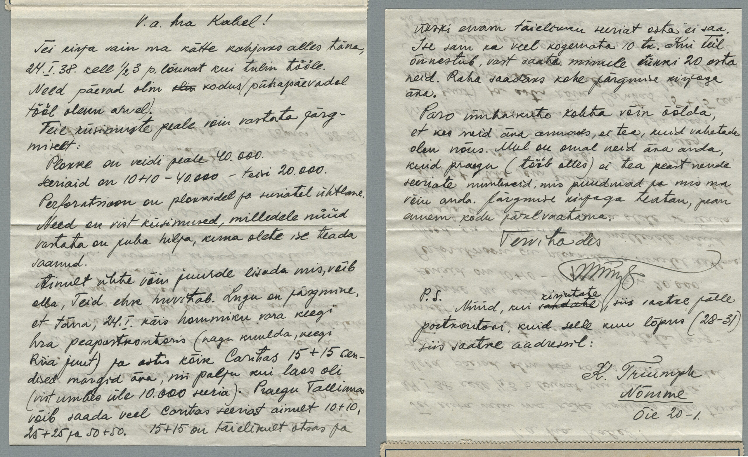 ERMi koguKaartkiri (seeria nr 8), mis on saadetud 24.01.1938 Tallinnast Petserisse