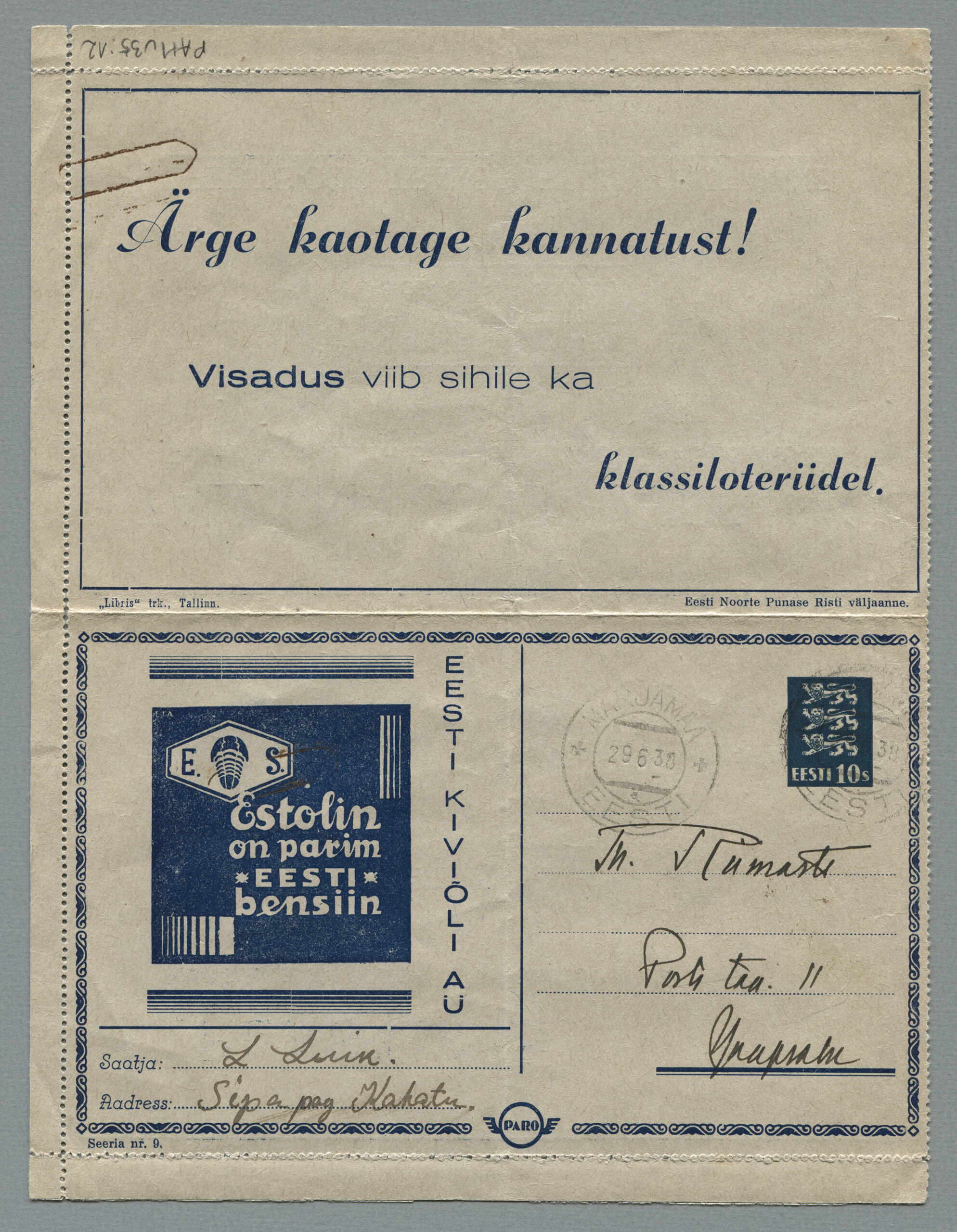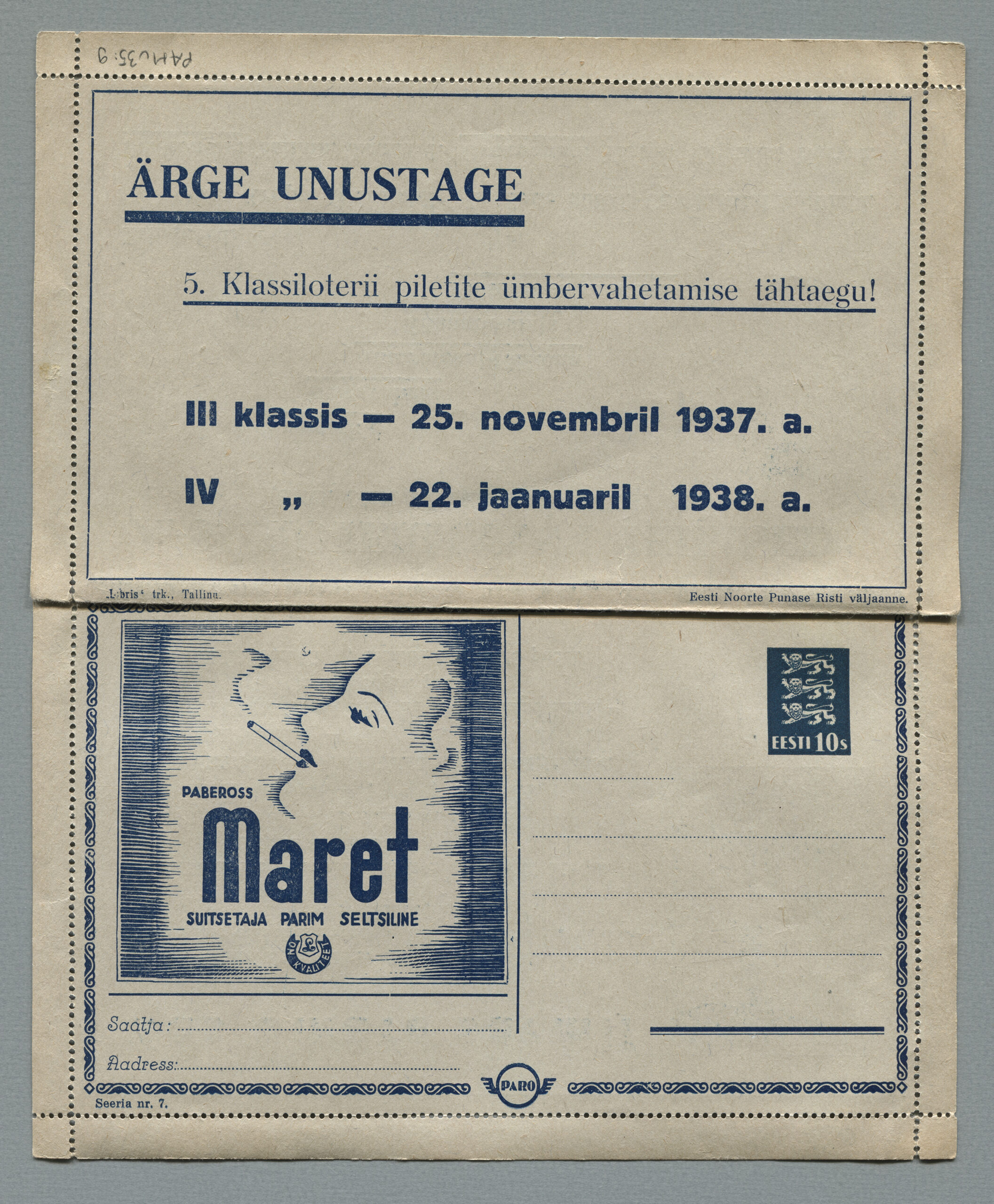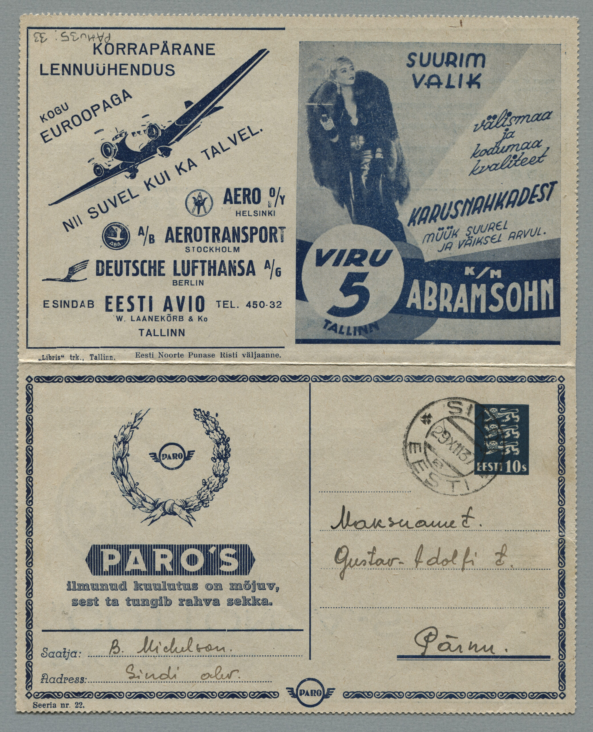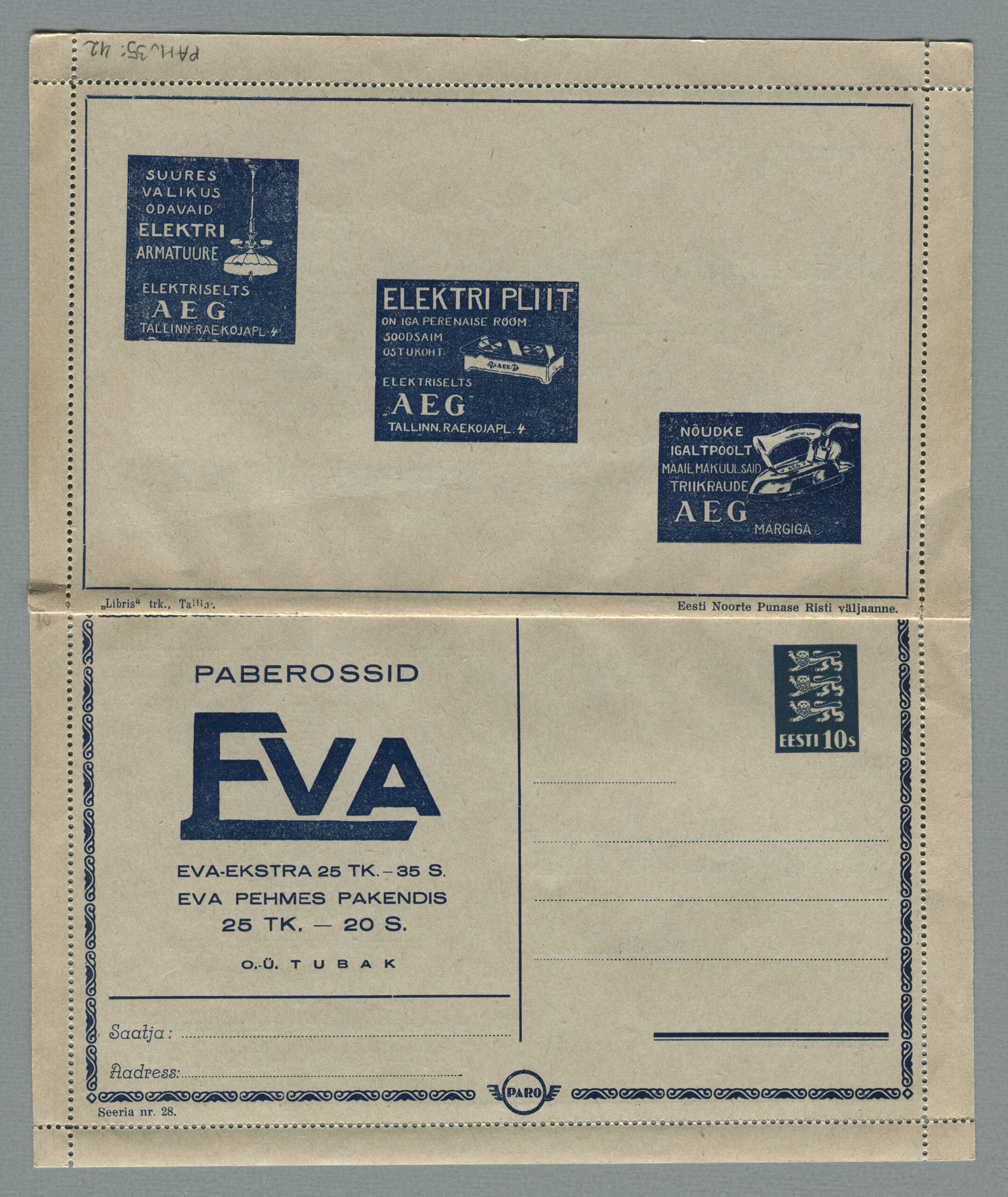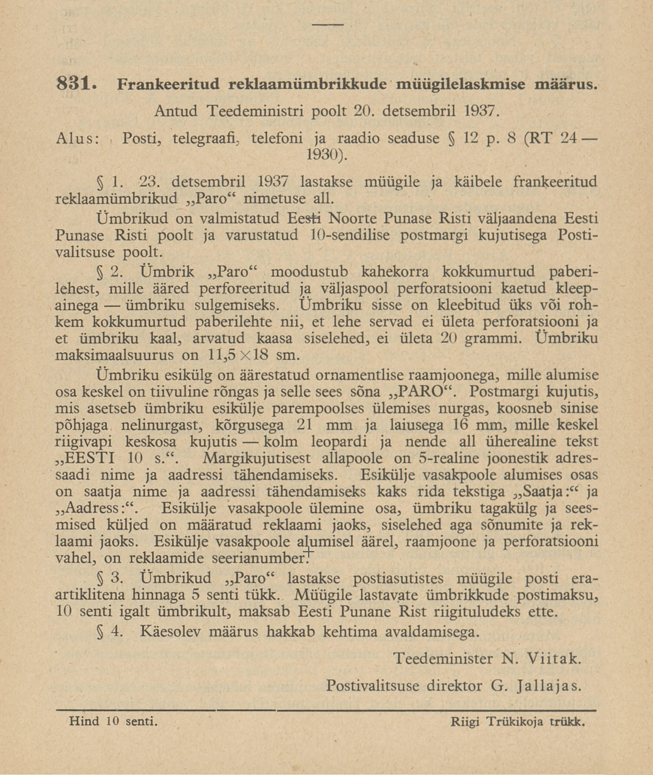 Heidame korra pilgu Paro kaartkirjade taustale. Eesti teedeministri Nikolai Viitaki määrus (Riigi Teataja nr 101, 20.12.1937, lk 1988) ütleb nii: „23. detsembril 1937 lastakse müügile ja käibele frankeeritud reklaamümbrikud Paro nimetuse all. Ümbrikud on valmistatud Eesti Noorte Punase Risti väljaandena Eesti Punase Risti poolt ja varustatud 10-sendilise postmargi kujutusega Postivalitsuse poolt.“