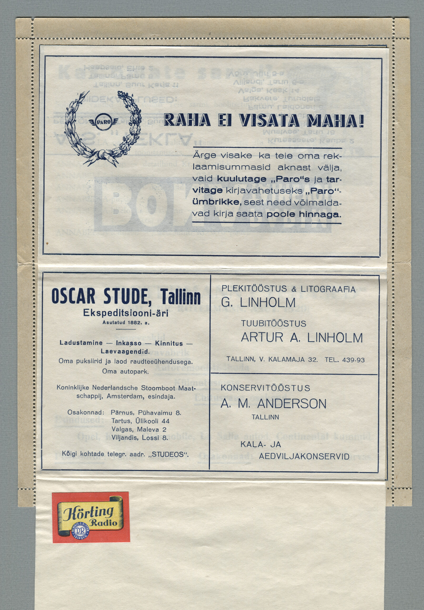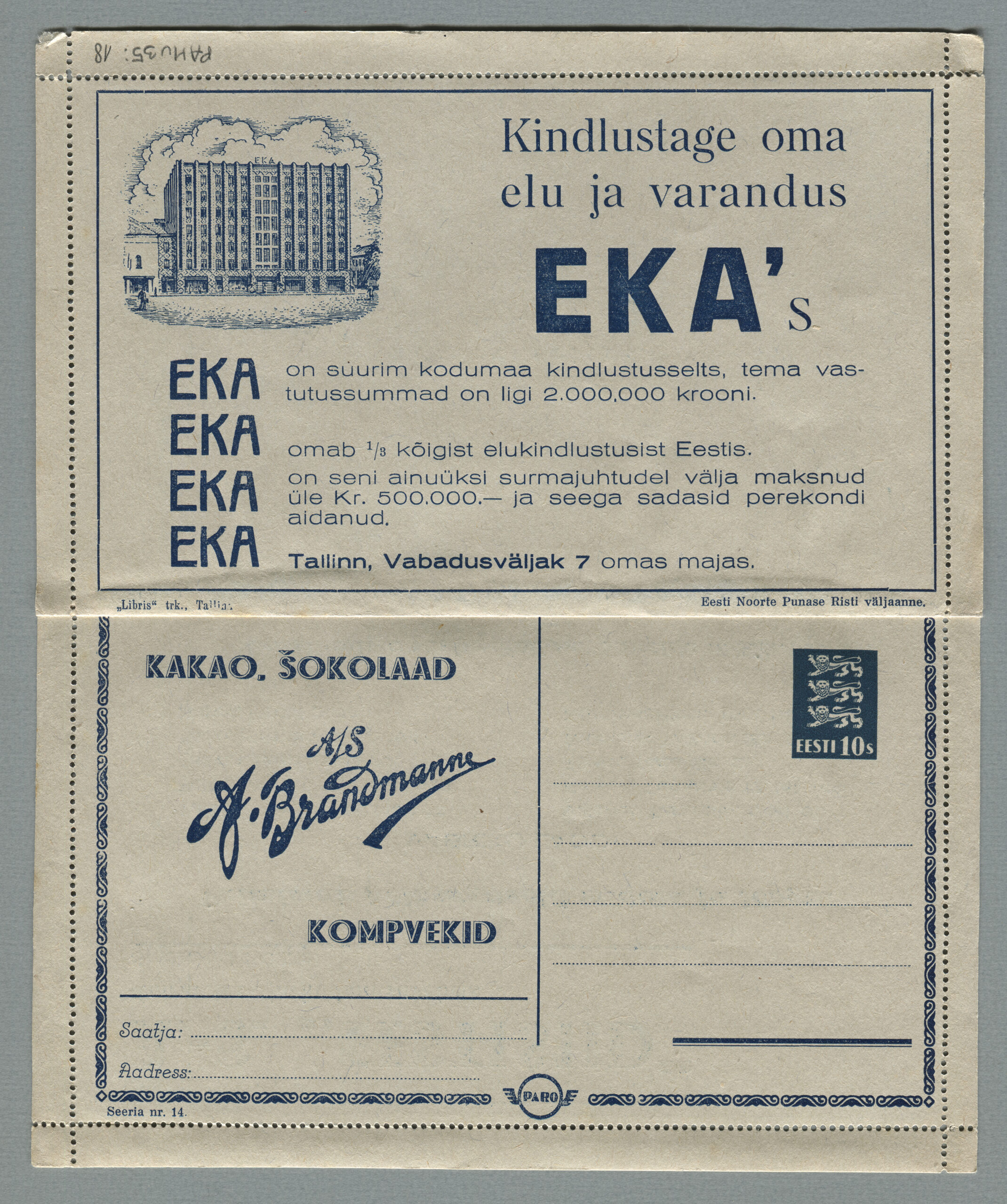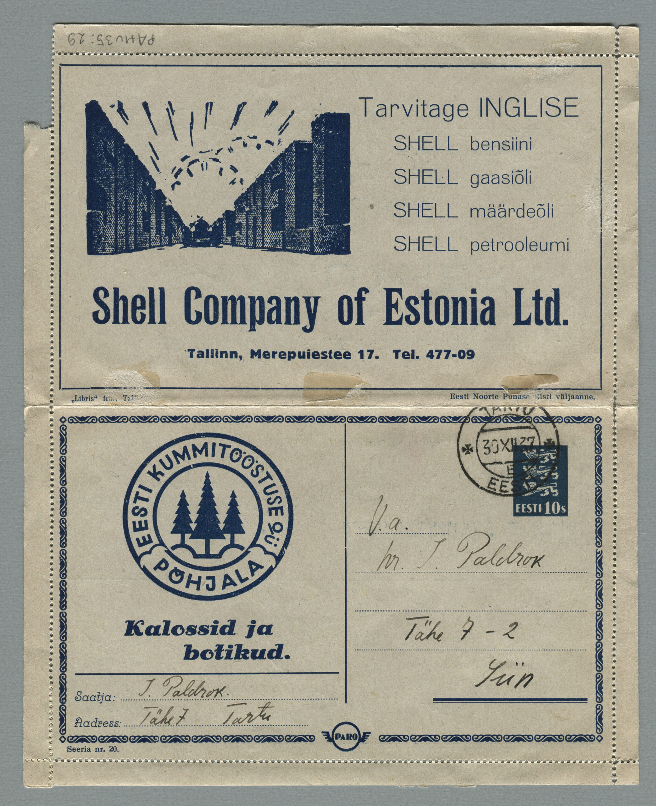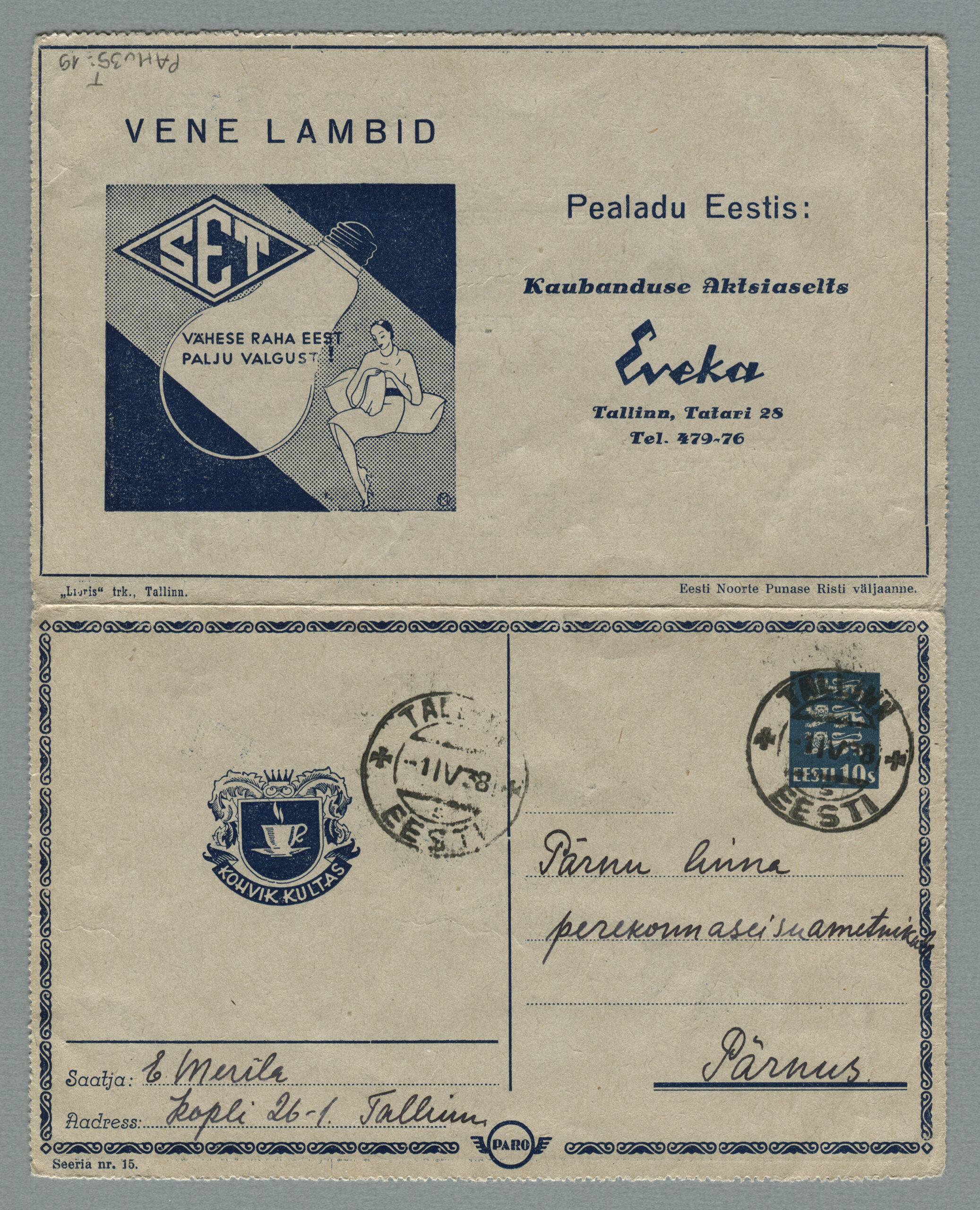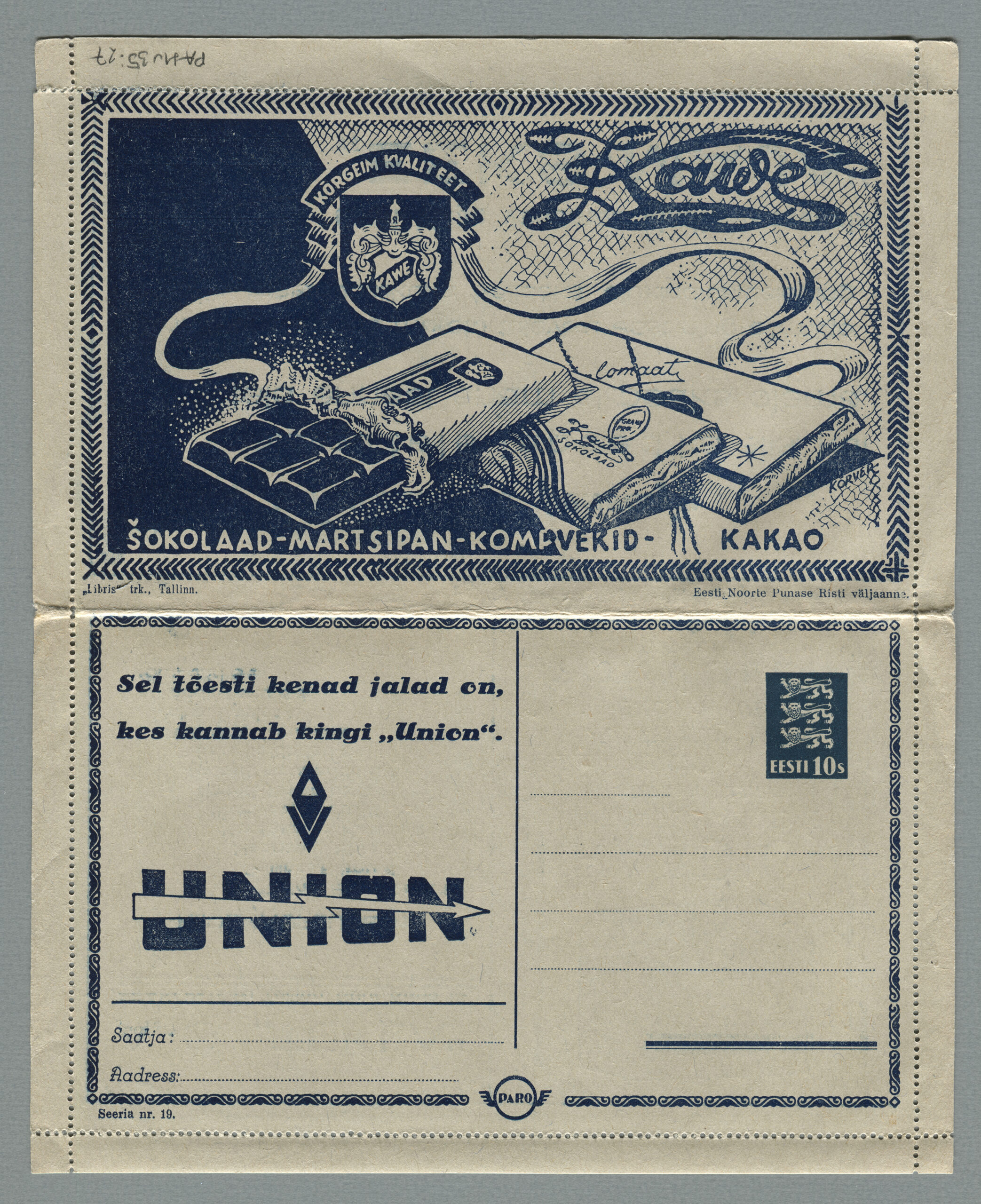 Heidame korra pilgu Paro kaartkirjade taustale. Eesti teedeministri Nikolai Viitaki määrus (Riigi Teataja nr 101, 20.12.1937, lk 1988) ütleb nii: „23. detsembril 1937 lastakse müügile ja käibele frankeeritud reklaamümbrikud Paro nimetuse all. Ümbrikud on valmistatud Eesti Noorte Punase Risti väljaandena Eesti Punase Risti poolt ja varustatud 10-sendilise postmargi kujutusega Postivalitsuse poolt.“