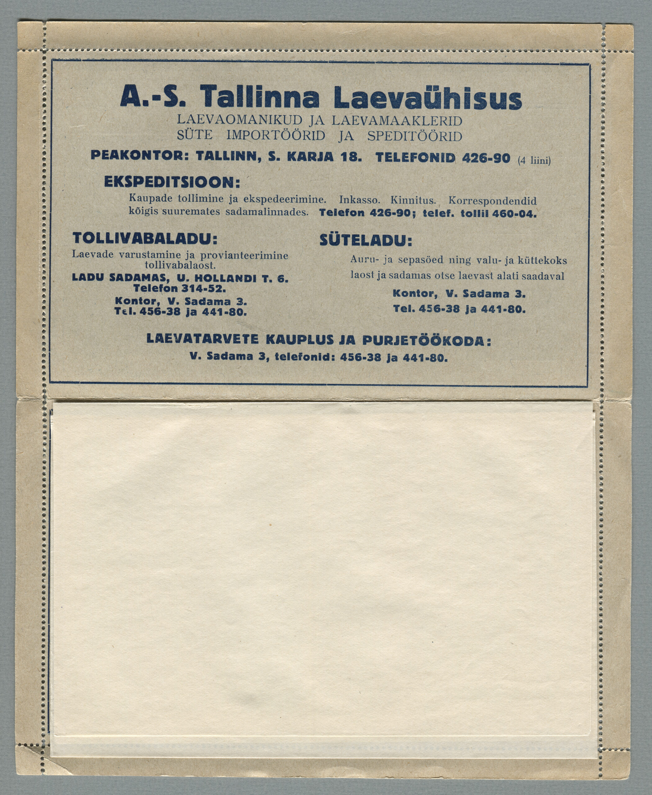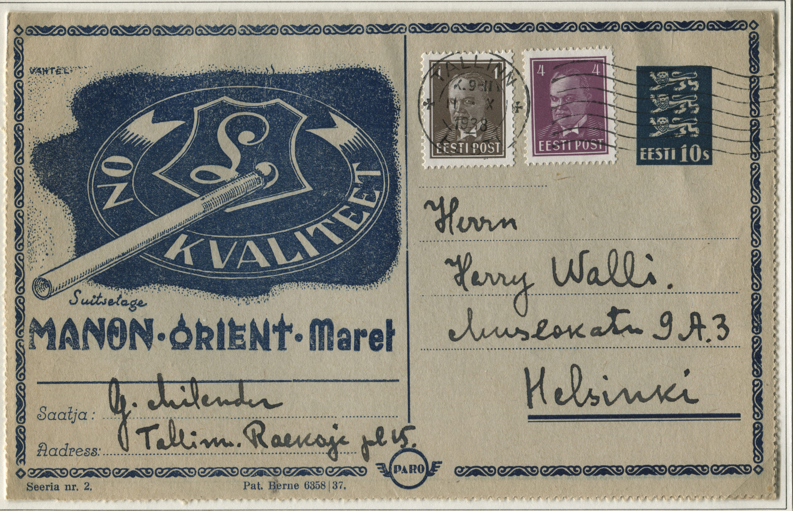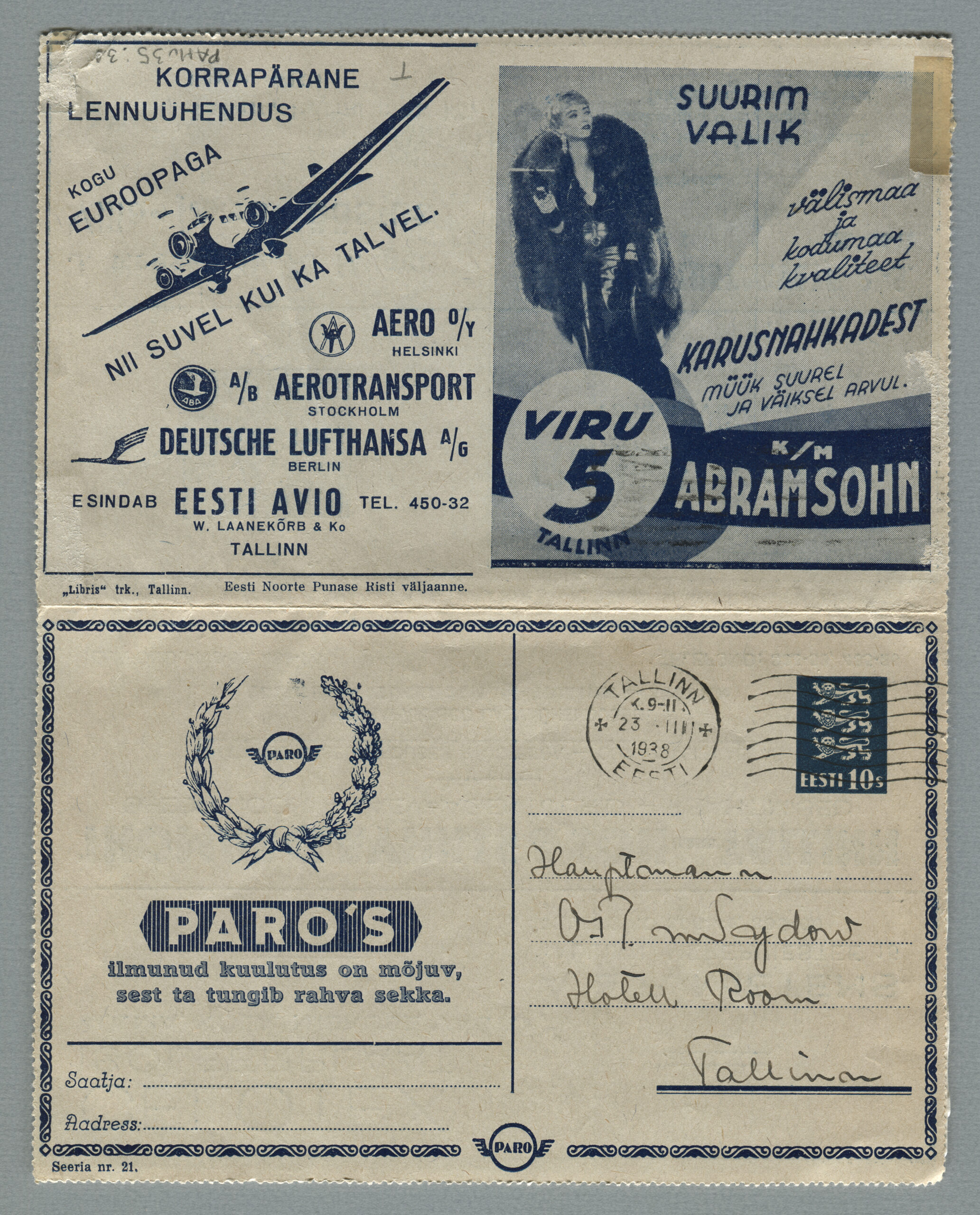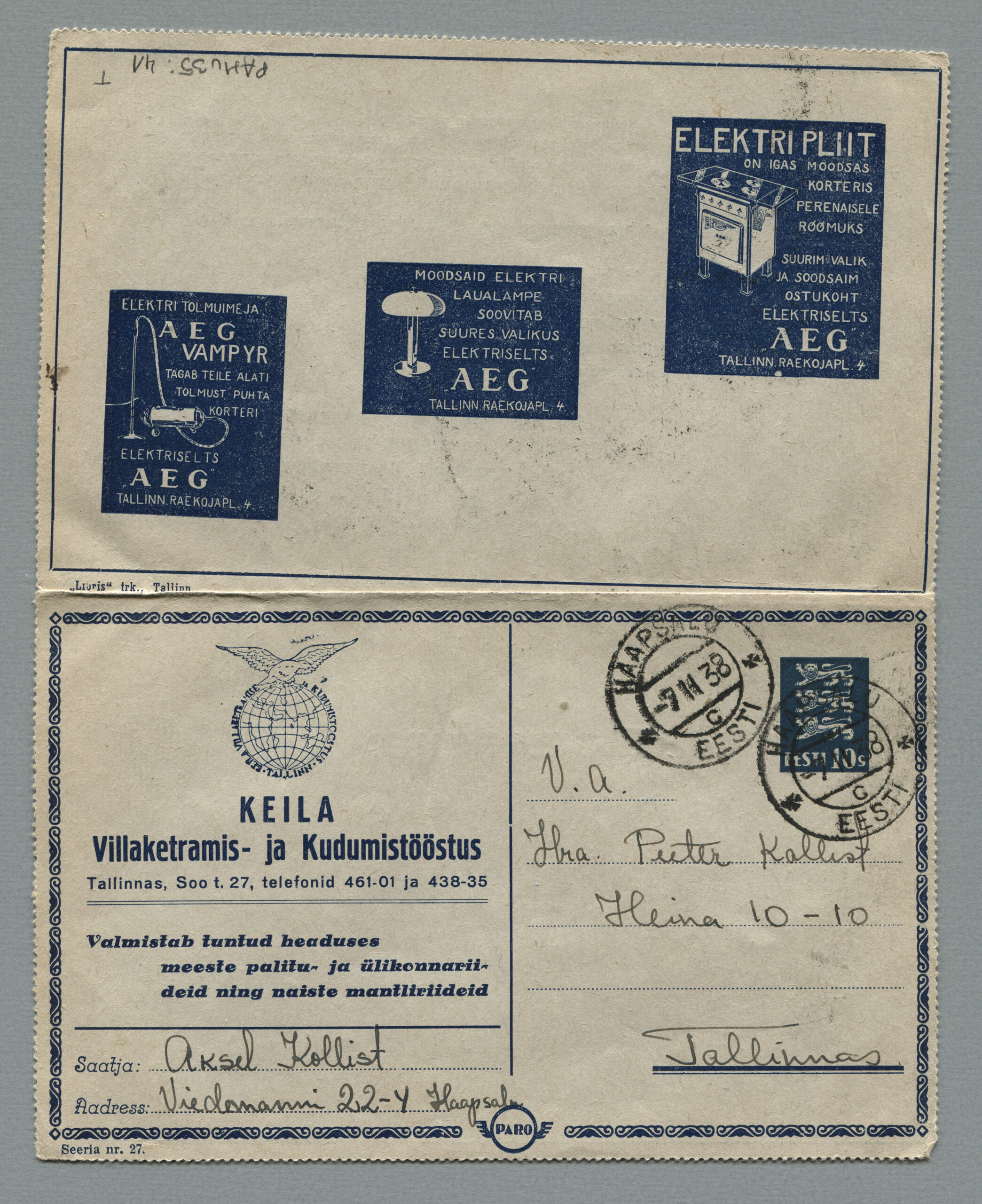 ERMi koguKaartkiri (seeria nr 2), mis on saadetud 11.10.1938 Tallinnast Helsingisse