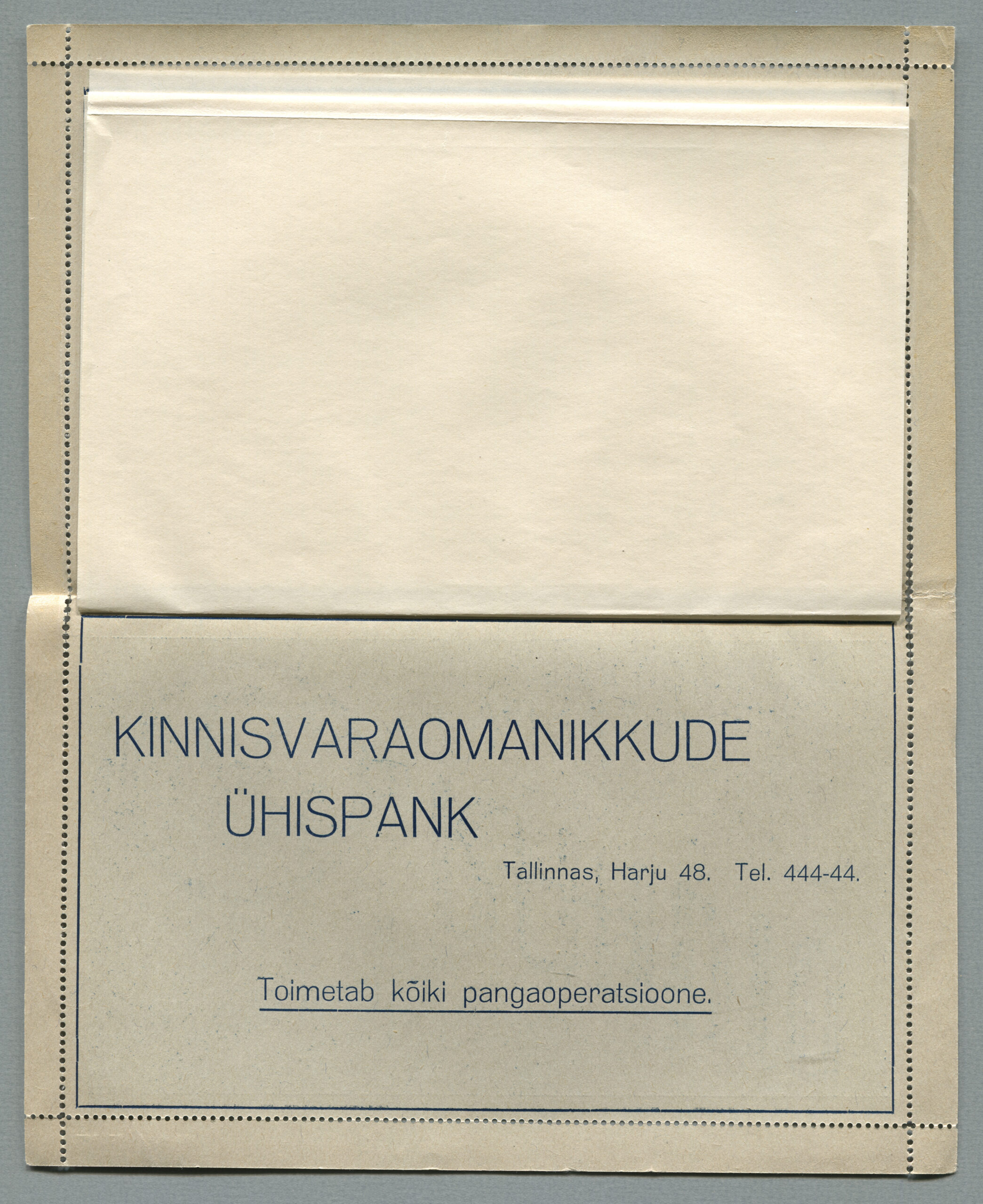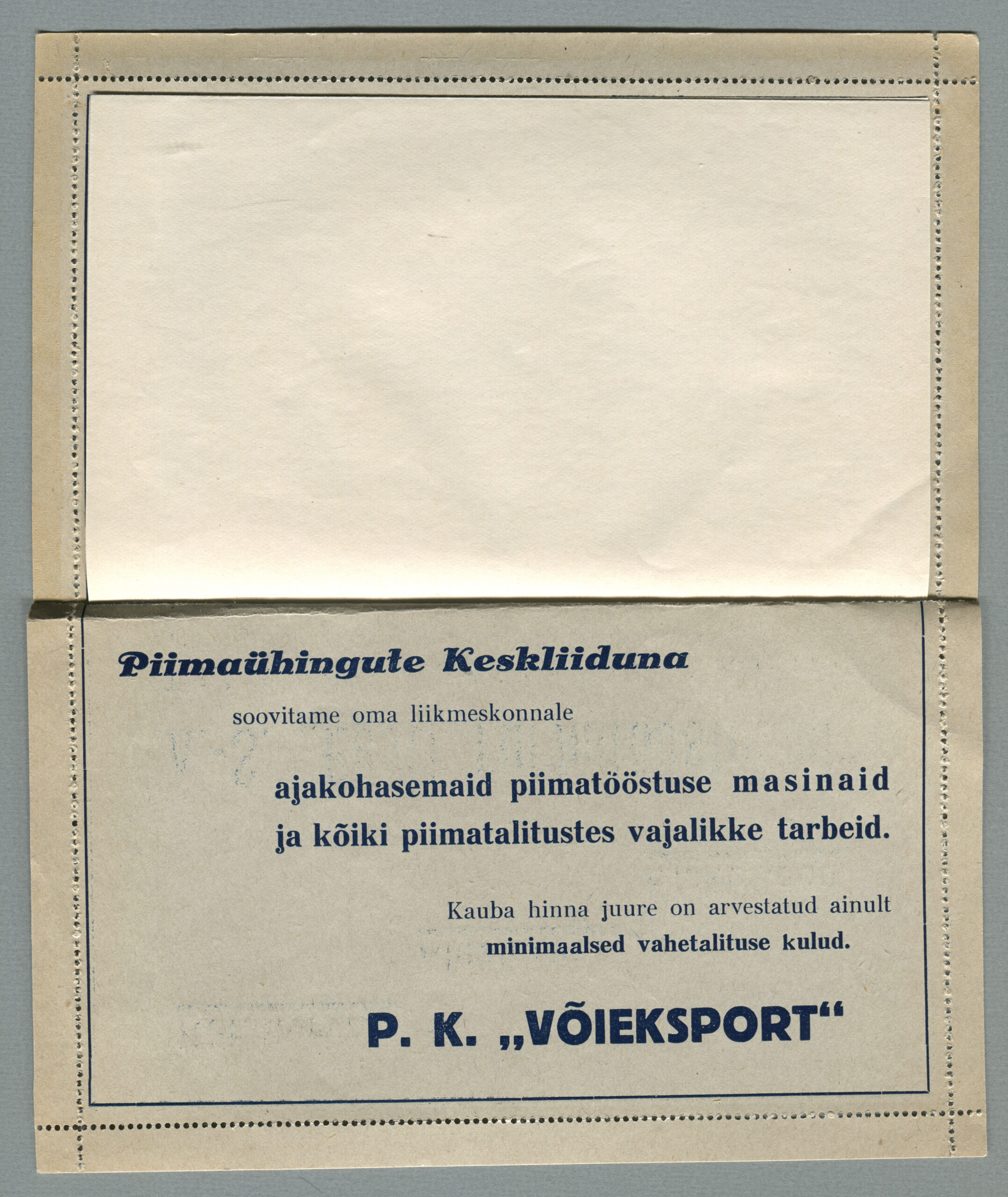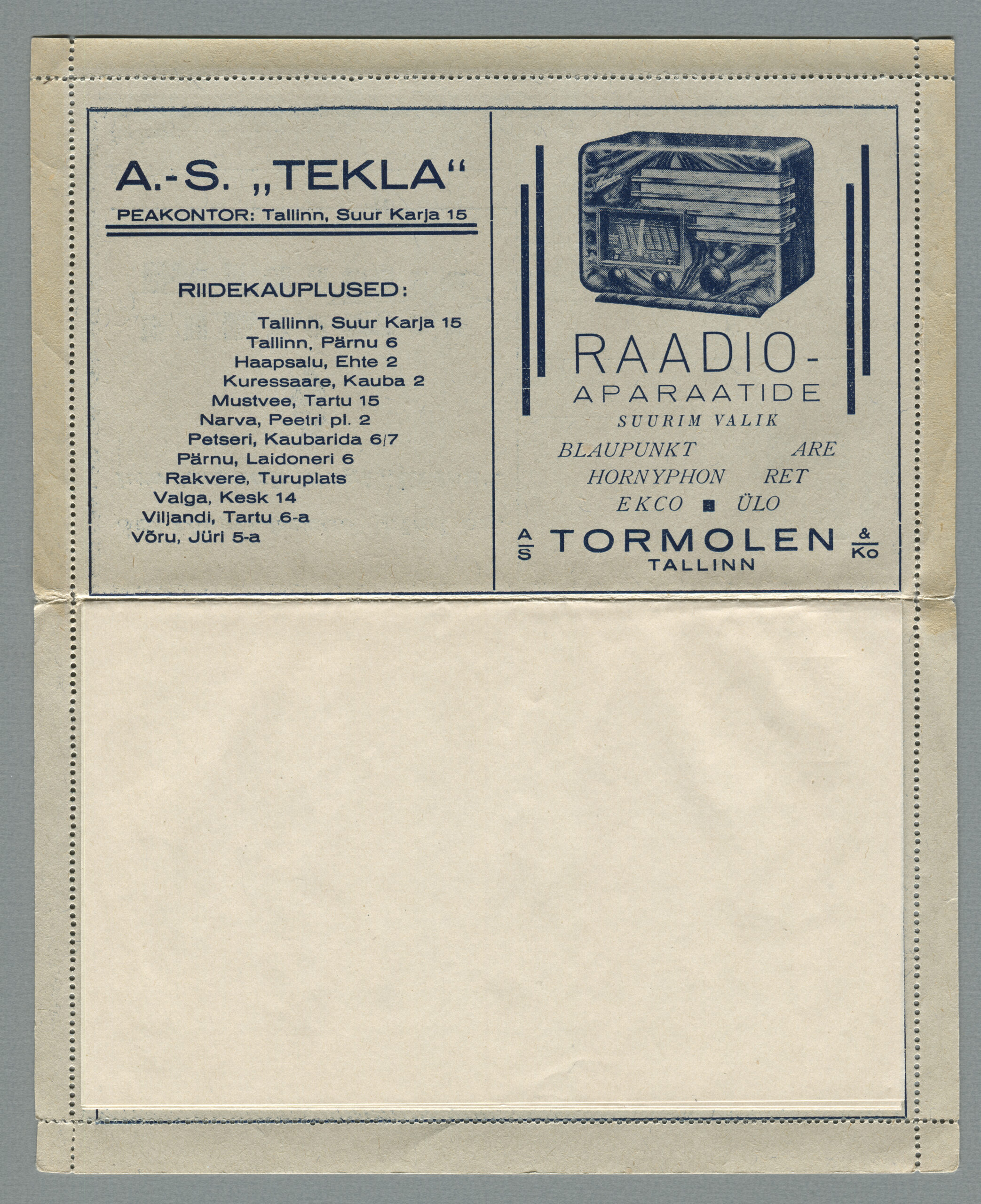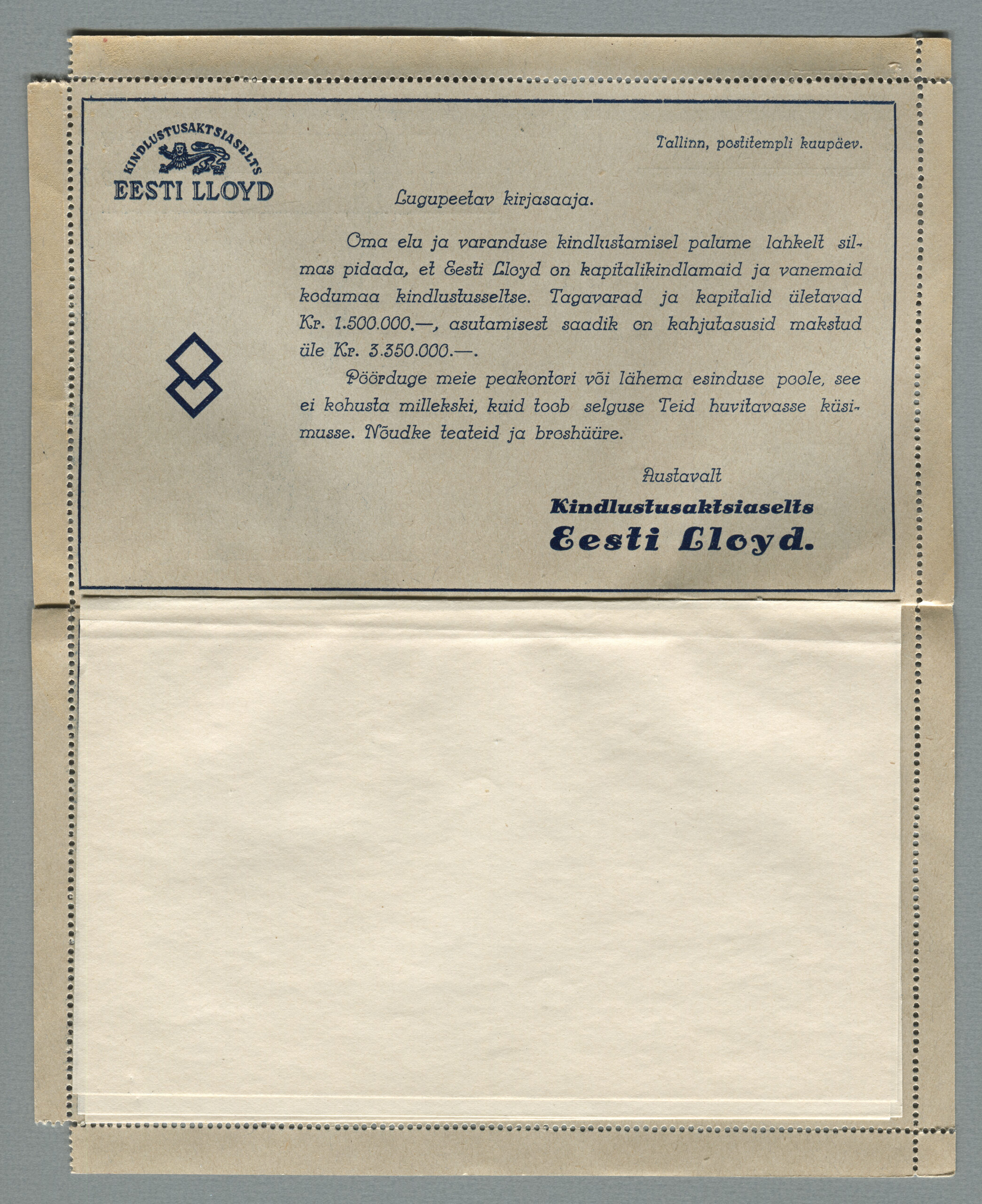 ERMi koguKaartkiri (seeria nr 2), mis on saadetud 11.10.1938 Tallinnast Helsingisse