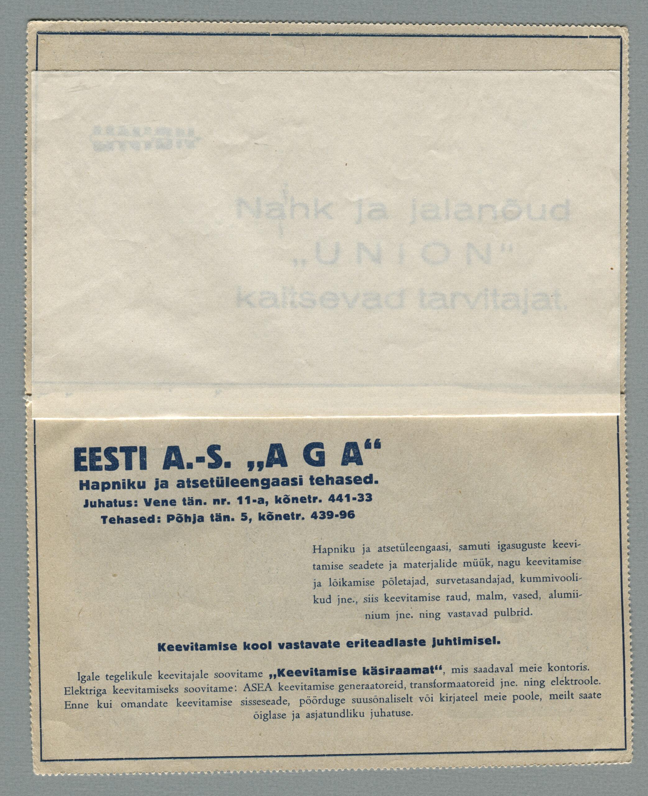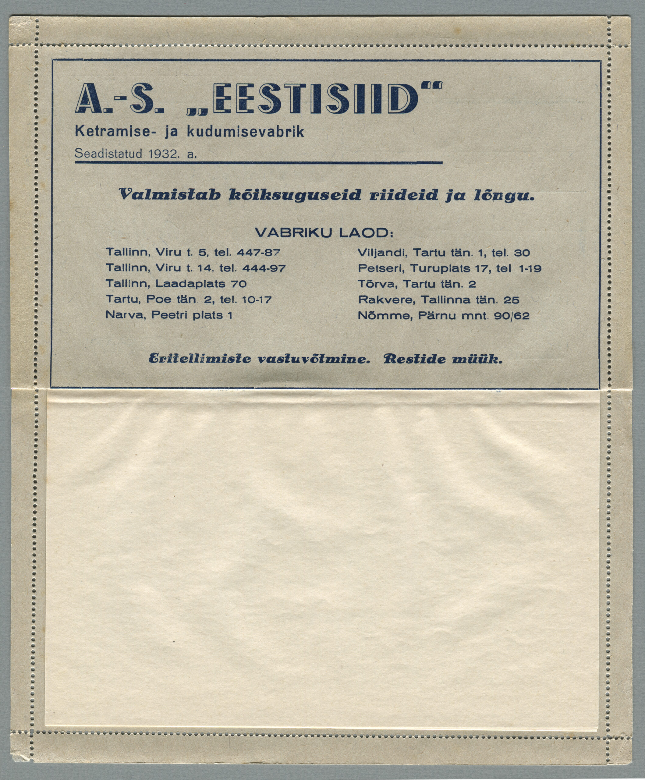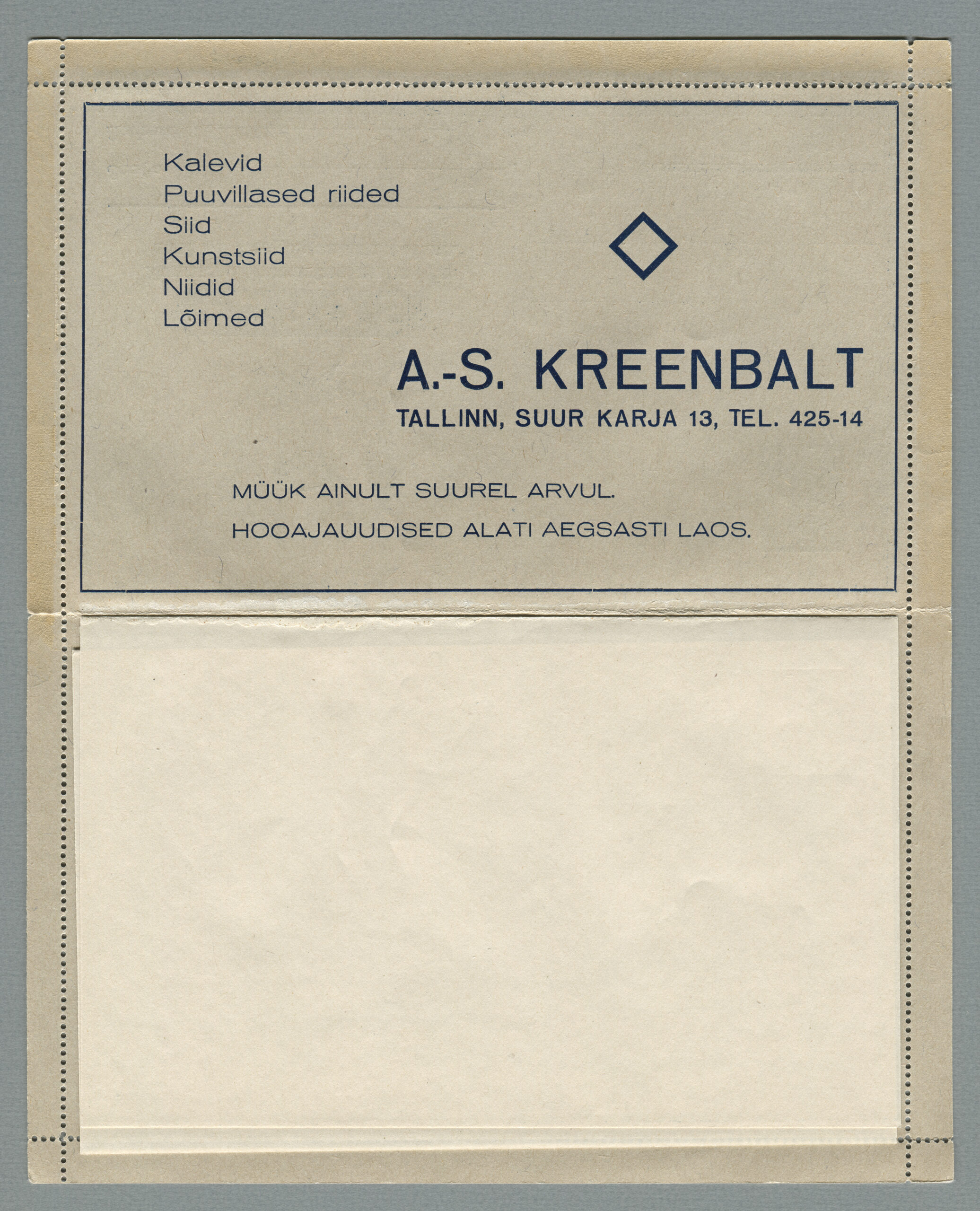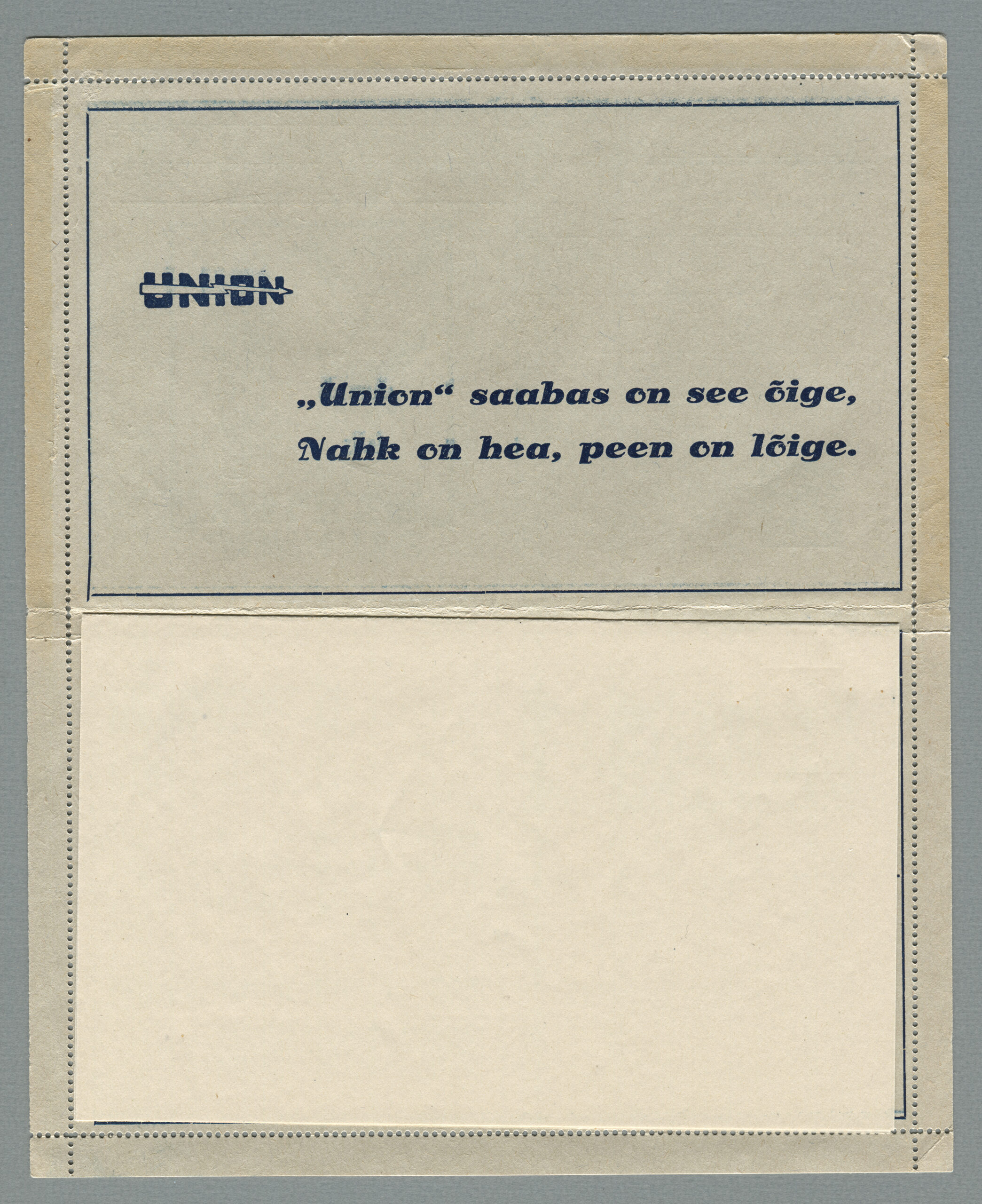 ERMi koguKaartkiri (seeria nr 2), mis on saadetud 11.10.1938 Tallinnast Helsingisse