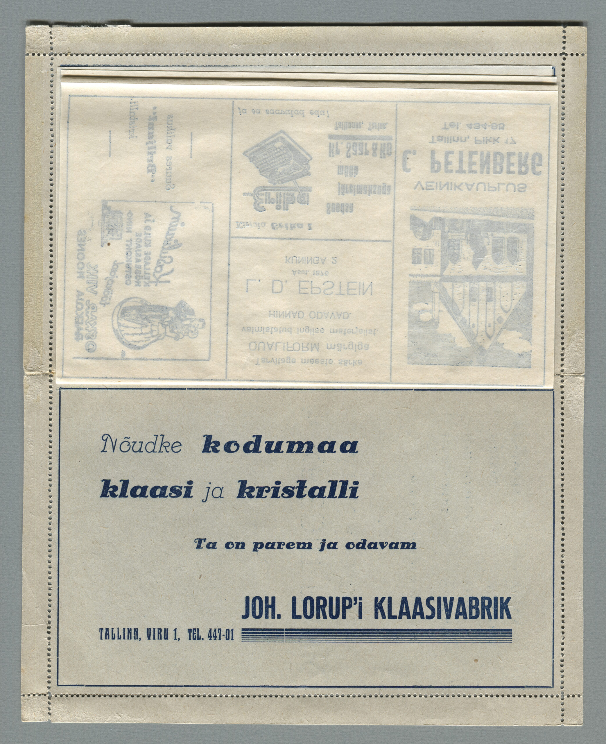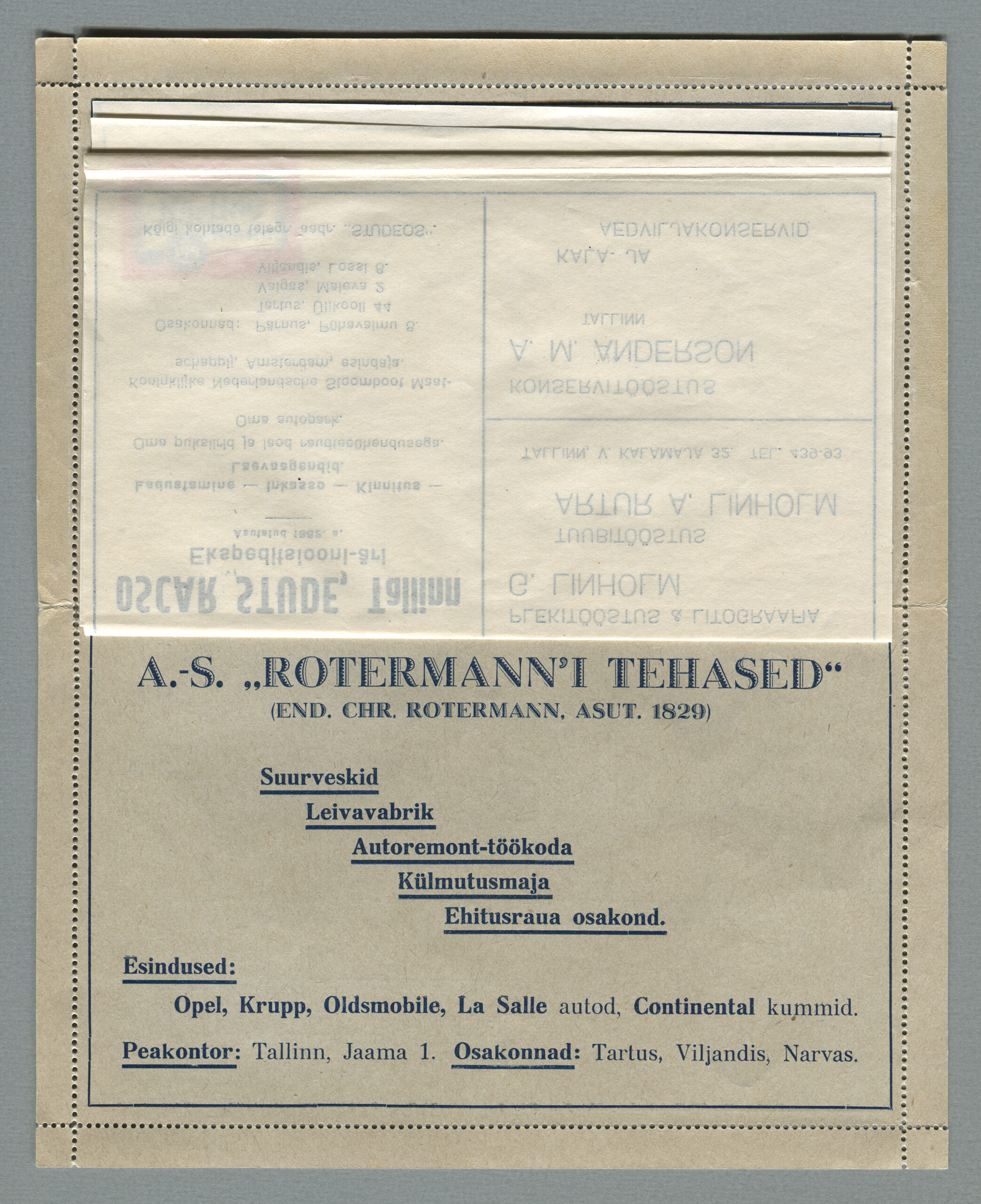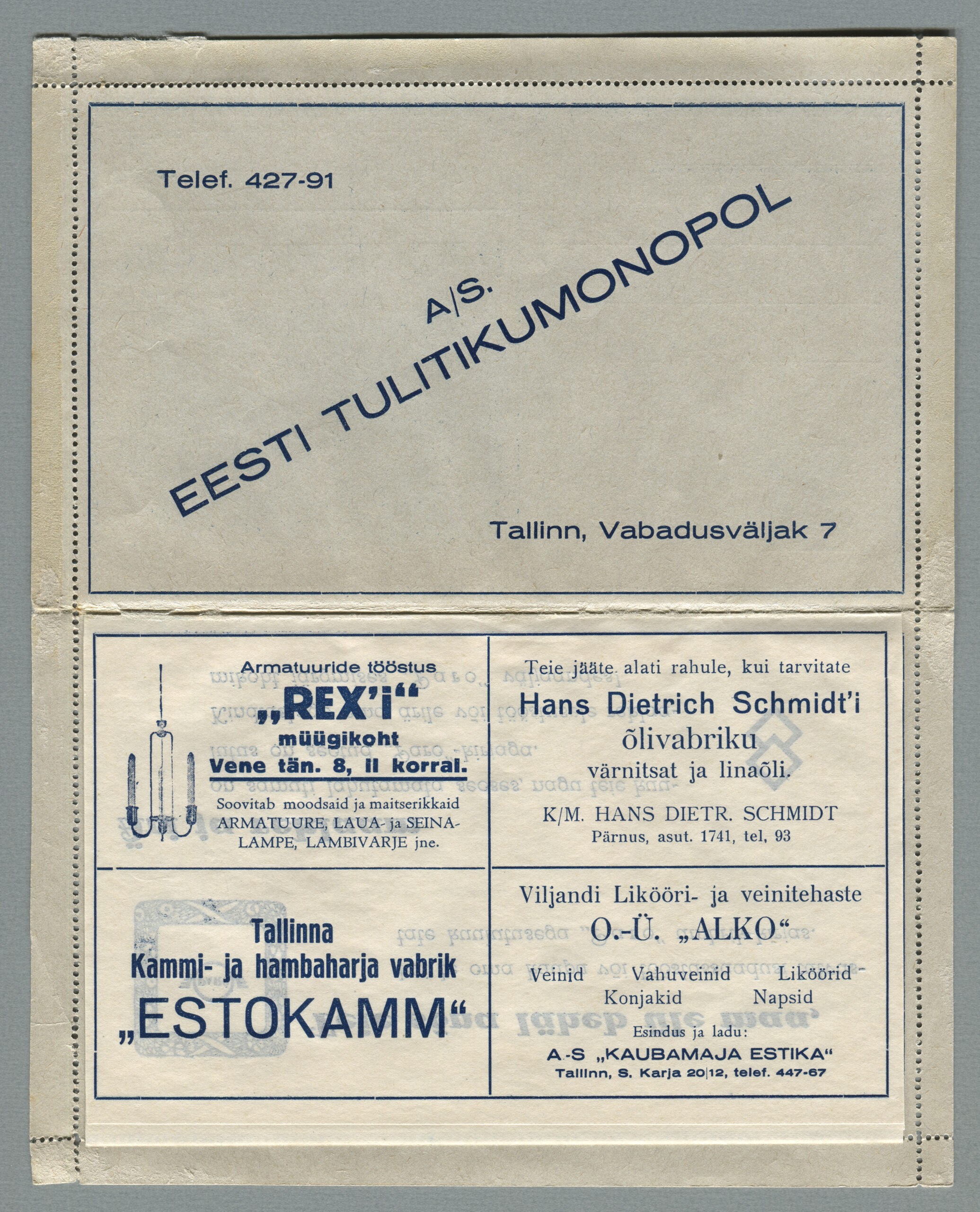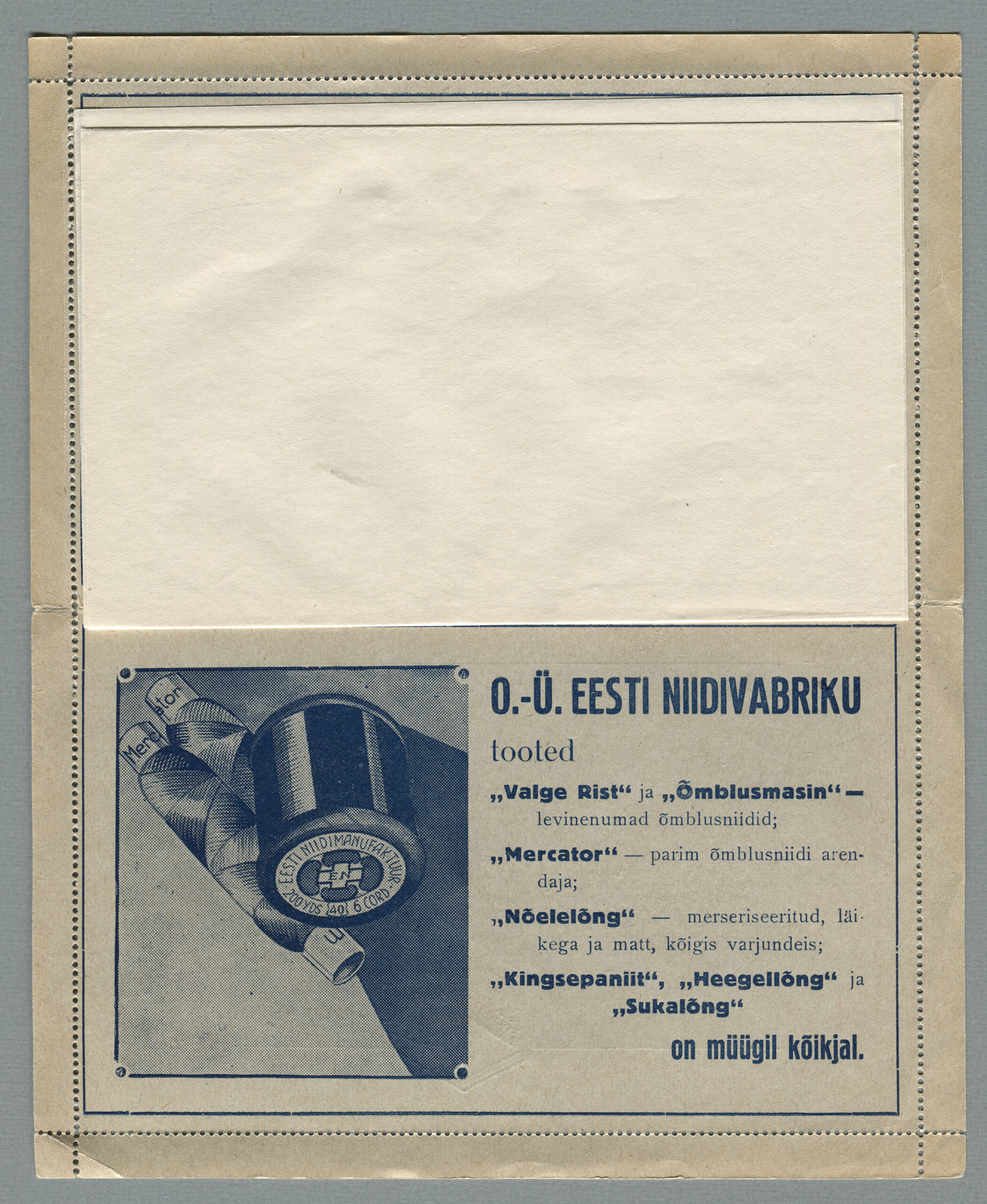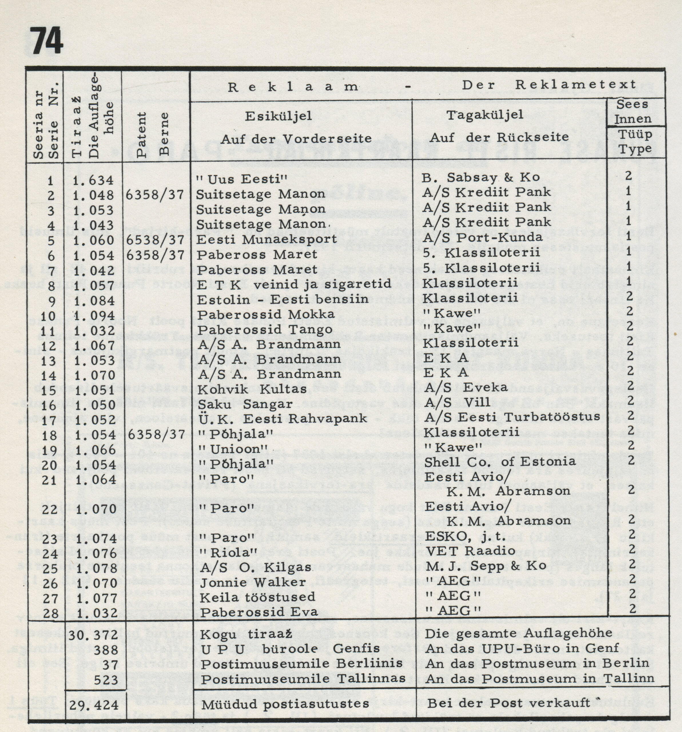 Ideena polnud reklaamiga varustatud tervikasjad tegelikult midagi uut. On teada, et neid esines Tsaari-Venemaal, ka mujal. Mõnel kaartkirja seerial (nr 2, 5, 6, 18) on märgitud Pat. Berne 6538/37, millest võib järeldada, et idee oli patenteeritud.