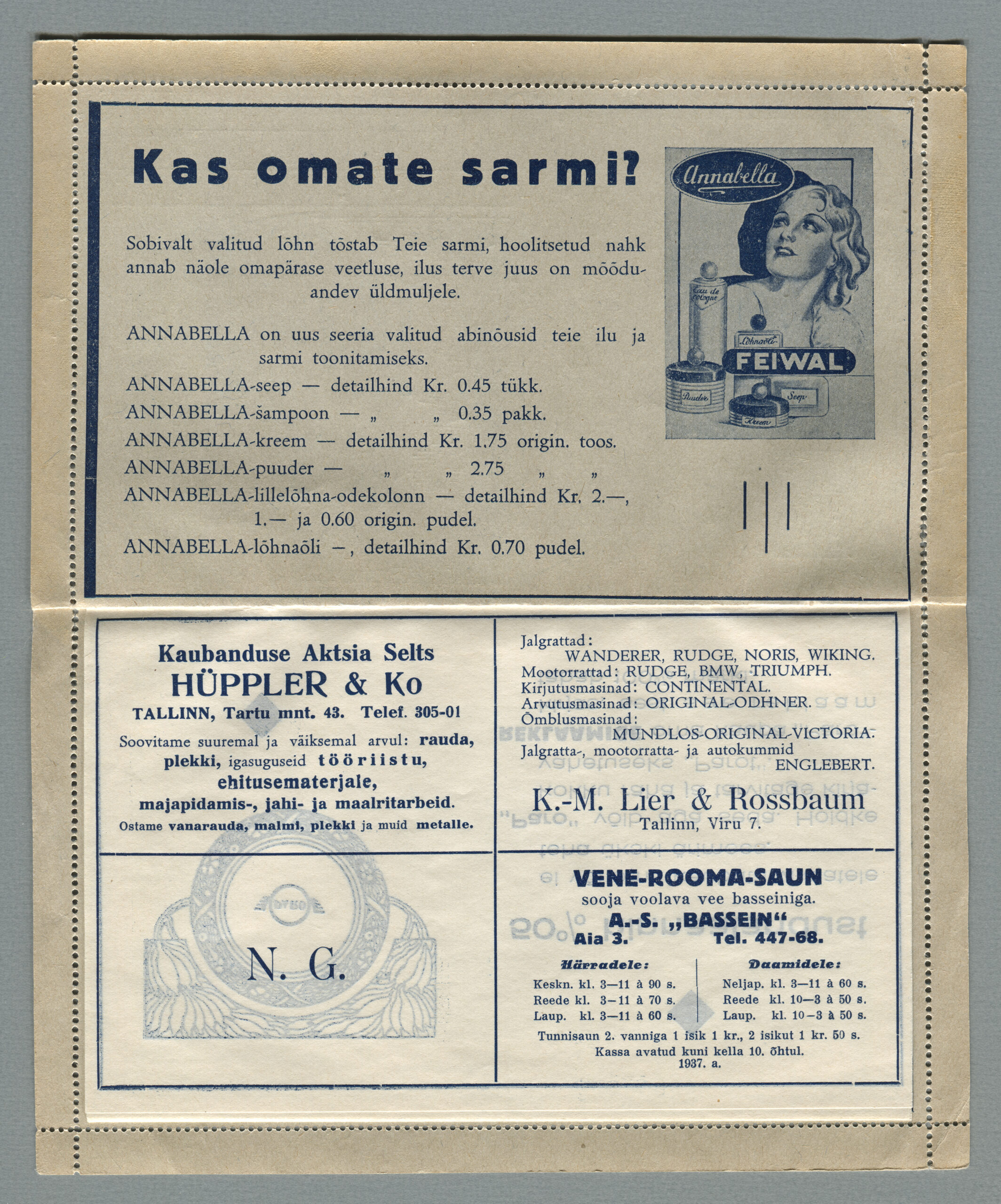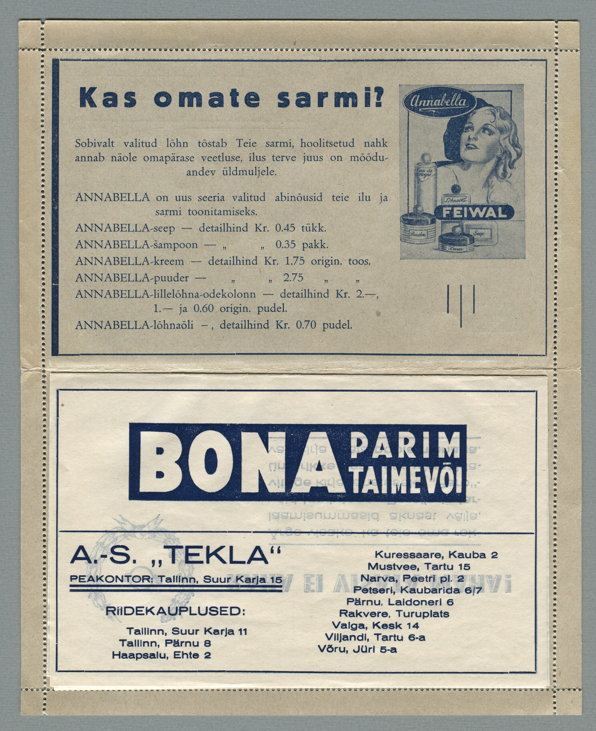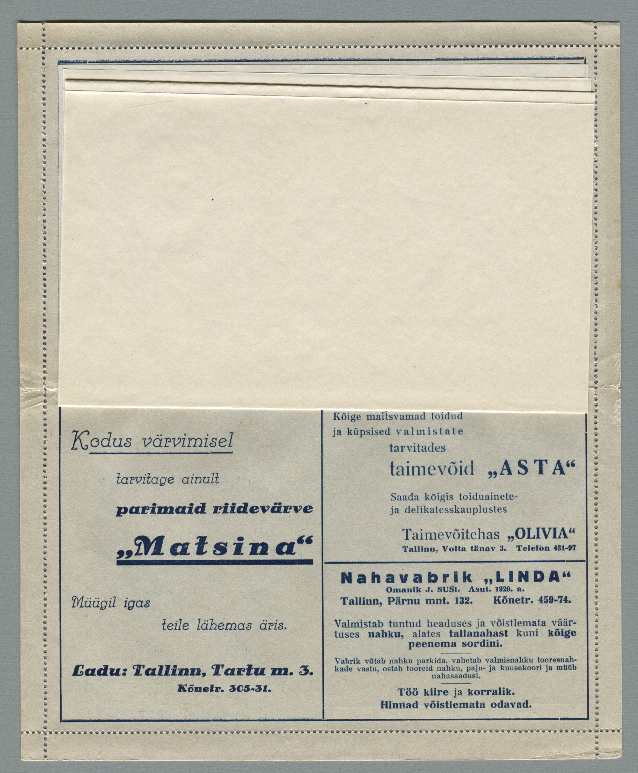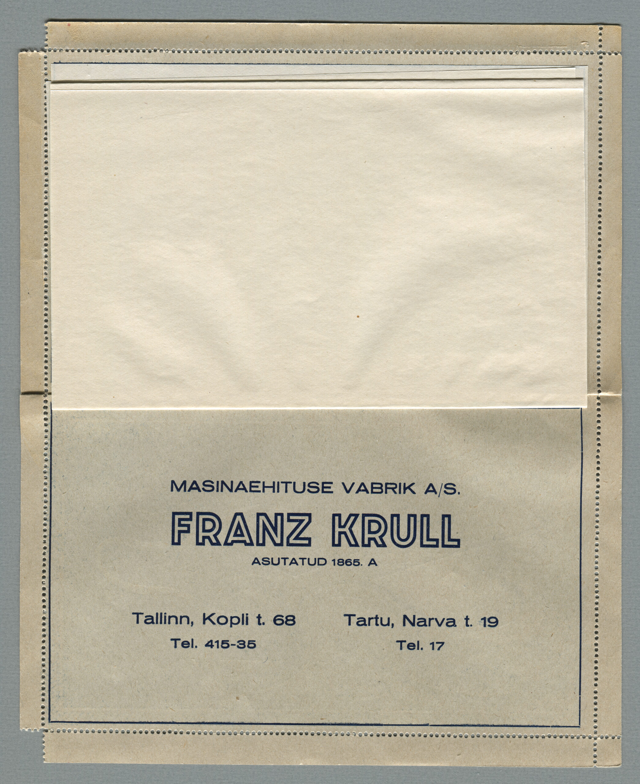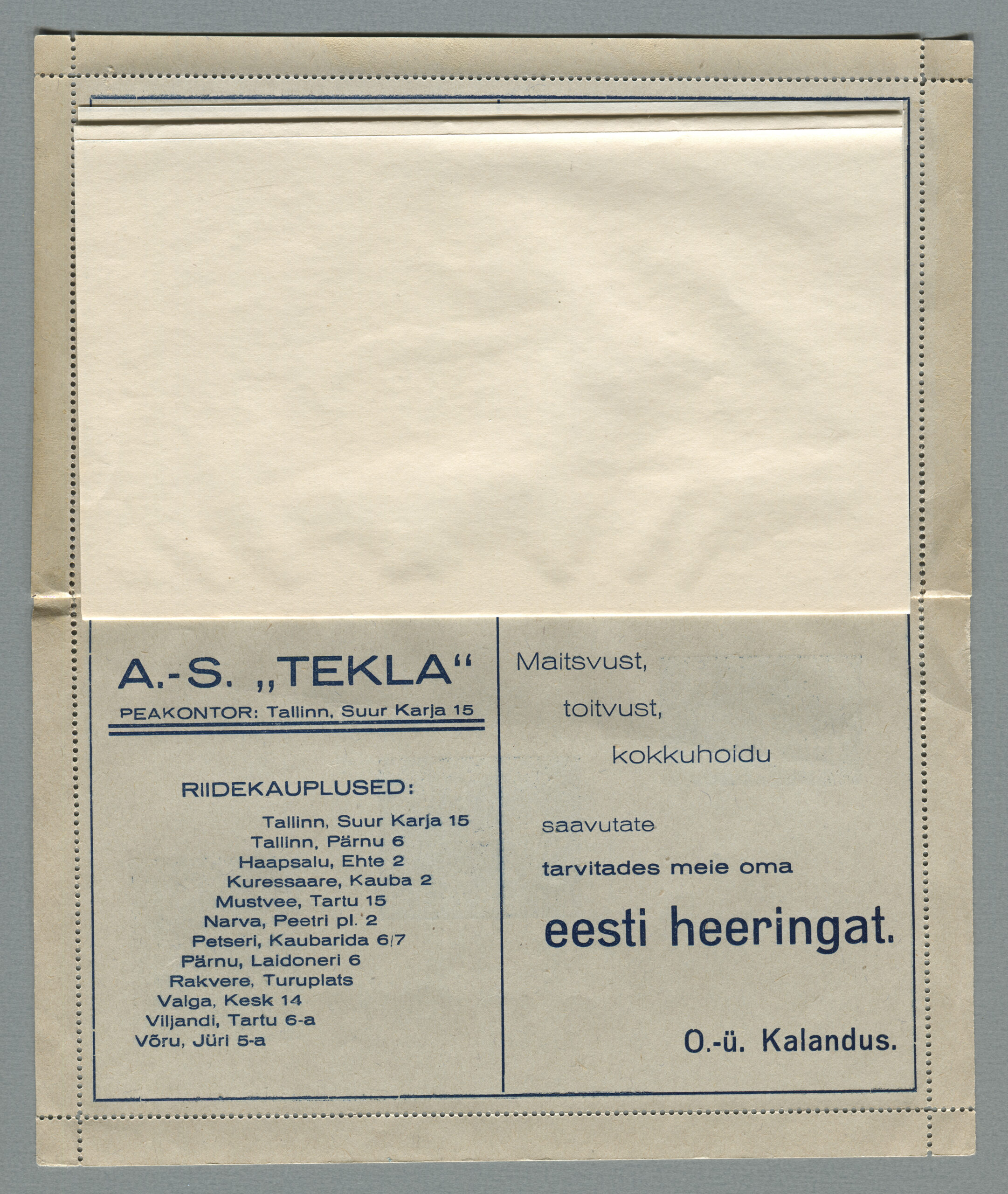 Ideena polnud reklaamiga varustatud tervikasjad tegelikult midagi uut. On teada, et neid esines Tsaari-Venemaal, ka mujal. Mõnel kaartkirja seerial (nr 2, 5, 6, 18) on märgitud Pat. Berne 6538/37, millest võib järeldada, et idee oli patenteeritud.
