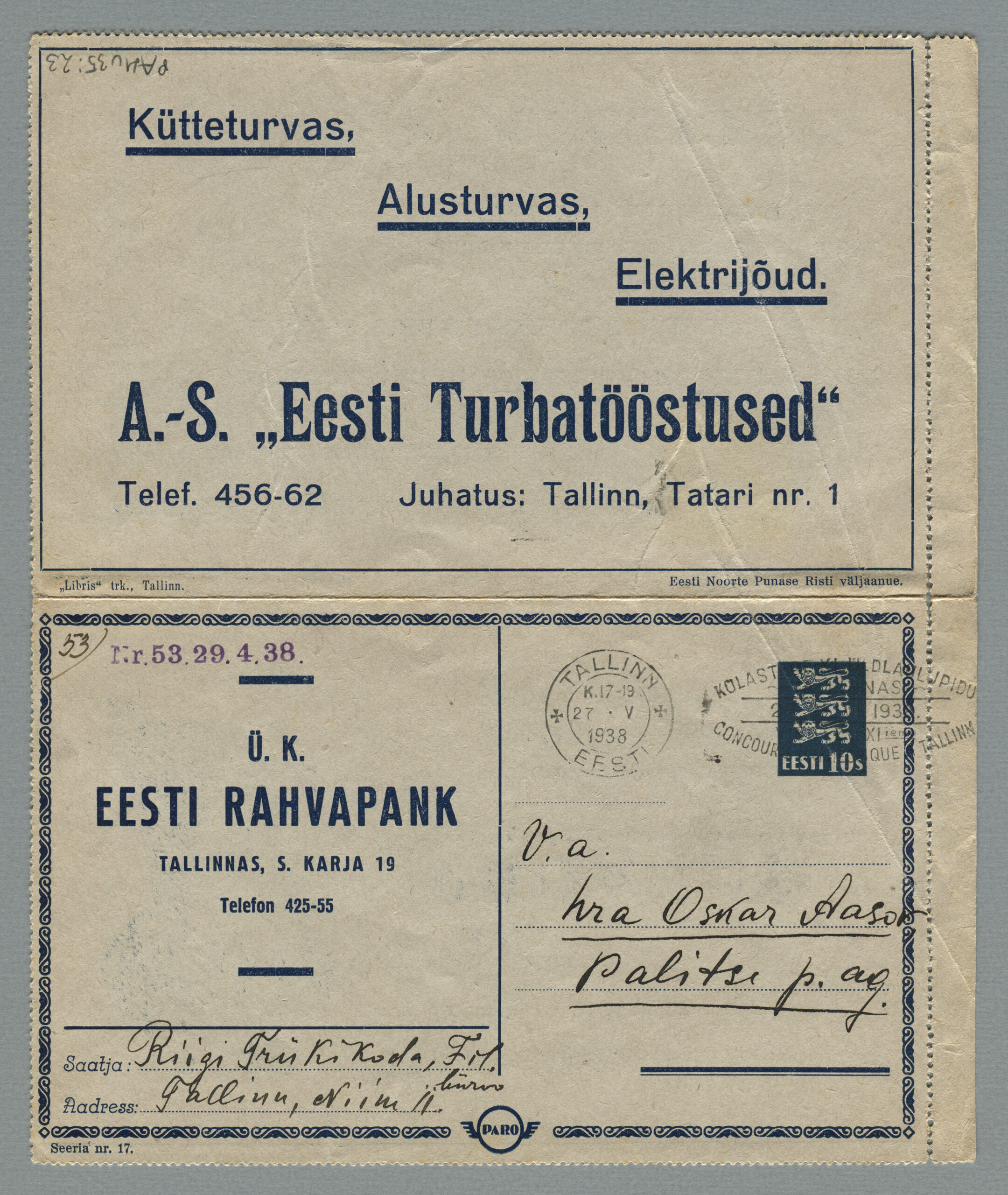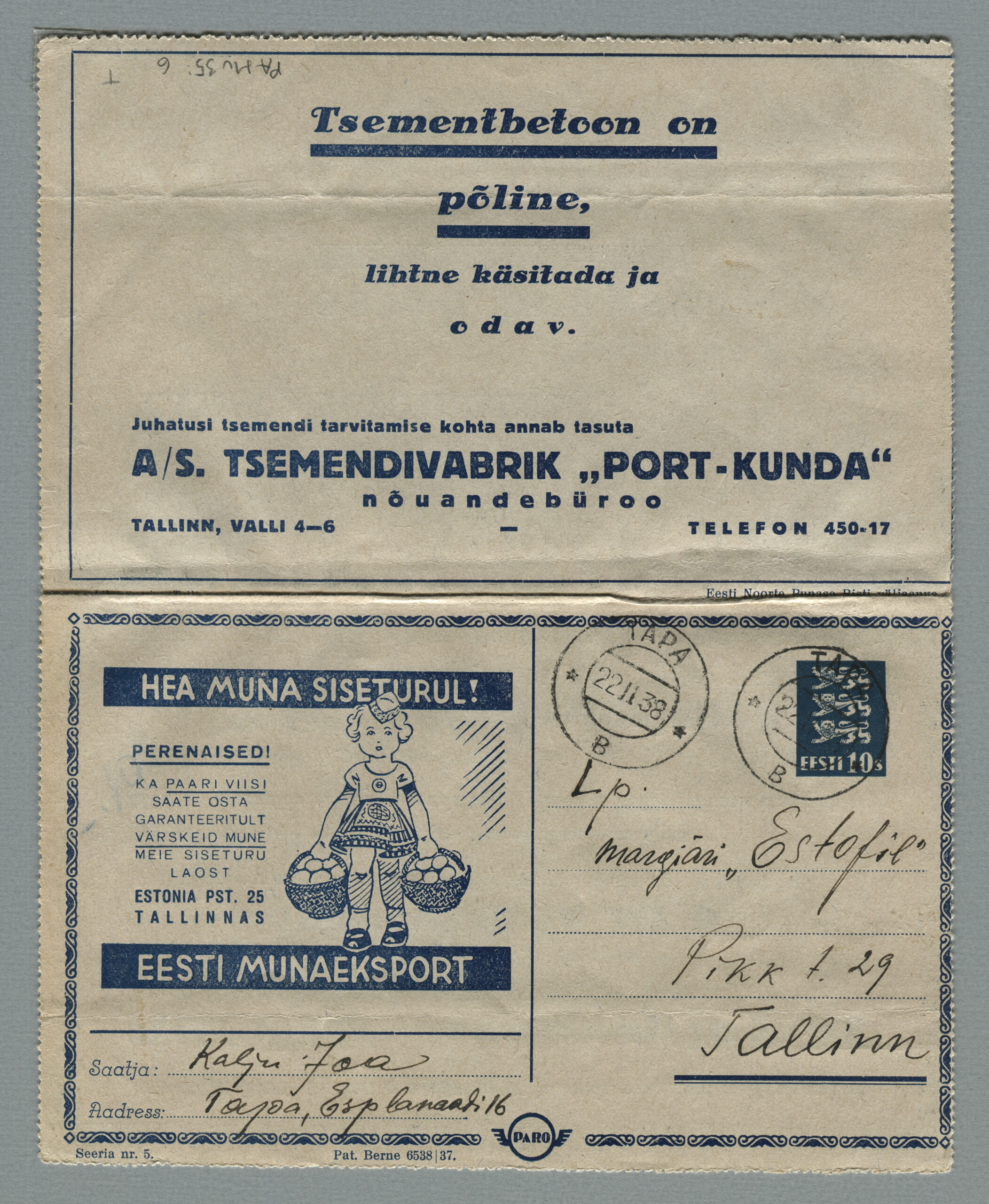 ERMi koguKaartkiri (seeria nr 5), mis on saadetud 22.11.1938 Tapalt Tallinna margiärile „Estofil“