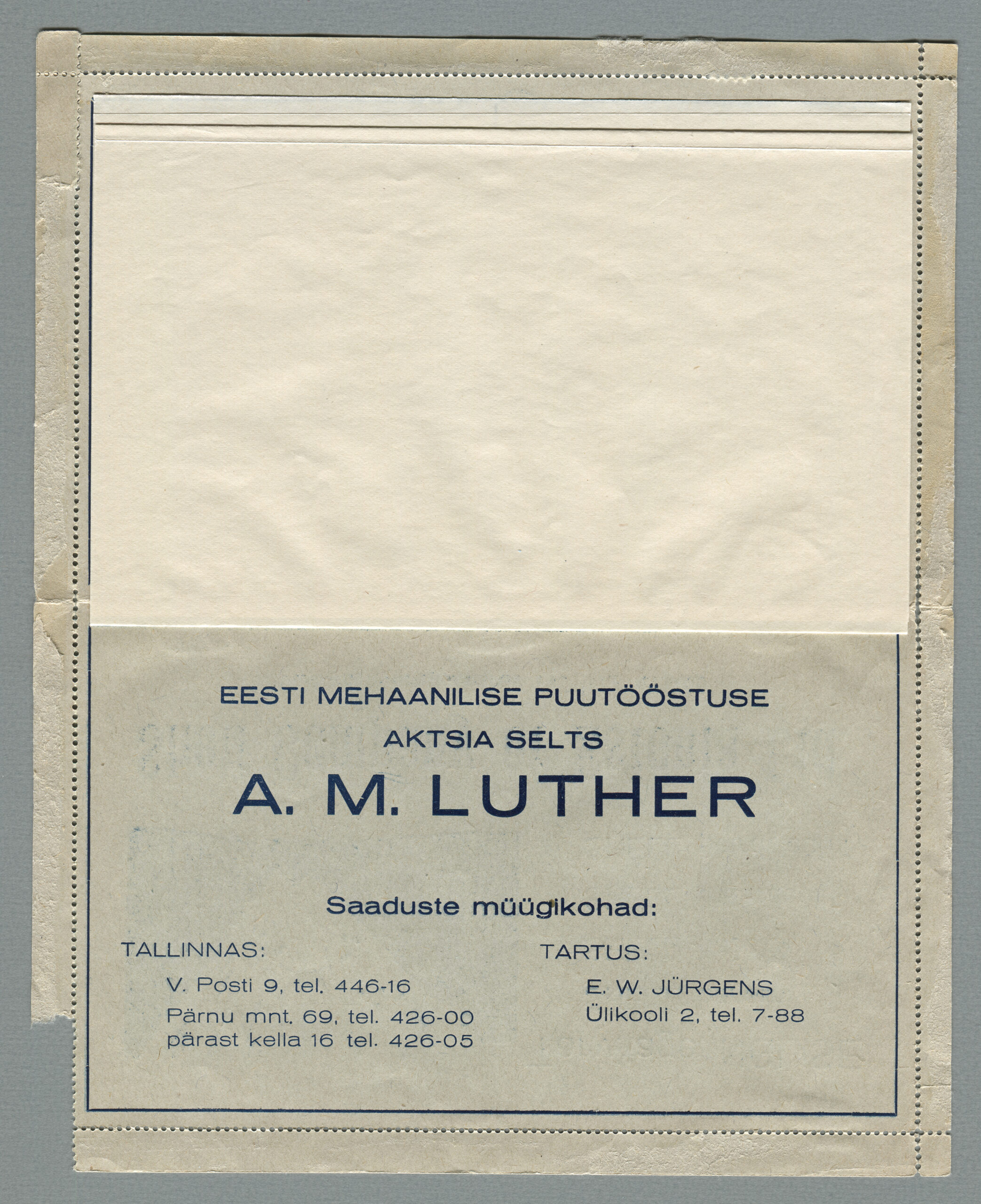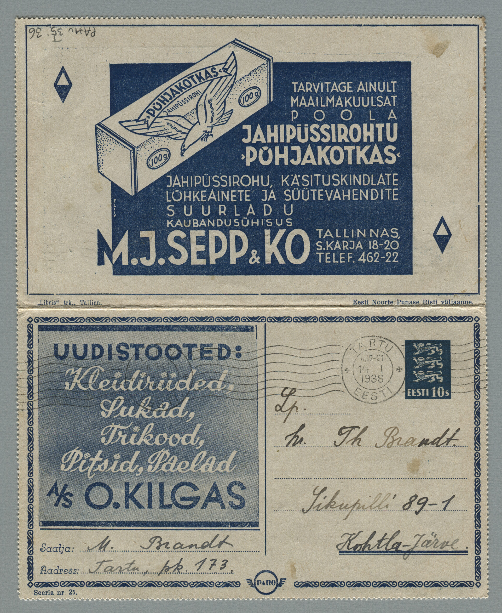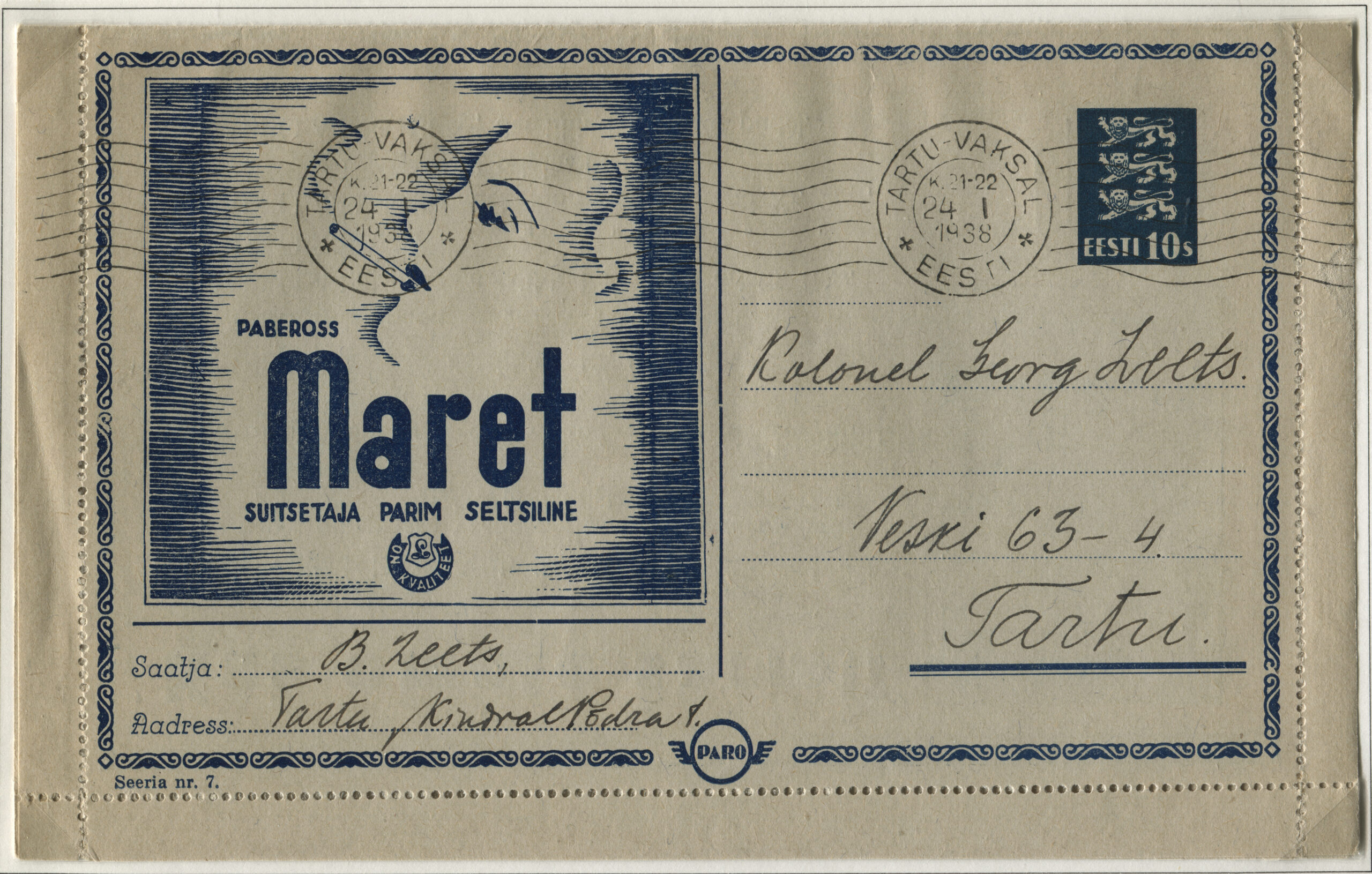 ERMi koguKaartkiri (seeria nr 7), mis on saadetud Tartusse 24.01.1938