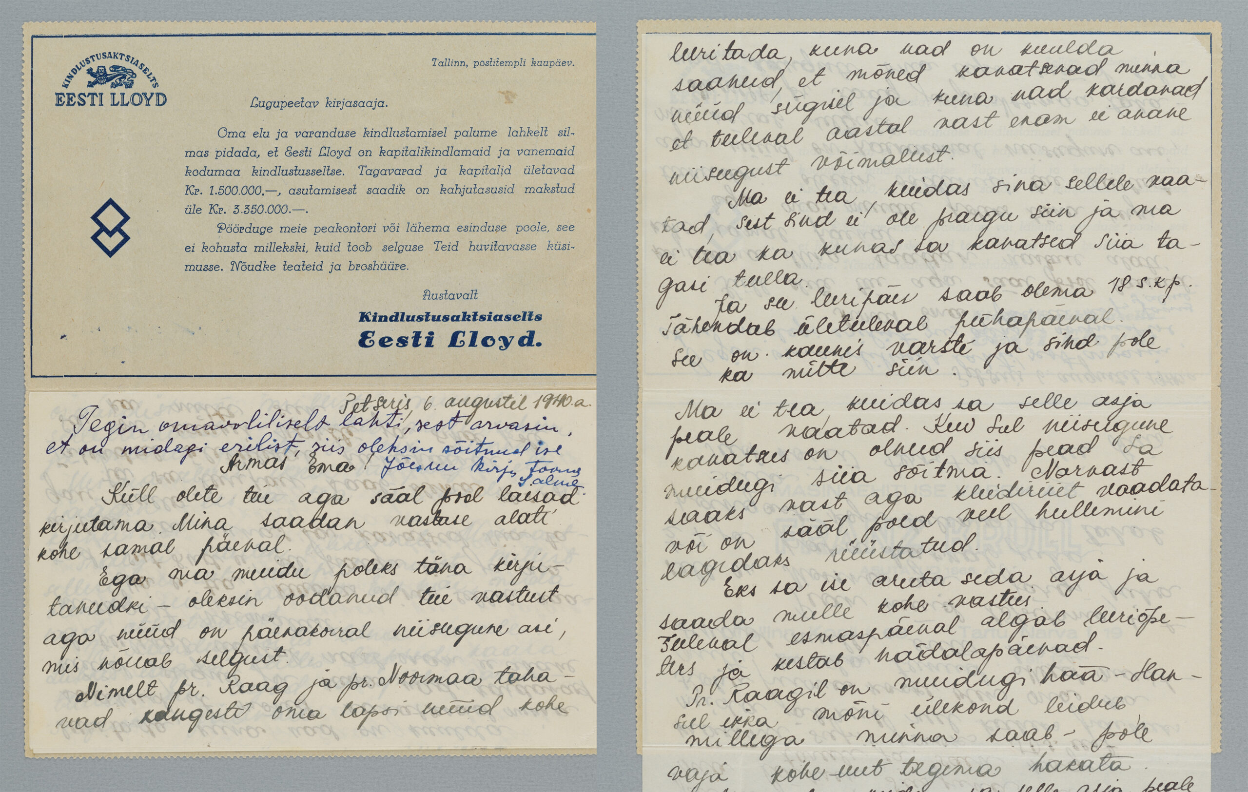 ERMi koguKaartkiri (seeria nr 11), mis on saadetud 6.08.1940 Petserist Narva