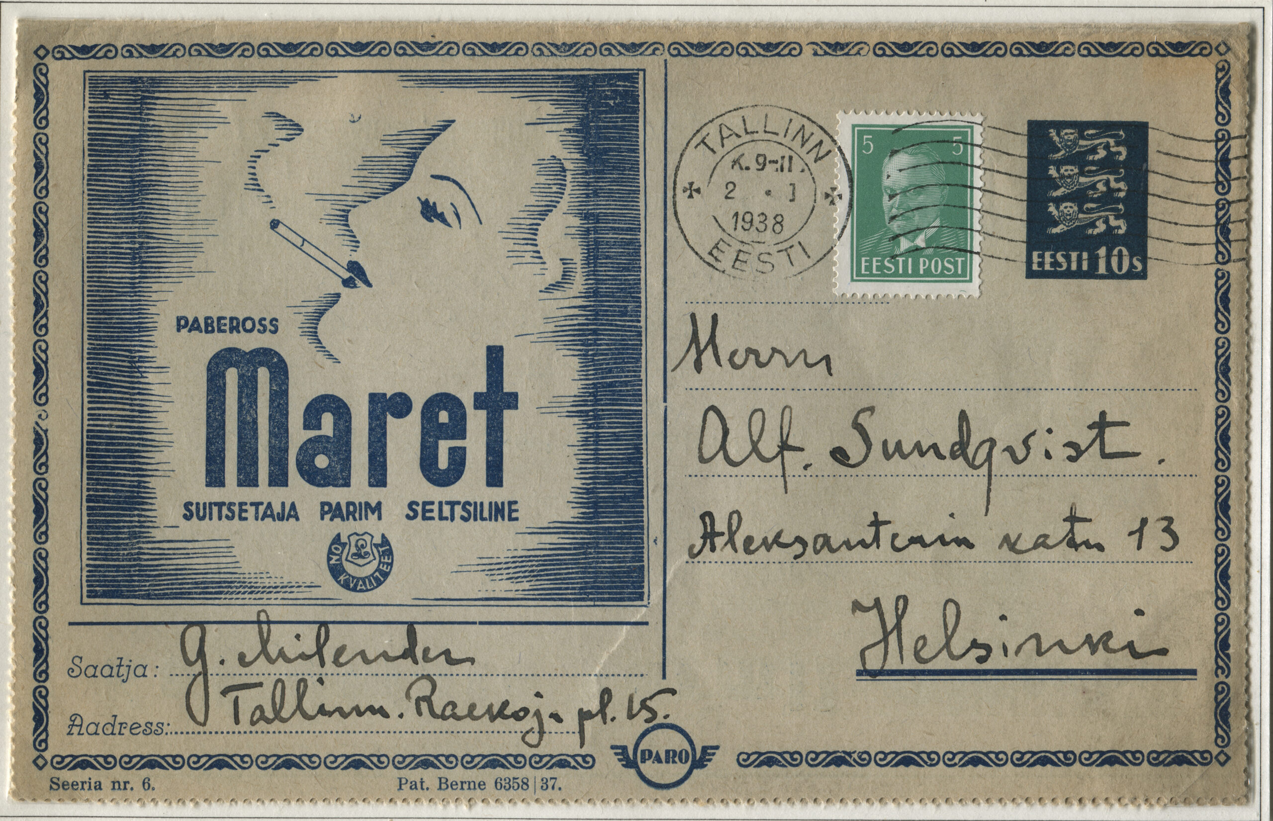ERMi koguKaartkiri (seeria nr 6), mis on saadetud 2.01.1938 Tallinnast Helsingisse