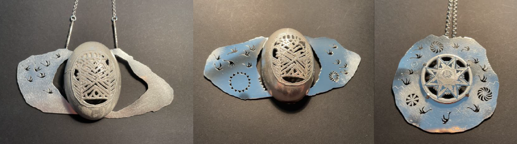 Vasemas vitriinis on Singapuri näitusele valminud kaks kosmilise aluskoodiga kodarraha (2025), mille südamiku moodustab kunstniku poolt joonistatud ja disainitud hõbedast meenemünt “Eesti Ajalugu” (2010, Eesti Pank). Keskmises vitriinis on uusimad arvuti-eksperimendid – kaljujoonisest välja kasvav maailmamuna, mille ümber on “Müütiline Kosmiline Teadmine” (sõlg, 2025) ja ”Linnutee taga asuvad esivanemate hinged” (kaelaehe, 2025). Mõlema ehte keskmes olev Maailmamuna on mudeldatud arvutiga, selle ümber asuvad kujundid on peen käsitöö.