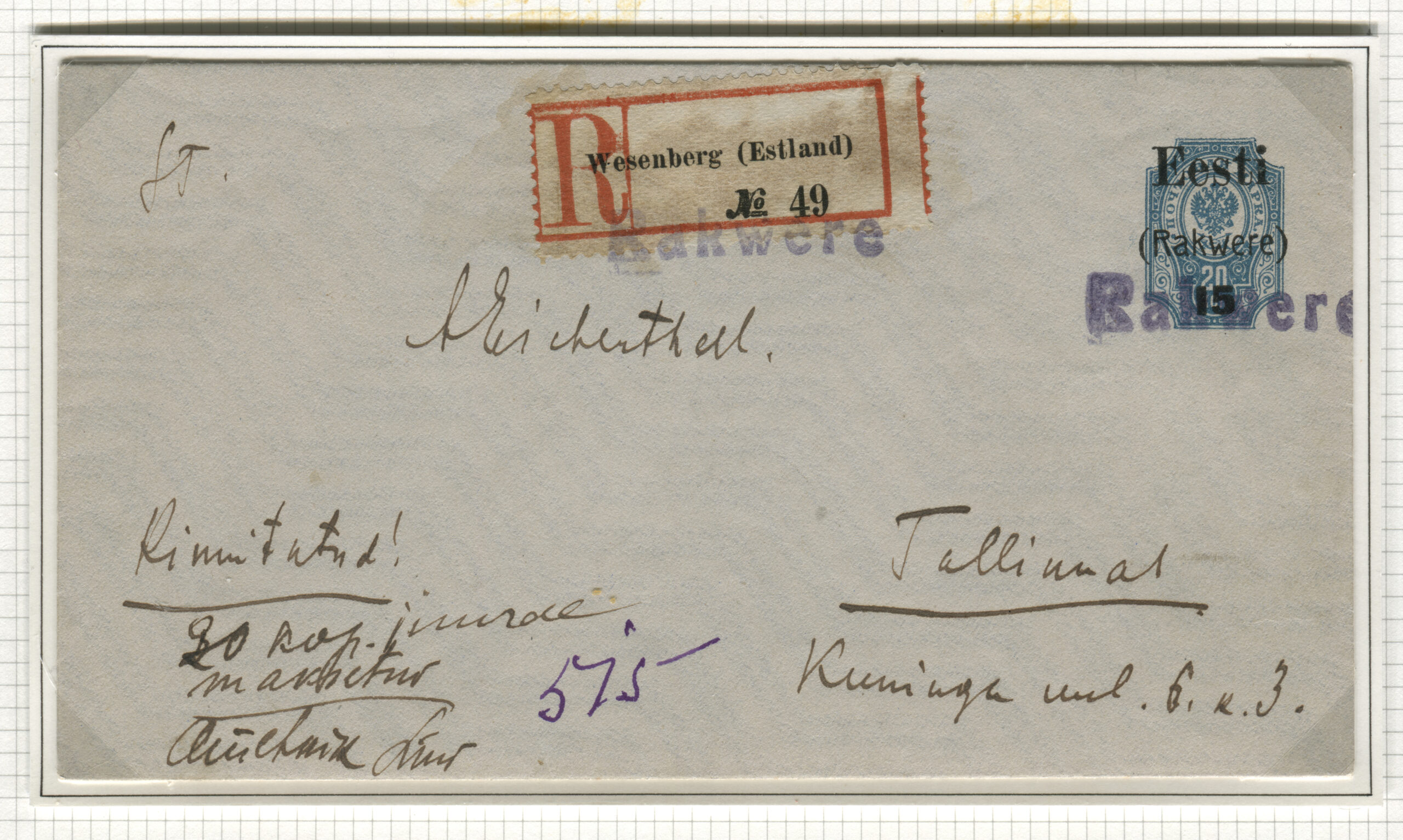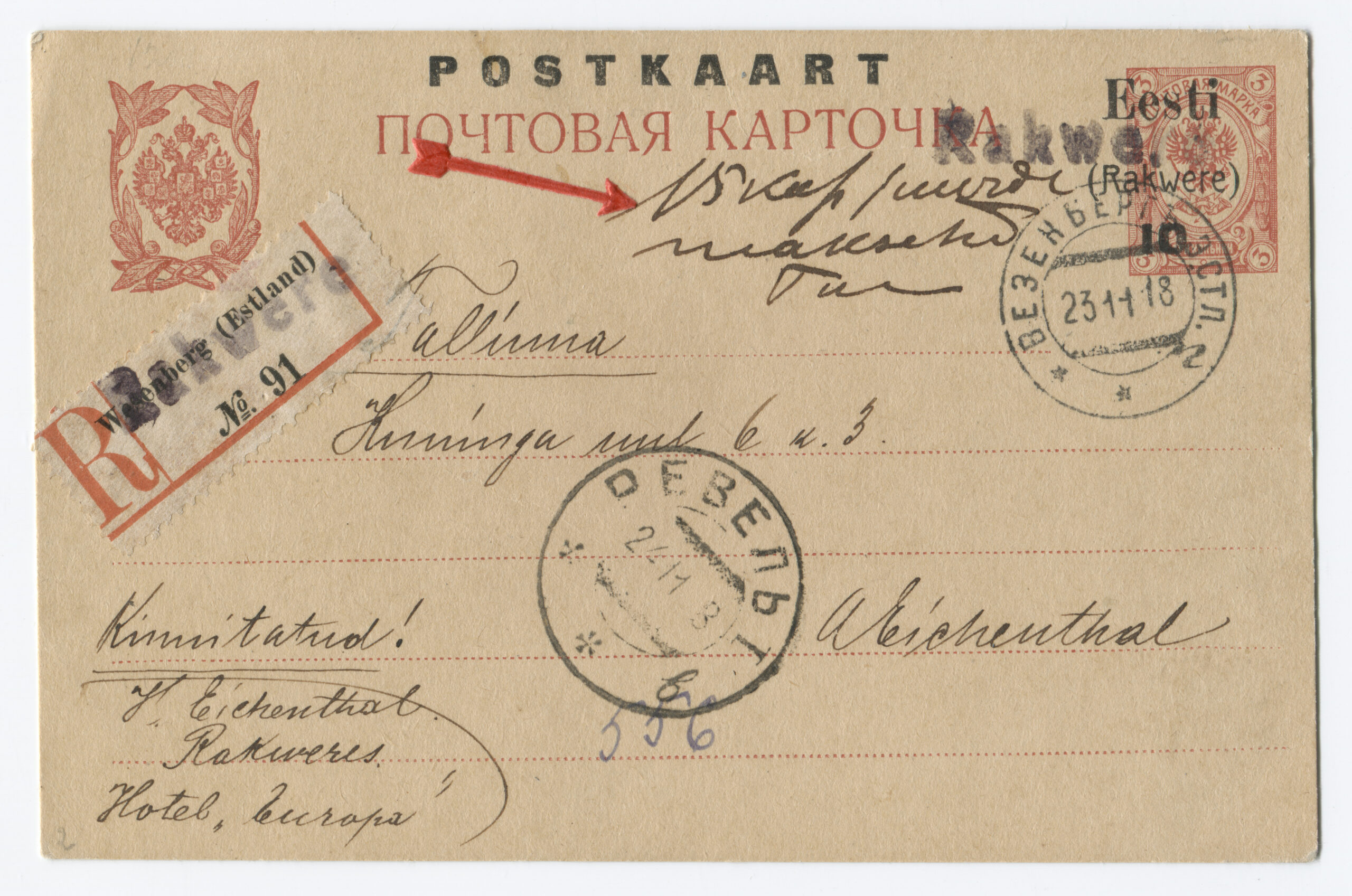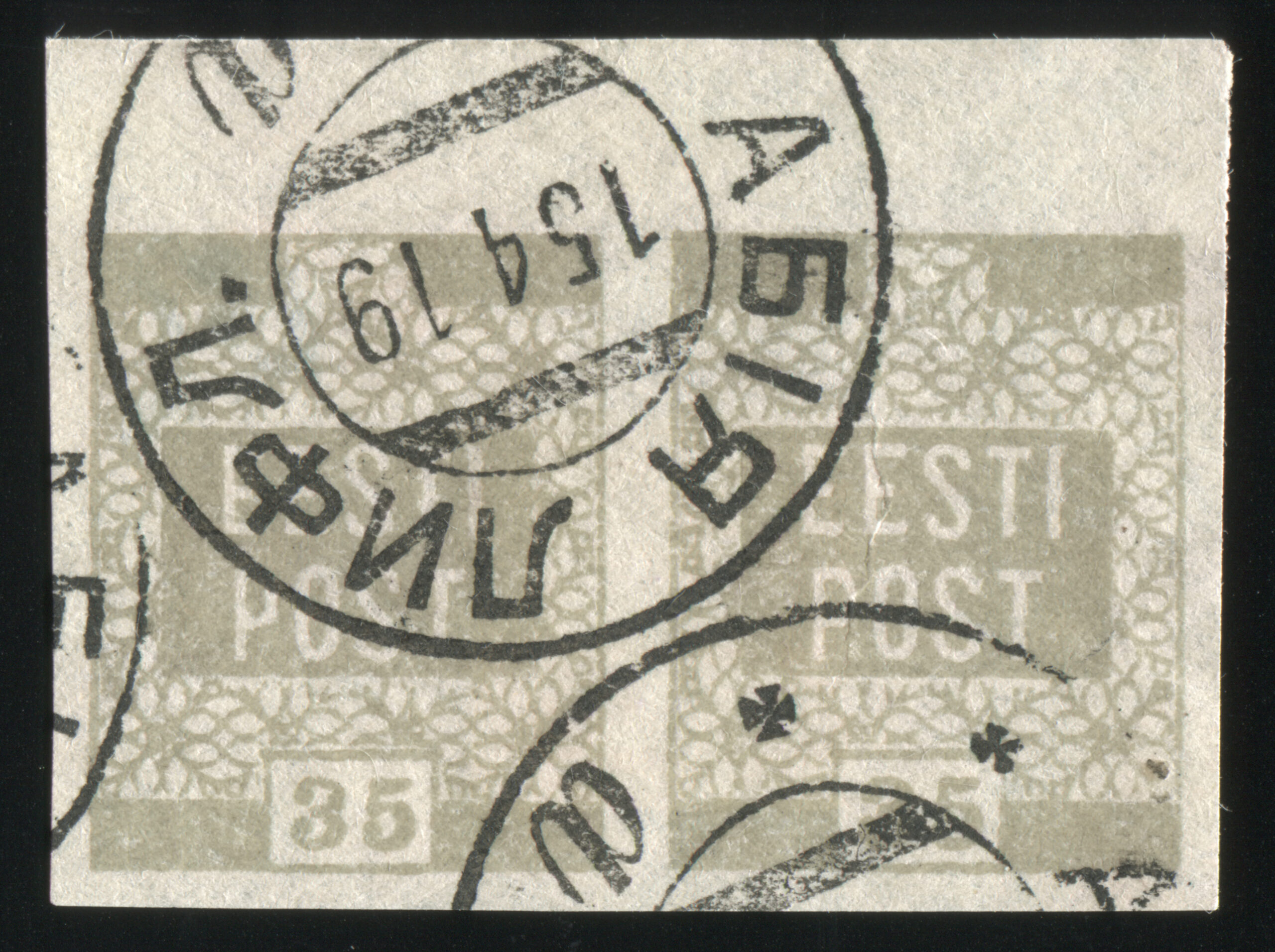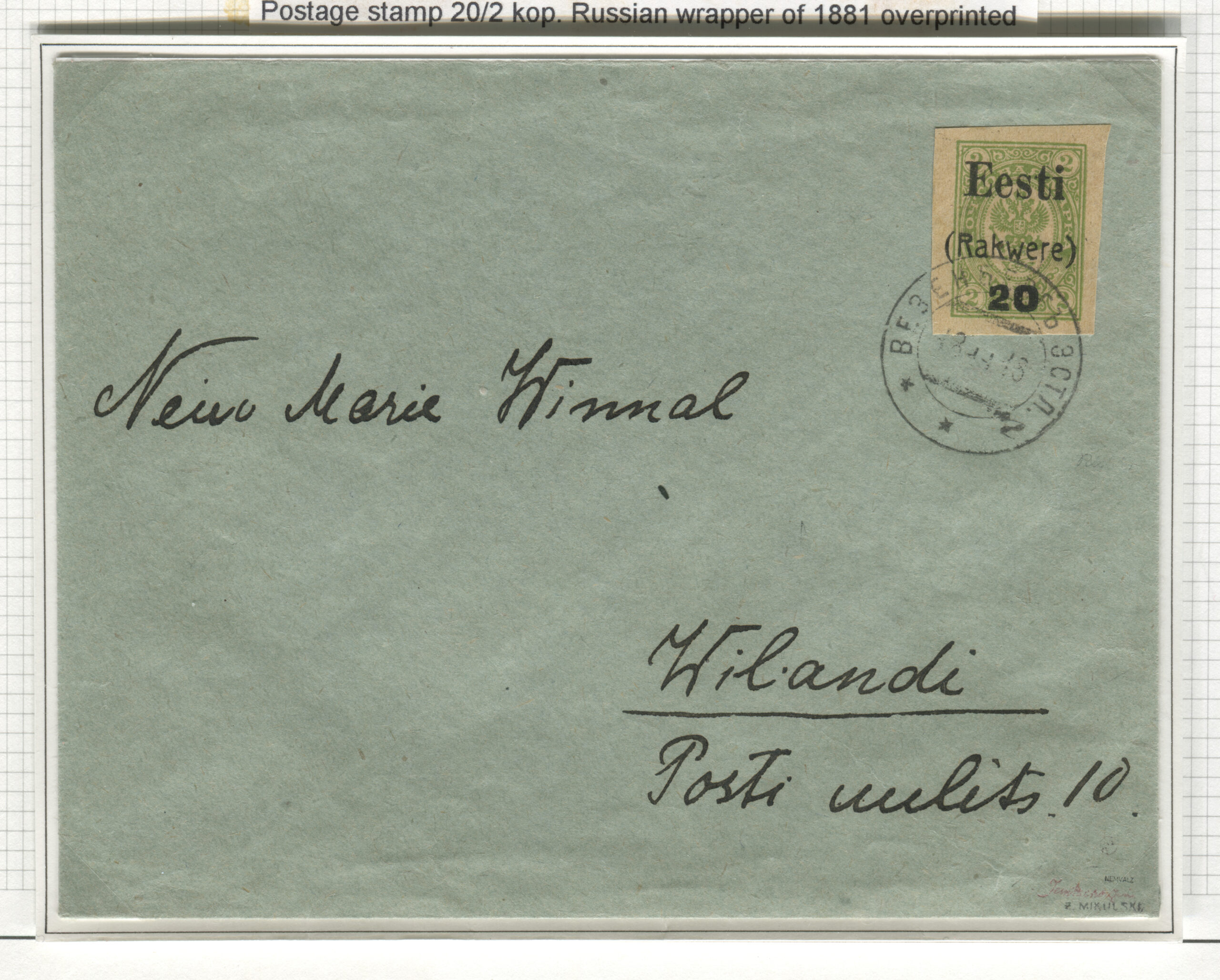 Hindrek Rikandile saadetud kiri Kuressaarest (5.01.1919) Tallinna (14.01.1919). 1938. aastal annetas Rikand kirja Postimuuseumile. (Eesti Rahva Muuseum)23.11.1918 tähitud kiri (R-kiri). Vene tervikasja kohalik ületrükk (Rakwere) ja 15/20 kop. Tähituse juurdemaks 20 kopikat kirjutatud käsitsi. Kiri saadetud A. Eichenthalile. (Eesti Rahva Muuseum)19.04.1919 Taani vabatahtlike kompanii templiga kiri kodumaale. Kirjal on 15-kopikaline lillemustriga mark, 35-pennine hall lillemustriga mark (kustutatud Taani vabatahtlike kompanii templiga) ja 7-öörine Taani mark (kustutatud Taanis 19.04.1919). Nii lillemustriga halli 35-pennist marki kui Taani vabatahtlike templijäljendit esineb kirjadel harva. Taani vabatahtlike jalaväekompanii kuulus Eesti Rahvaväe koosseisu. (Eesti Rahva Muuseum)3.04.1919 tähitud kiri (R-kiri) on saadetud Paldiskist Taani. Kirjal Taani vabatahtlike kompanii tempel. Margid kohaliku hammastusega, kustutatud templiga „Baltiski“. Taani vabatahtlike kompanii osales Eesti Vabadussõjas. Kompanii saabus 4.04.1919 Tallinna, mai keskel saadeti nad Võru rindele. Kompanii koosseisus oli 12 ohvitseri, 12 allohvitseri ja 189 sõdurit. Eestist lahkusid nad 2.09.1919. (Eesti Rahva Muuseum)19.11.1918 kiri. Vene tervikasi kohaliku ületrükiga (Rakwere) ja 15/7 kop. „Rakwere“ ületrükk markidel ja tervikasjadel oli kasutusel 16.–27.11.1918. (Eesti Rahva Muuseum)Vene tervikasi. Rakvere kohalik ületrükk (Rakwere) ja 15/20 kop. Siseriiklik kiri, saadetud A. Eichenthalile. Tähitud kirja juurdemaks 20 kopikat kirjutatud käsitsi. (Eesti Rahva Muuseum)Kohalik kiri. Mark kustutatud ajutise templiga „Rakwere“. Vene margi ületrükk (Rakwere) ja 15/2 kop. (Eesti Rahva Muuseum)18.11.1919 siseriiklik kiri. Vene margi kohalik ületrükk (Rakwere) ja 20/2 kop. (Eesti Rahva Muuseum)24.11.1918 kohalik kiri (postkaart). Vene margi kohalik ületrükk (Rakwere) ja 10/2 kop. Wesenberg (Rakvere). (Erakogu)Kohalik tähitud kiri (R-kiri). Vene tervikasja kohalik ületrükk (Rakwere) ja 15/20. Tähitud kirja juurdemaksuks lisatud mark kohaliku ületrükiga (Rakwere) ja 20/2 kop. Kiri on adresseeritud Rakvere postkontori ülem A. Tornile. (Erakogu)23.11.1918 tähitud postkaart. Vene tervikasi, kohalik ületrükk (Rakwere) ja 10/3 kop. Tähitud kirja juurdemaks 15 kopikat kirjutatud käsitsi. Postkaart saadetud A. Eichenthalile. (Erakogu)10.01.1919 Vene tervikasi saadetud Valka. Eesti Töörahva Kommuun oli Tartus 21.12.1918–14.01.1919. Postkaardi tariif oli 10 kopikat. 3-kopikalisele tervikasjale on kirjutatud käsitsi juurdemaks 7 kopikat. (Erakogu)Eesti Töörahva Kommuun oli Otepääl võimul 12.12.1918–21.01.1919. Sel ajal kasutati postis venekeelseid templeid „Нустаку“. Kiri on saadetud Otepäält Tallinna Eesti posti ja telegraafi ülemale Hindrek Rikandile. Kirja saatmise tariif 15 kopikat on kirjutatud käsitsi. (Erakogu)30.10.1919 tähitud kiri saadetud Tallinnast Saksamaale. Saabumise tempel „Heubude 16.11.1919“. Vabadussõja ajal liikusid välismaale saadetud kirjad läbi Põhjamaade. (Erakogu)Loodearmee margid trükiti Bernhard Mänsi trükikojas Tallinnas 20.08.1919. Kindral Nikolai Judenitši rinde taganemisel sattusid margid bolševike kätte, kes need hävitasid. Margid on kustutatud Loodearmee välitempliga 13.12.1919. Kirjale lisatud on 35-pennine kajakaga mark, mis on kustutatud templiga „Narwa“. (Erakogu)Lillemustriga 35-penniseid marke tehti kolmes trükis (18.01.–2.05.1919), kõigis esines toonierinevusi. Pruun (toonivahedega), hall, oliivhall ja oliivroheline. Halli värvi paarismarke esineb harva. (Erakogu)Vasakul hall 35-pennine ja paremal oliivroheline 35-pennine lillemustriga mark. (Erakogu)29.09.1919 kiri saadetud Tallinnast laevapostiga Helsingisse, sealt edasi Šveitsi. Laevaposti tsenseeriti punase kolmnurkse templiga, mis oli kasutusel 1919. aasta septembrist novembrini. Kirjal on lillemustriga 15-kopikaline mark, mis on nii lõigatud kui hammastatud. Hammastusega 15-kopikalised margid on haruldased, eriti kirjal. (Erakogu)20.03.1919 kiri saadetud Tallinnast Soome Borgåsse (Porvoo). 35-penniste lillemustriga markide trükkimisel esines värvierinevusi. Halli tooni margid, eriti kirjal, on haruldased. (Erakogu)1.07.1919 kiri saadetud Tallinnast Stuttgarti. Kontrollitud Tallinnas, kirjal kolmnurkne tsensortempel S.K. Sõjakontrolli (S.K.) tempel oli Tallinnas kasutusel alates 5.01.1919. (Erakogu)8.04.1919 tähitud trükitöö kiri Tallinnast Saksamaale Bornasse. Tähitud kirja (R-kiri) tempel numbritega, tsaariajal kasutusel olnud kuupäevatempel „Ревель“, nii Tallinna kui Soome sõjakontrolli tempel. Templile „Ревель“ on peale löödud esimene eestikeelne tempel „Tallinn“. Samuti on kirjal esimene eestikeelne R-tempel „Tallinn“. (Erakogu)9.12.1918. Postkaart on saadetud Eesti Vabadussõja alguses Tartust Riiga. Postkaardi saatmise tariif oli 5 kopikat. (Erakogu)1.01.1919 kohalik kiri. Tariifid muutusid 1.01.1919, postkaardi saatmine maksis 10 kopikat. Kiri saadetud tariifide muutumise päeval. (Erakogu)21.01.1919 siseriiklik kiri Viljandist (Фэллинь) Tallinna (Reval). Lillemustriga 35-penniste markide trükkimisel esines värvierinevusi. Kirjal tumepruun mark. (Erakogu)21.01.1919 siseriiklik kiri Viljandist (Фэллинь) Tallinna (Reval). Lillemustriga 35-penniste markide trükkimisel esines värvierinevusi. Kirjal tumepruun mark. (Erakogu)
