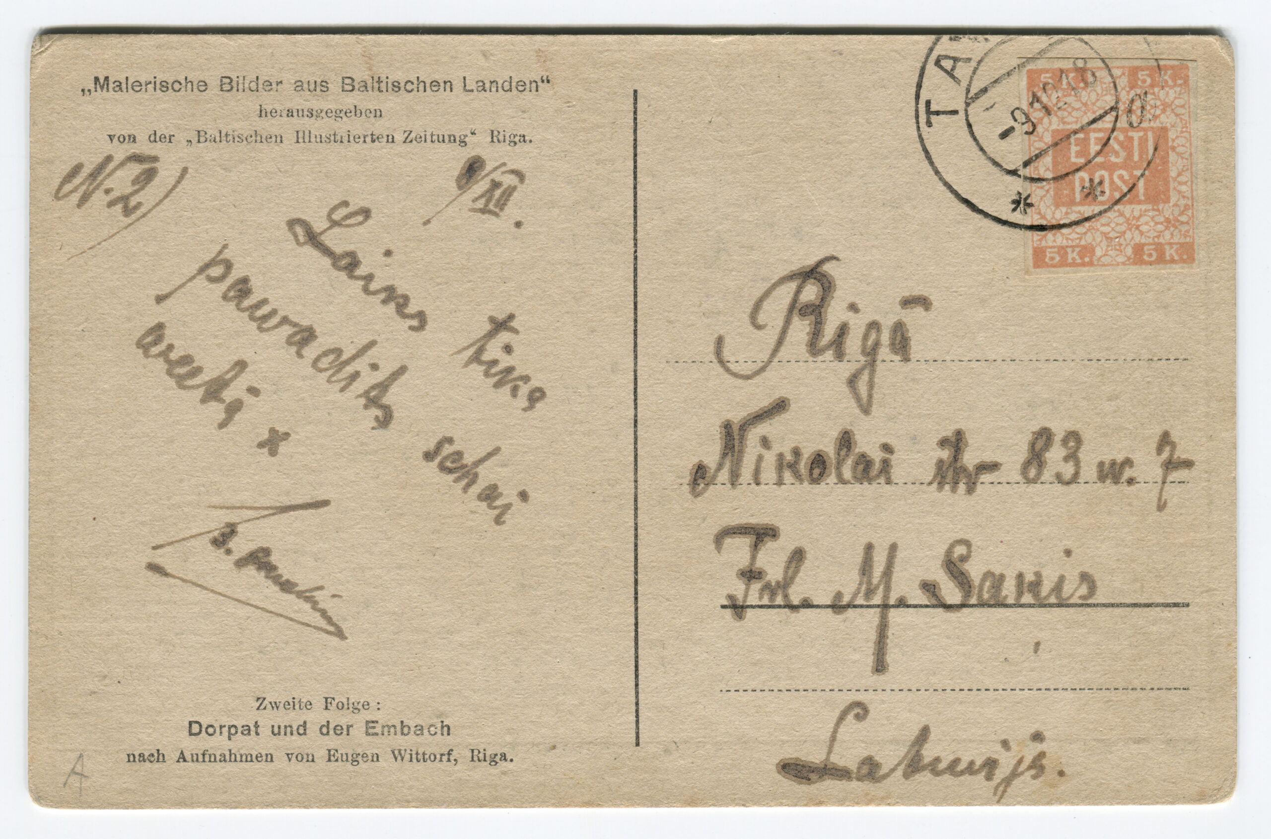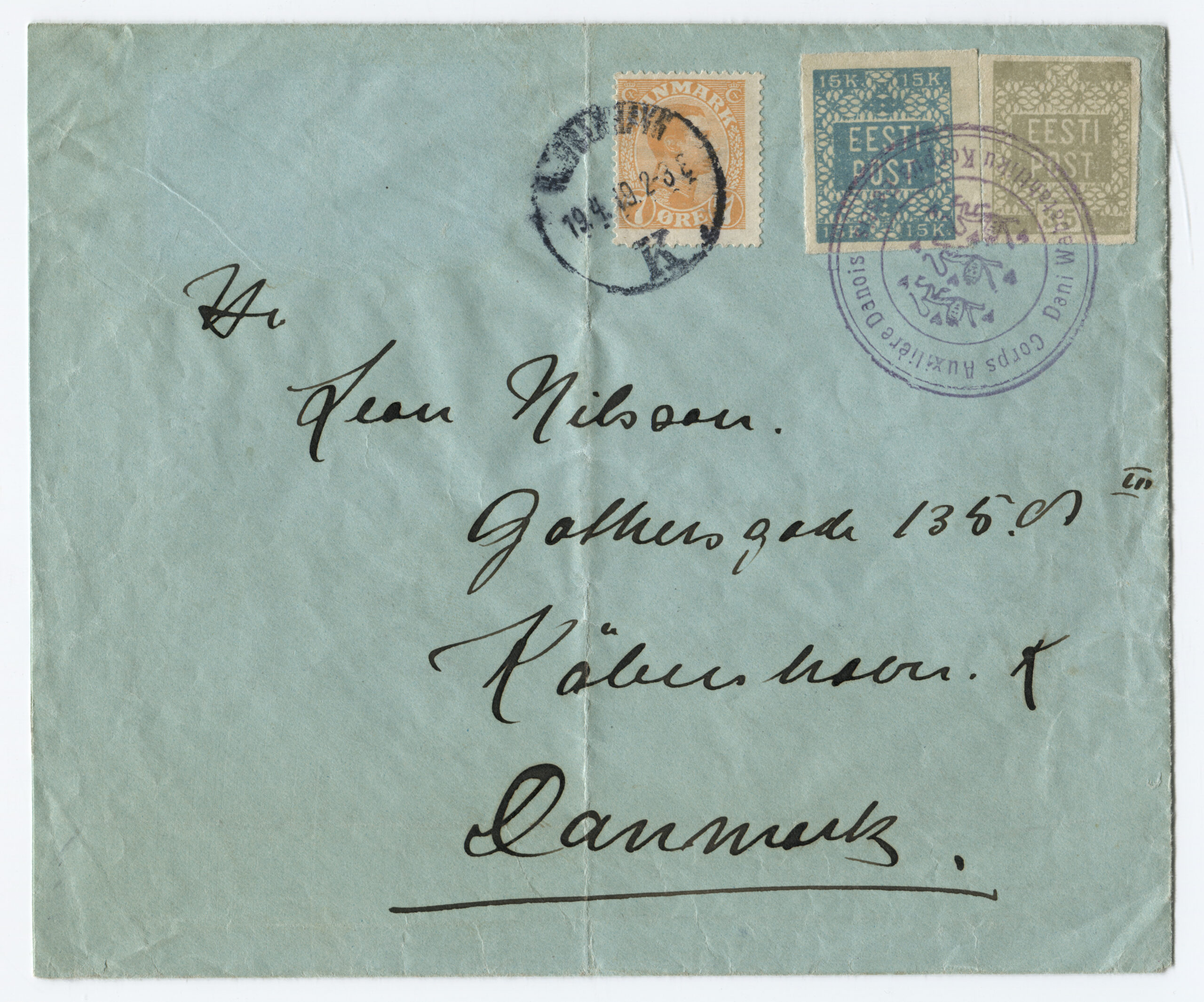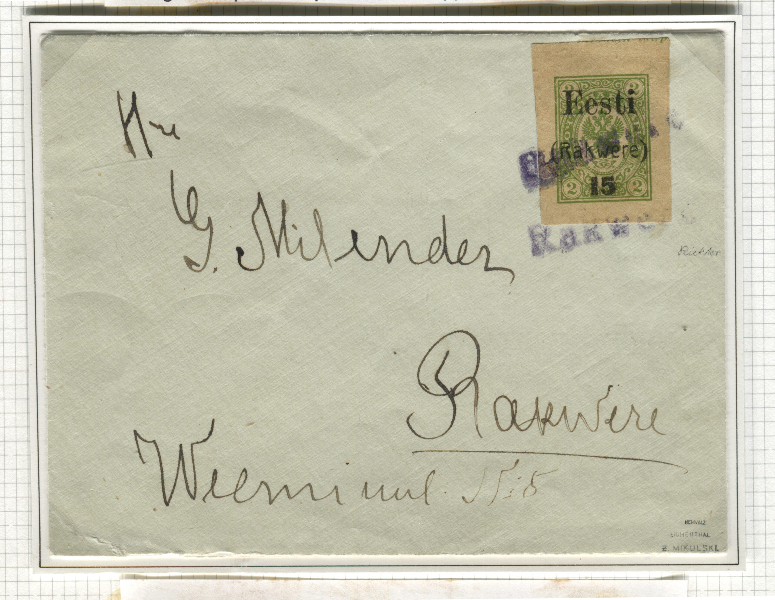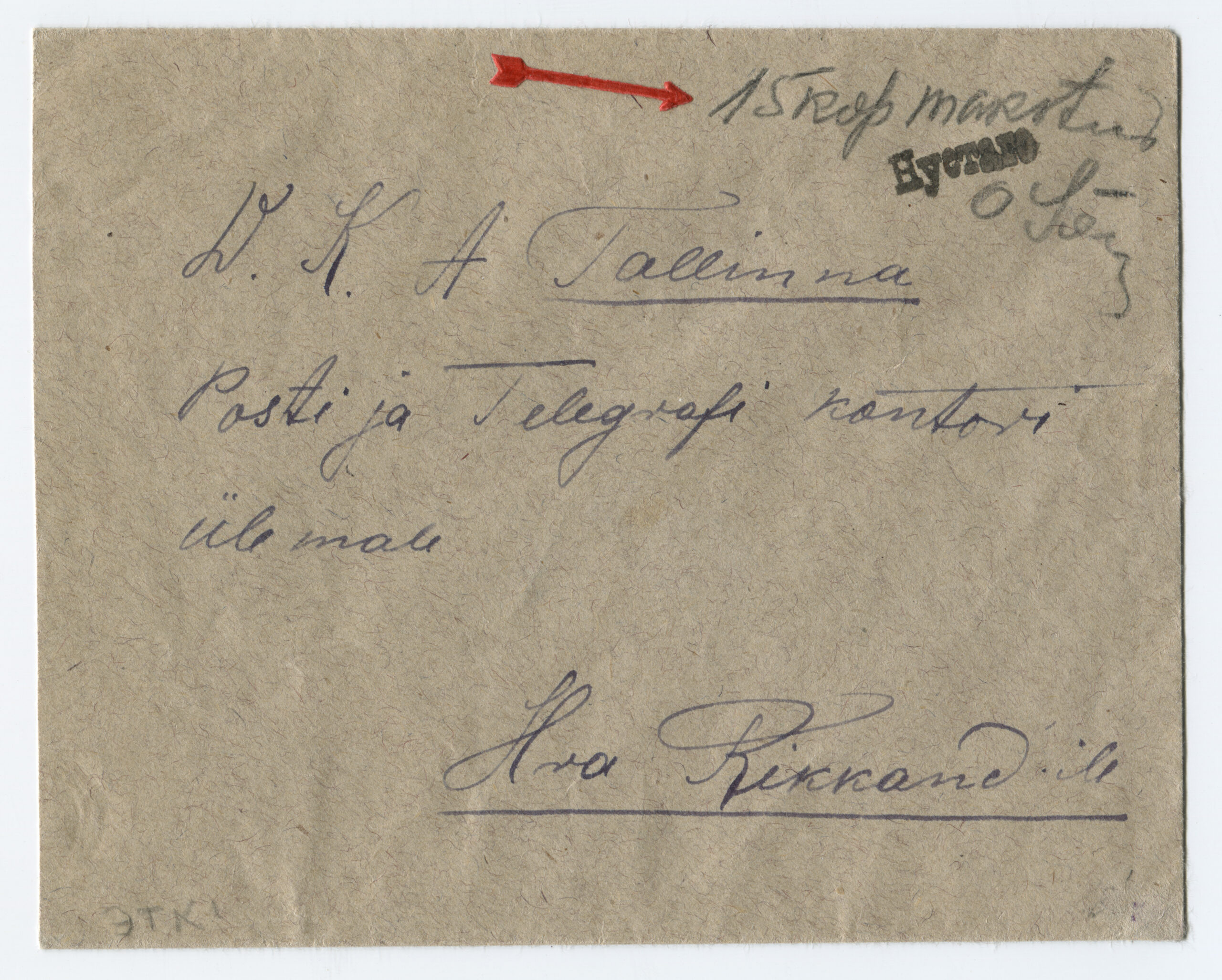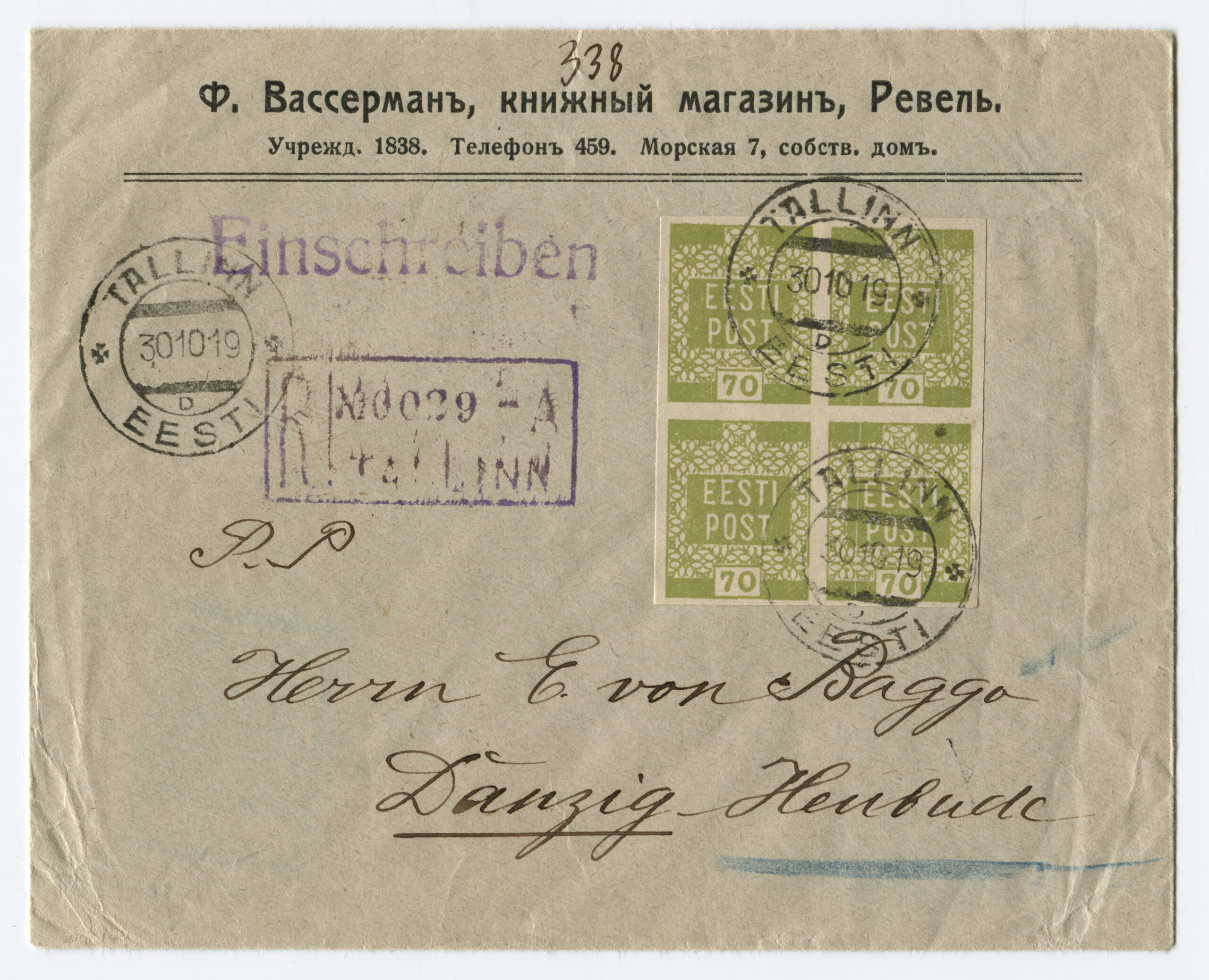 Hindrek Rikandile saadetud kiri Kuressaarest (5.01.1919) Tallinna (14.01.1919). 1938. aastal annetas Rikand kirja Postimuuseumile. (Eesti Rahva Muuseum)23.11.1918 tähitud kiri (R-kiri). Vene tervikasja kohalik ületrükk (Rakwere) ja 15/20 kop. Tähituse juurdemaks 20 kopikat kirjutatud käsitsi. Kiri saadetud A. Eichenthalile. (Eesti Rahva Muuseum)19.04.1919 Taani vabatahtlike kompanii templiga kiri kodumaale. Kirjal on 15-kopikaline lillemustriga mark, 35-pennine hall lillemustriga mark (kustutatud Taani vabatahtlike kompanii templiga) ja 7-öörine Taani mark (kustutatud Taanis 19.04.1919). Nii lillemustriga halli 35-pennist marki kui Taani vabatahtlike templijäljendit esineb kirjadel harva. Taani vabatahtlike jalaväekompanii kuulus Eesti Rahvaväe koosseisu. (Eesti Rahva Muuseum)3.04.1919 tähitud kiri (R-kiri) on saadetud Paldiskist Taani. Kirjal Taani vabatahtlike kompanii tempel. Margid kohaliku hammastusega, kustutatud templiga „Baltiski“. Taani vabatahtlike kompanii osales Eesti Vabadussõjas. Kompanii saabus 4.04.1919 Tallinna, mai keskel saadeti nad Võru rindele. Kompanii koosseisus oli 12 ohvitseri, 12 allohvitseri ja 189 sõdurit. Eestist lahkusid nad 2.09.1919. (Eesti Rahva Muuseum)19.11.1918 kiri. Vene tervikasi kohaliku ületrükiga (Rakwere) ja 15/7 kop. „Rakwere“ ületrükk markidel ja tervikasjadel oli kasutusel 16.–27.11.1918. (Eesti Rahva Muuseum)Vene tervikasi. Rakvere kohalik ületrükk (Rakwere) ja 15/20 kop. Siseriiklik kiri, saadetud A. Eichenthalile. Tähitud kirja juurdemaks 20 kopikat kirjutatud käsitsi. (Eesti Rahva Muuseum)Kohalik kiri. Mark kustutatud ajutise templiga „Rakwere“. Vene margi ületrükk (Rakwere) ja 15/2 kop. (Eesti Rahva Muuseum)18.11.1919 siseriiklik kiri. Vene margi kohalik ületrükk (Rakwere) ja 20/2 kop. (Eesti Rahva Muuseum)24.11.1918 kohalik kiri (postkaart). Vene margi kohalik ületrükk (Rakwere) ja 10/2 kop. Wesenberg (Rakvere). (Erakogu)Kohalik tähitud kiri (R-kiri). Vene tervikasja kohalik ületrükk (Rakwere) ja 15/20. Tähitud kirja juurdemaksuks lisatud mark kohaliku ületrükiga (Rakwere) ja 20/2 kop. Kiri on adresseeritud Rakvere postkontori ülem A. Tornile. (Erakogu)23.11.1918 tähitud postkaart. Vene tervikasi, kohalik ületrükk (Rakwere) ja 10/3 kop. Tähitud kirja juurdemaks 15 kopikat kirjutatud käsitsi. Postkaart saadetud A. Eichenthalile. (Erakogu)10.01.1919 Vene tervikasi saadetud Valka. Eesti Töörahva Kommuun oli Tartus 21.12.1918–14.01.1919. Postkaardi tariif oli 10 kopikat. 3-kopikalisele tervikasjale on kirjutatud käsitsi juurdemaks 7 kopikat. (Erakogu)Eesti Töörahva Kommuun oli Otepääl võimul 12.12.1918–21.01.1919. Sel ajal kasutati postis venekeelseid templeid „Нустаку“. Kiri on saadetud Otepäält Tallinna Eesti posti ja telegraafi ülemale Hindrek Rikandile. Kirja saatmise tariif 15 kopikat on kirjutatud käsitsi. (Erakogu)30.10.1919 tähitud kiri saadetud Tallinnast Saksamaale. Saabumise tempel „Heubude 16.11.1919“. Vabadussõja ajal liikusid välismaale saadetud kirjad läbi Põhjamaade. (Erakogu)Loodearmee margid trükiti Bernhard Mänsi trükikojas Tallinnas 20.08.1919. Kindral Nikolai Judenitši rinde taganemisel sattusid margid bolševike kätte, kes need hävitasid. Margid on kustutatud Loodearmee välitempliga 13.12.1919. Kirjale lisatud on 35-pennine kajakaga mark, mis on kustutatud templiga „Narwa“. (Erakogu)Lillemustriga 35-penniseid marke tehti kolmes trükis (18.01.–2.05.1919), kõigis esines toonierinevusi. Pruun (toonivahedega), hall, oliivhall ja oliivroheline. Halli värvi paarismarke esineb harva. (Erakogu)Vasakul hall 35-pennine ja paremal oliivroheline 35-pennine lillemustriga mark. (Erakogu)29.09.1919 kiri saadetud Tallinnast laevapostiga Helsingisse, sealt edasi Šveitsi. Laevaposti tsenseeriti punase kolmnurkse templiga, mis oli kasutusel 1919. aasta septembrist novembrini. Kirjal on lillemustriga 15-kopikaline mark, mis on nii lõigatud kui hammastatud. Hammastusega 15-kopikalised margid on haruldased, eriti kirjal. (Erakogu)20.03.1919 kiri saadetud Tallinnast Soome Borgåsse (Porvoo). 35-penniste lillemustriga markide trükkimisel esines värvierinevusi. Halli tooni margid, eriti kirjal, on haruldased. (Erakogu)1.07.1919 kiri saadetud Tallinnast Stuttgarti. Kontrollitud Tallinnas, kirjal kolmnurkne tsensortempel S.K. Sõjakontrolli (S.K.) tempel oli Tallinnas kasutusel alates 5.01.1919. (Erakogu)8.04.1919 tähitud trükitöö kiri Tallinnast Saksamaale Bornasse. Tähitud kirja (R-kiri) tempel numbritega, tsaariajal kasutusel olnud kuupäevatempel „Ревель“, nii Tallinna kui Soome sõjakontrolli tempel. Templile „Ревель“ on peale löödud esimene eestikeelne tempel „Tallinn“. Samuti on kirjal esimene eestikeelne R-tempel „Tallinn“. (Erakogu)9.12.1918. Postkaart on saadetud Eesti Vabadussõja alguses Tartust Riiga. Postkaardi saatmise tariif oli 5 kopikat. (Erakogu)1.01.1919 kohalik kiri. Tariifid muutusid 1.01.1919, postkaardi saatmine maksis 10 kopikat. Kiri saadetud tariifide muutumise päeval. (Erakogu)21.01.1919 siseriiklik kiri Viljandist (Фэллинь) Tallinna (Reval). Lillemustriga 35-penniste markide trükkimisel esines värvierinevusi. Kirjal tumepruun mark. (Erakogu)21.01.1919 siseriiklik kiri Viljandist (Фэллинь) Tallinna (Reval). Lillemustriga 35-penniste markide trükkimisel esines värvierinevusi. Kirjal tumepruun mark. (Erakogu)