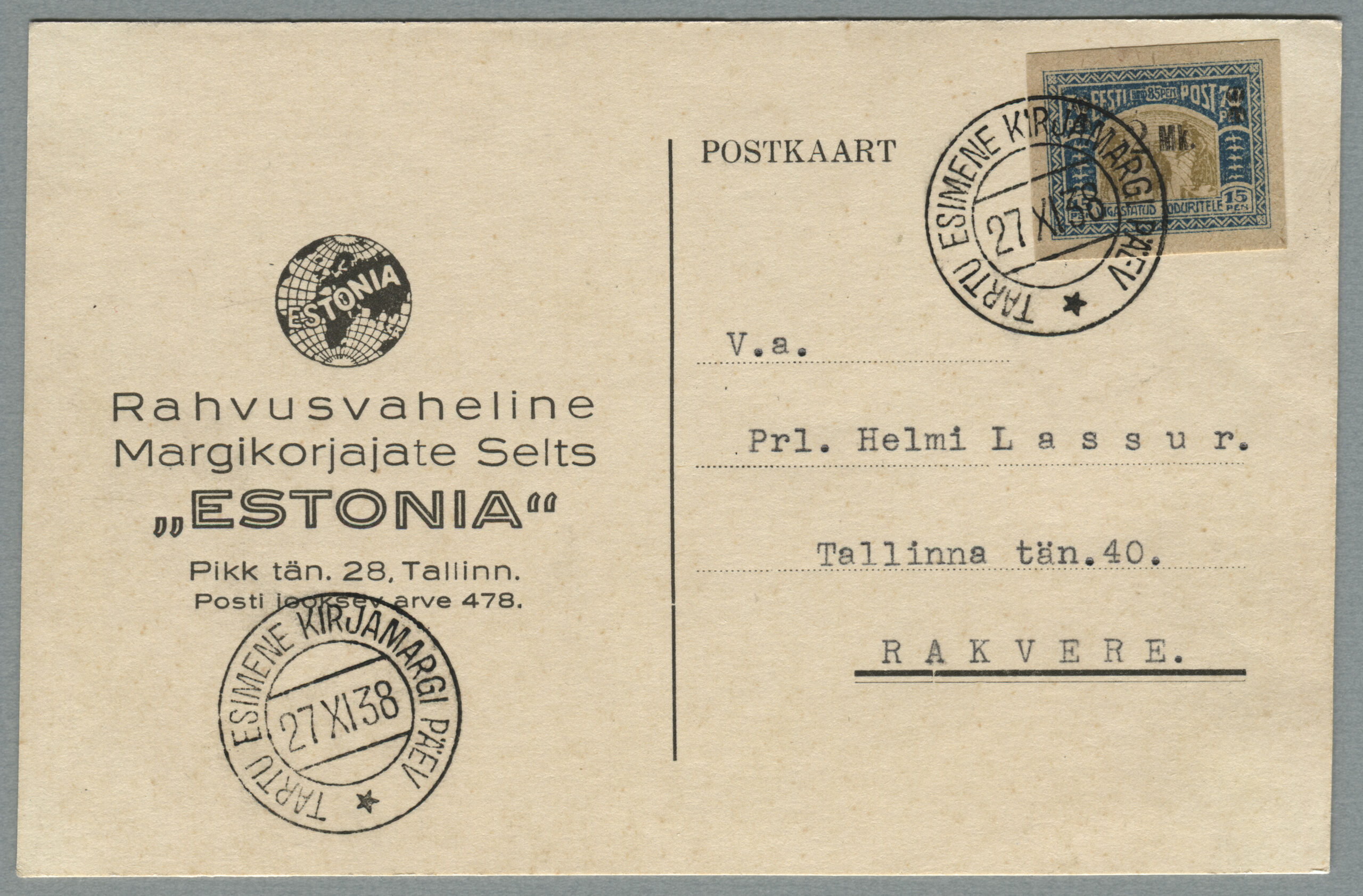 ErakoguRahvusvahelise Margikorjajate Seltsi „Estonia“ postkaart on saadetud Tartust 27.11.1938 Rakverre. Eritempel „TARTU ESIMENR KIRJAMARGI PÄEV 27.11.1938“.