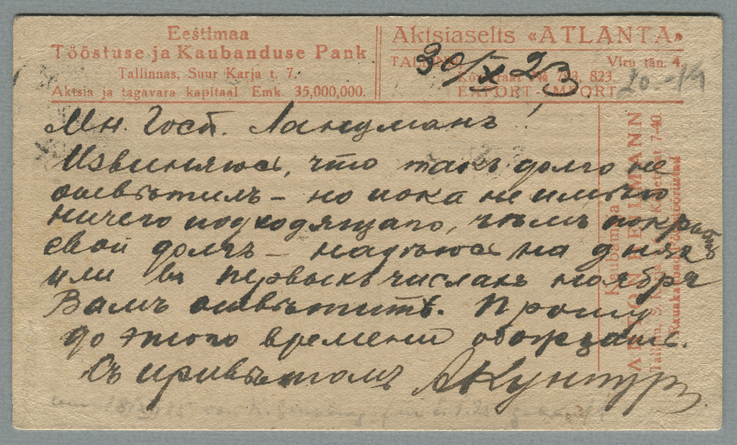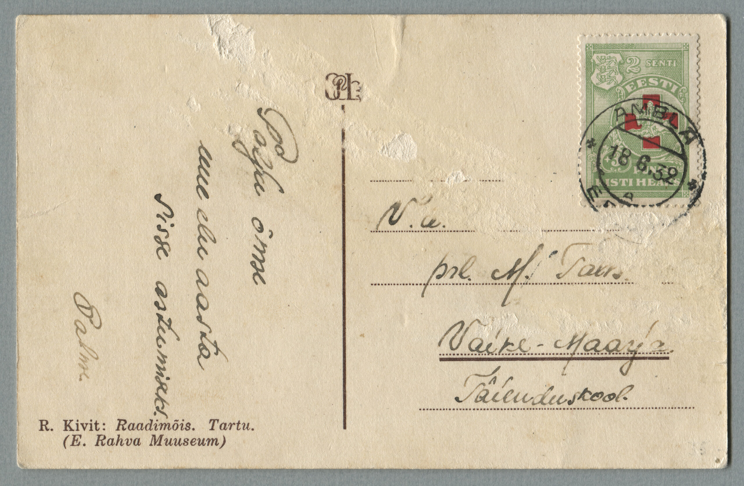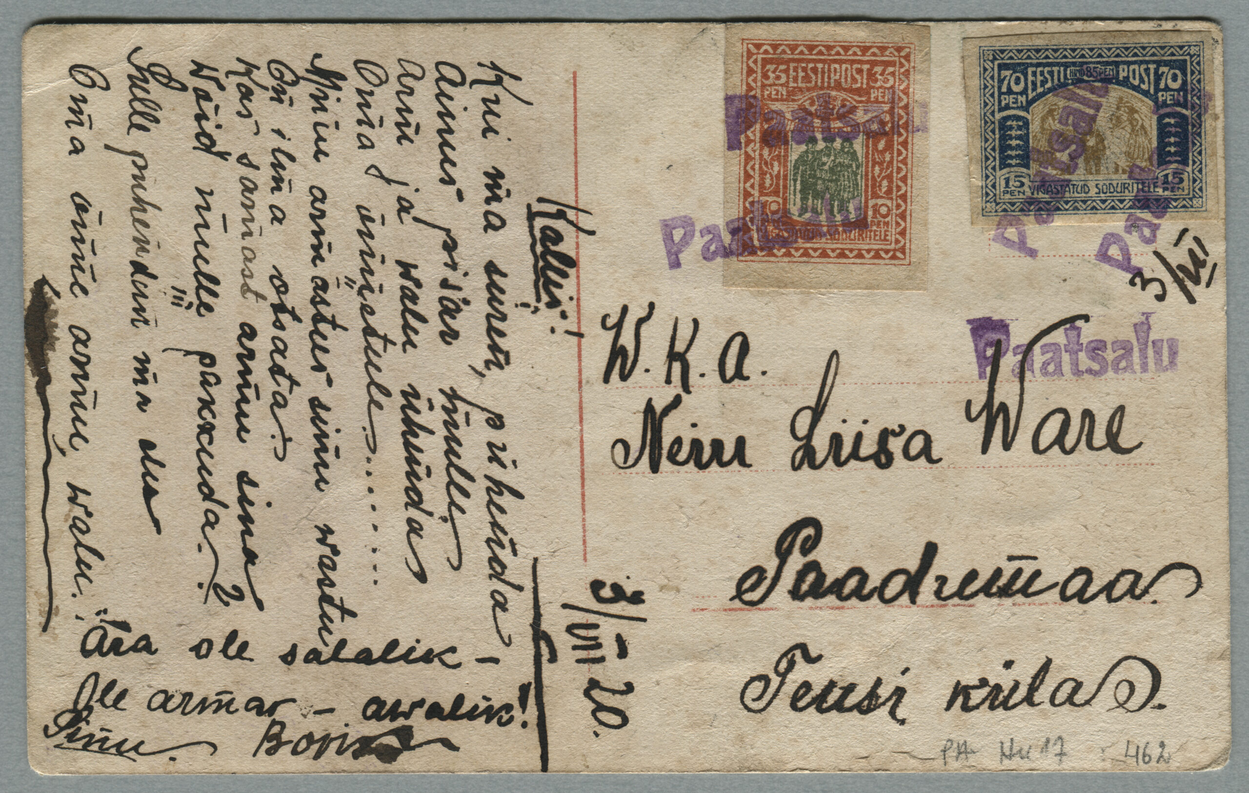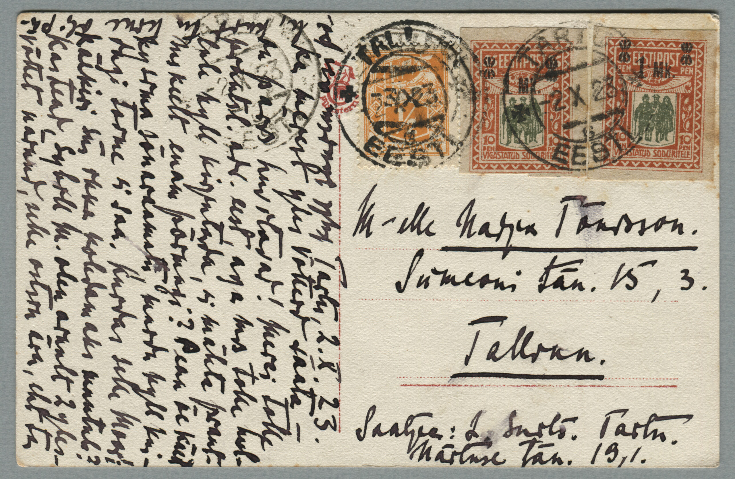 ERMi koguPäewaleht, nr 240, 22. oktoober 1920Kaja nr 88, 21. aprill 1921Postkaart on saadetud Tallinna, postivaguni Pärnu-Tallinn tempel 15.07.1921.