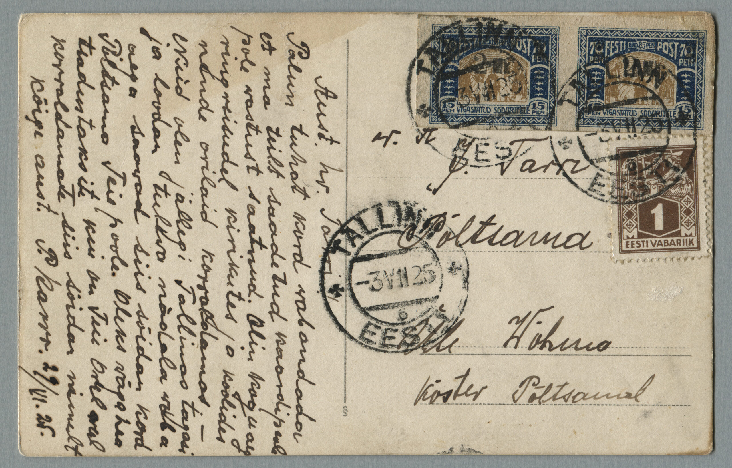 ErakoguPostkaart on saadetud Tallinnast 3.07.1925 Põltsamaale.