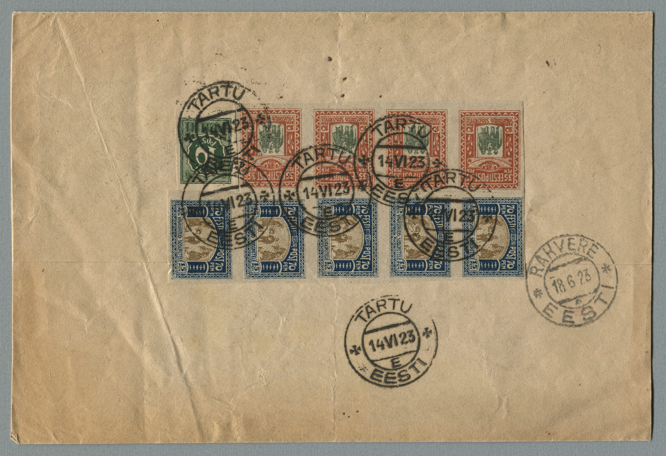 ErakoguRiigi Teataja nr 119, 8.10.1923, lk 851Tähitud õhupostikiri Tallinnast 17.10.1923 Abosse (Soome) 18.10.1923. Tariif 15 + 30 marka kehtis 1.11.1922–1.01.1924. Perforeeritud ületrükiga „Aita hädalist“ margid on kirjal haruldased. Ümbrikul on kõik sarja margid (lõigatud, hammastatud).