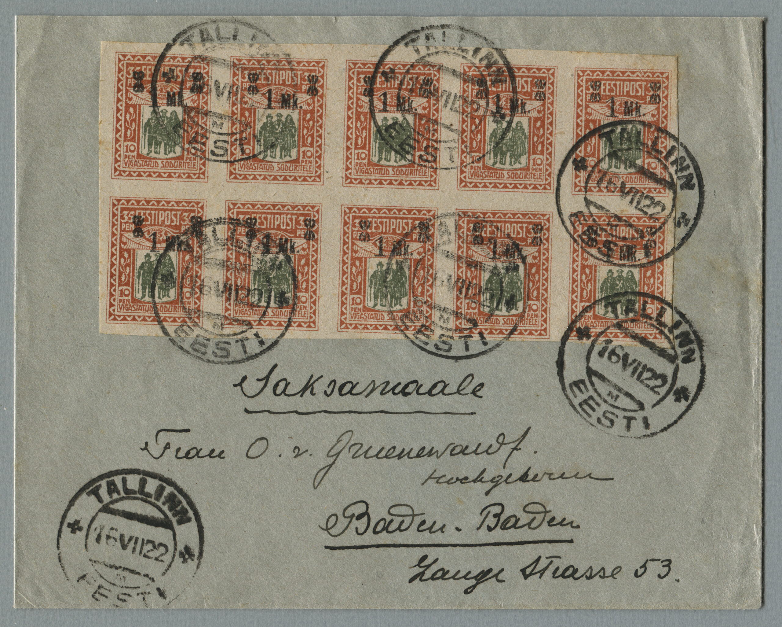 ERMi koguRahvusvaheline kiri Tallinnast 16.07.1922 Baden-Badenisse (Saksamaa), tariif 10 marka (10.04.1921–31.10.1922).