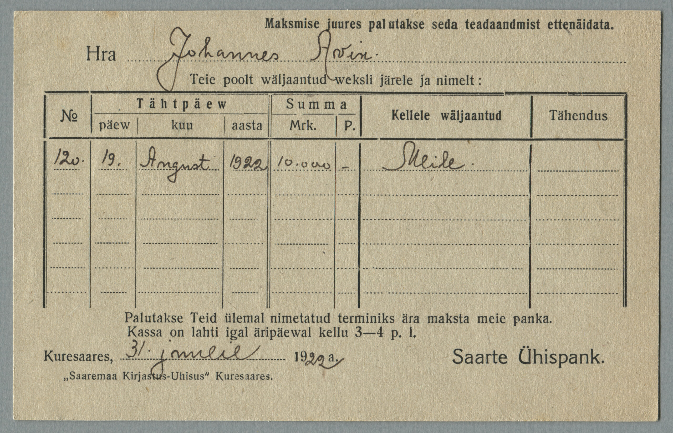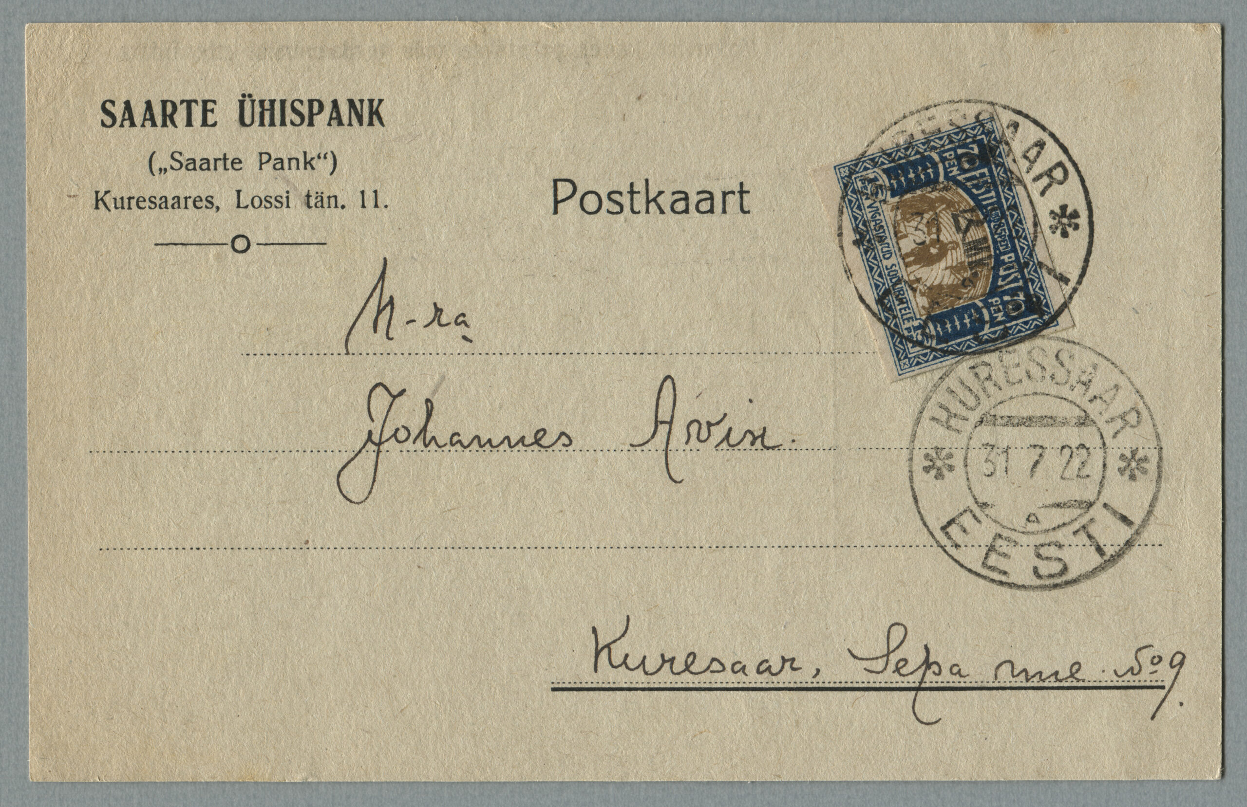 ErakoguSaarte Ühispanga postkaart on saadetud 31.07.1922, tariif 2 marka (10.04.1922– 31.12.1923).