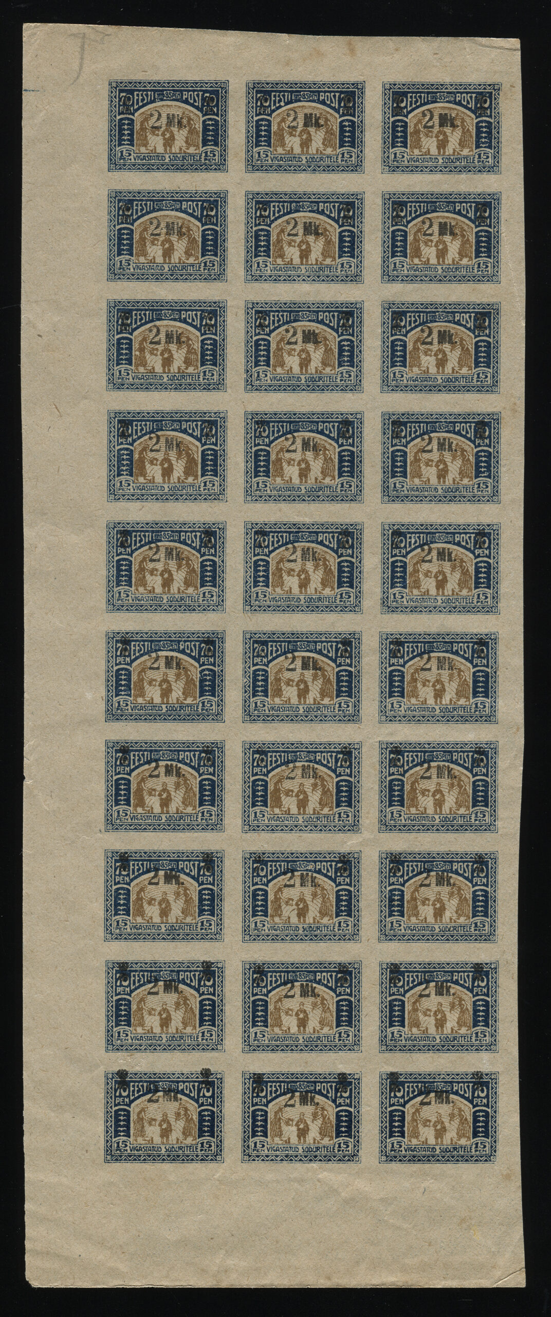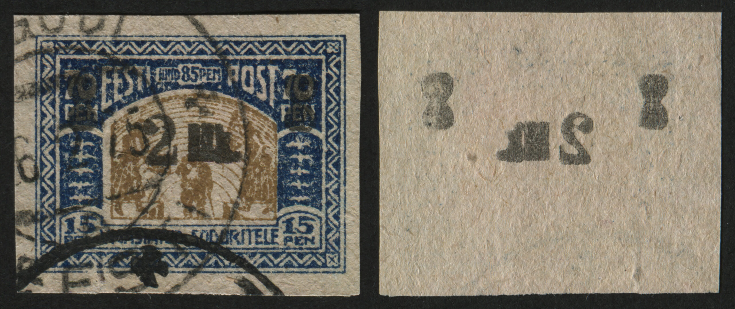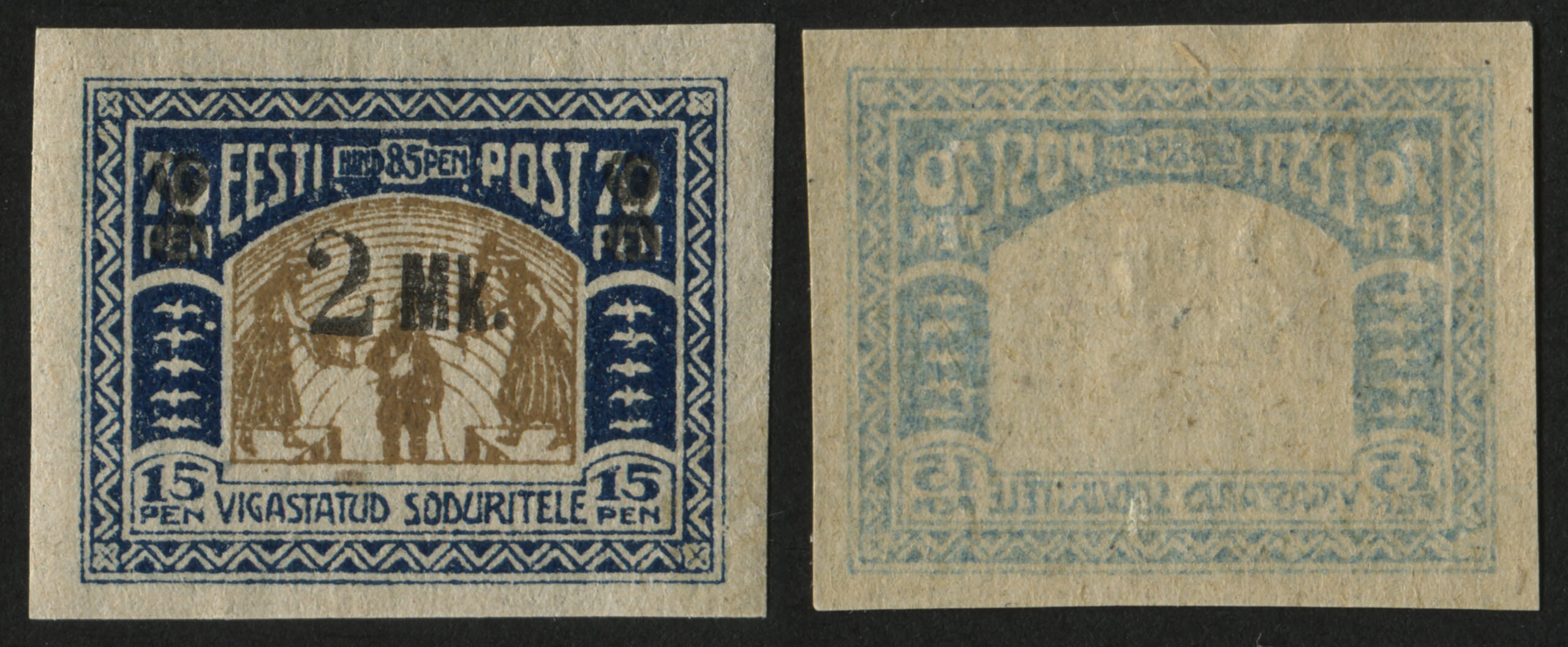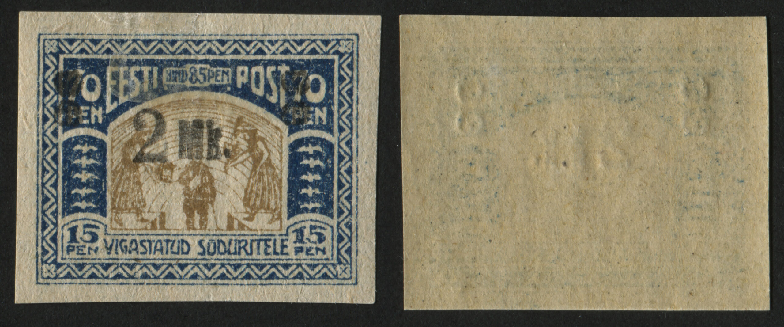 ERMi koguMargi „Vigastatud sõduritele“ ületrükk 2 marka. Ületrükk tehti Tallinna trükikojas „Ühiselu“, tagaküljel ületrüki jälg.