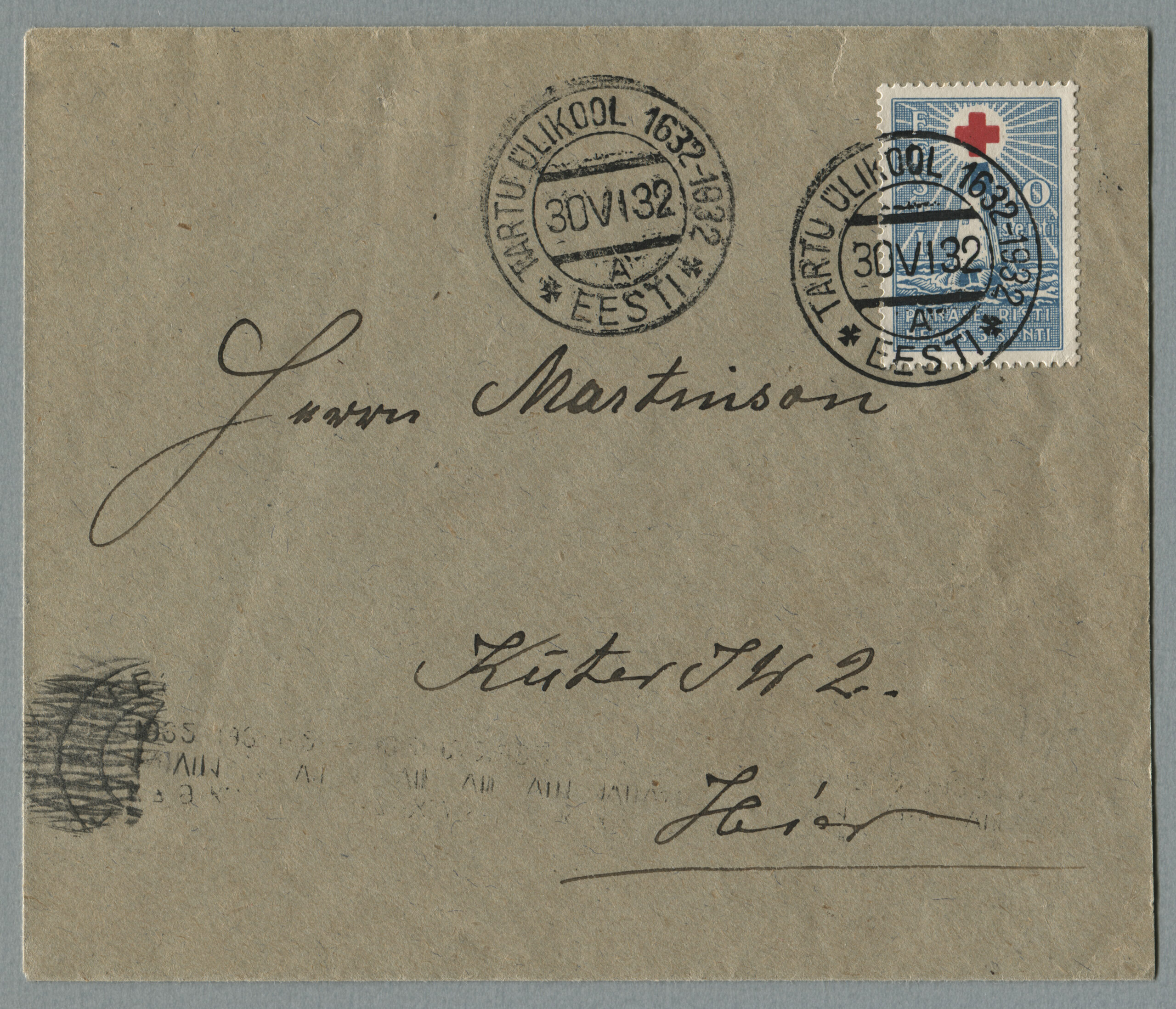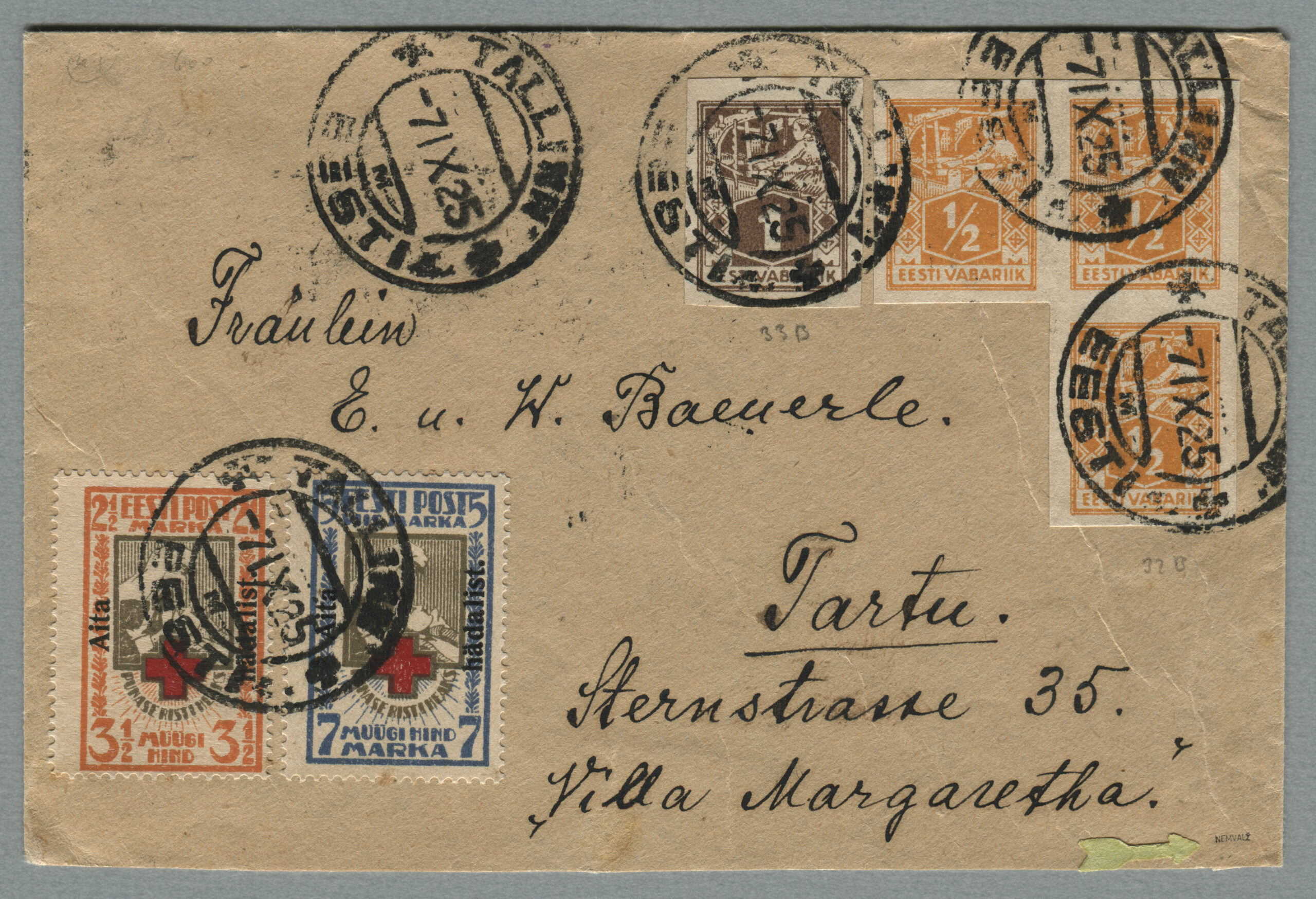 ErakoguKiri on saadetud Tallinnast 7.09.1925 Tartusse 8.09.1925. Punase Risti margid ületrükiga „Aita hädalist“ on ümbrikul haruldased.