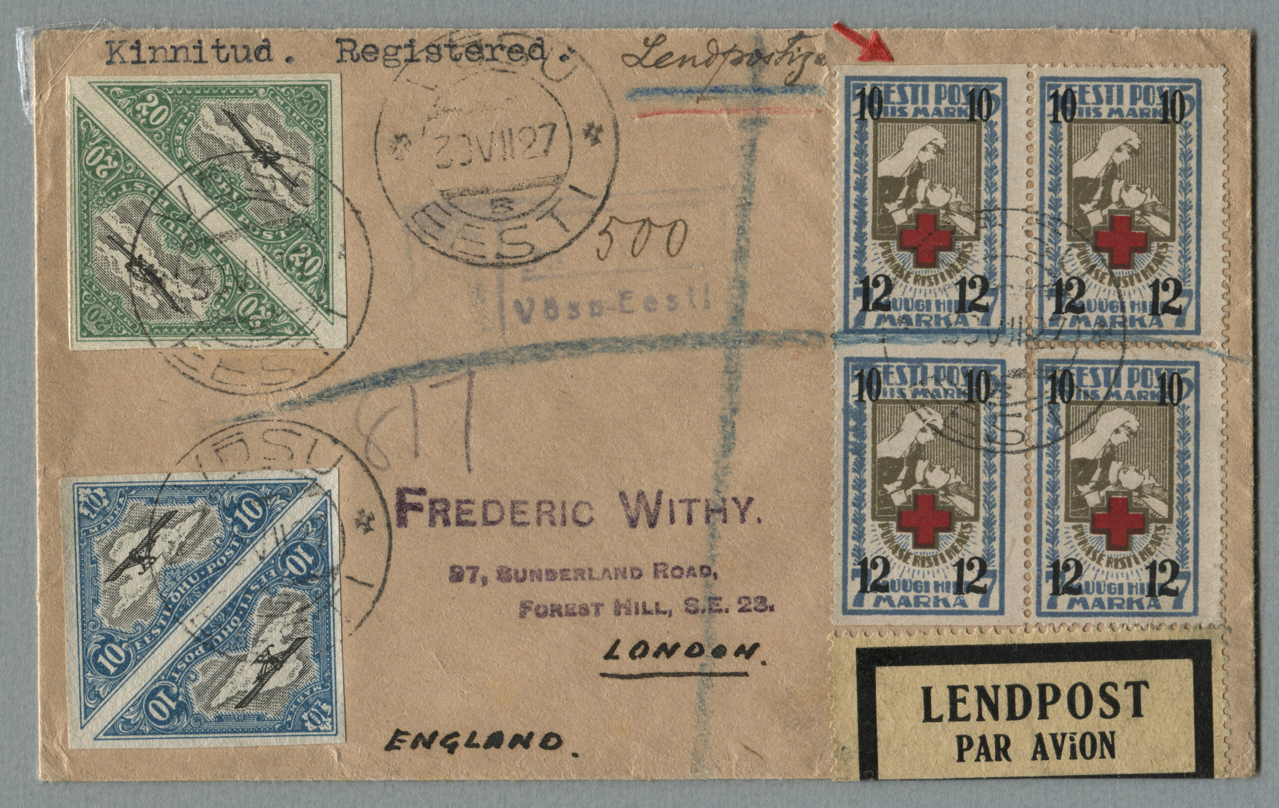ERMi koguRahvusvaheline kiri Tallinnast 19.03.1927 Kenti (Inglismaa). „Punase Risti heaks“ ületrükiga margid on ümbrikul haruldased.