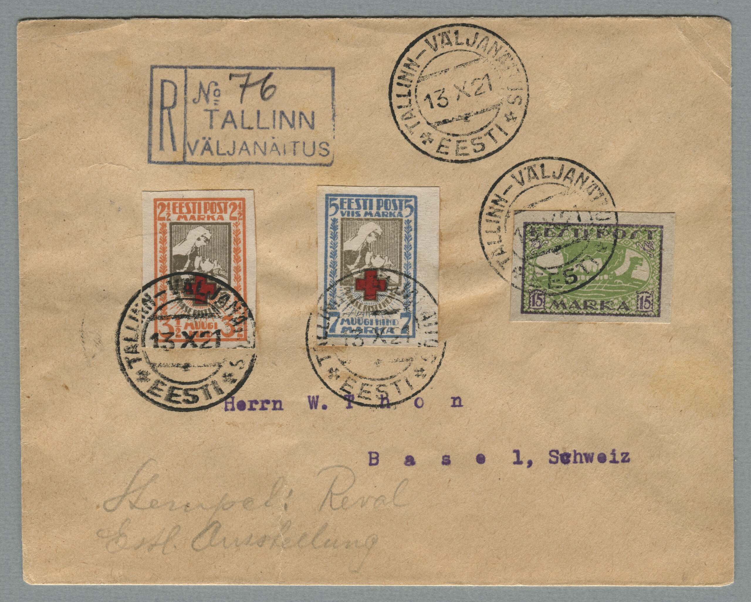 ErakoguPäewaleht nr 104, 22. aprill 1921Tähitud kiri on saadetud Tallinnast 13.10.1921 Baseli (Šveits) 20.09.1921. Ajutise postkontori tähtkirja tempel „Tallinn Väljanäitus“.