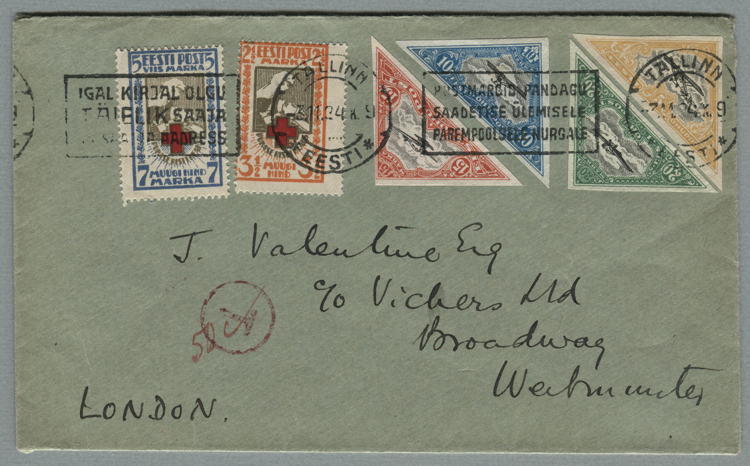 ErakoguRahvusvaheline kiri on saadetud Tallinnast 31.11.1924 Londonisse. Marke on peal vääringus 8 marka. Tariif oli 15 marka (1.01.1924–1.02.1925). Punane trahvi tempel „T“, kirja saajal tuli märgitud summa tasuda.