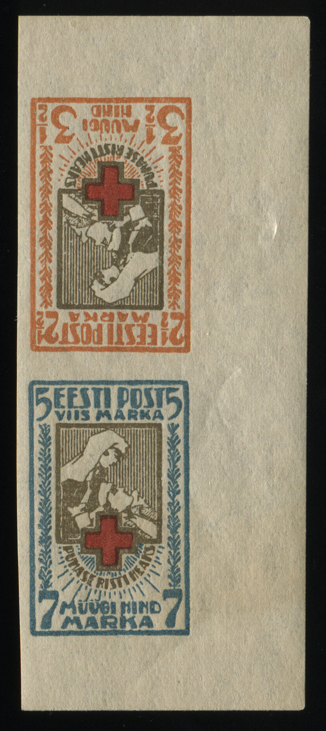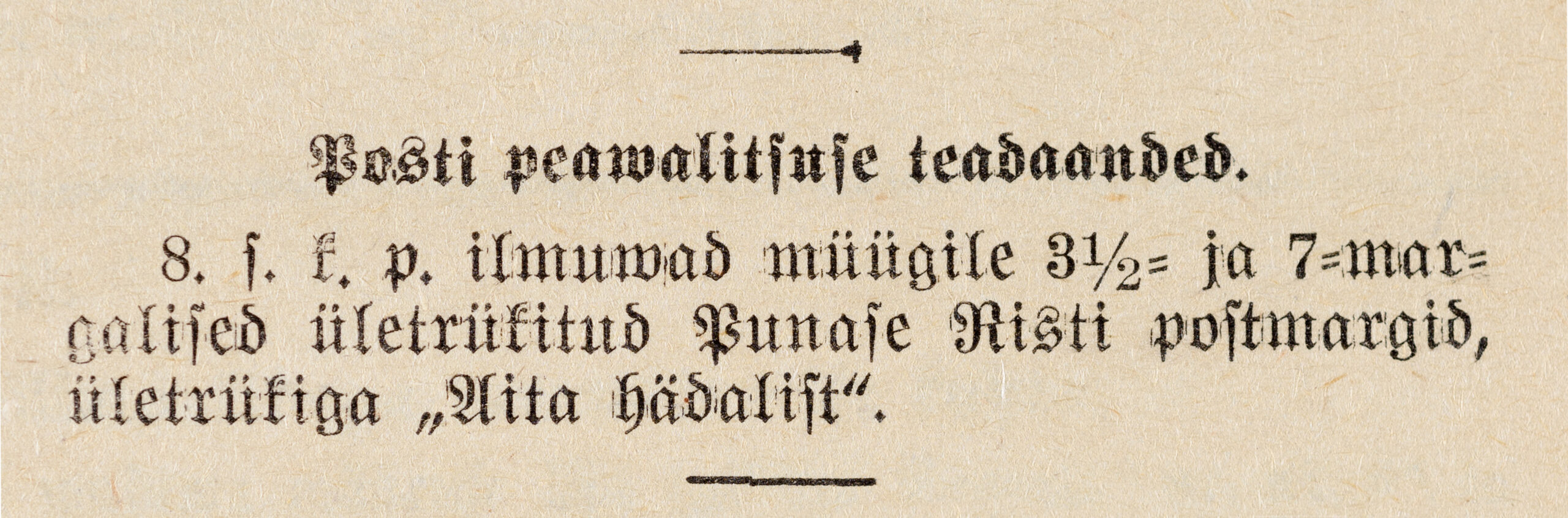 Päewaleht nr 104 (22.04.1921) annab teada: „Iseäralised postmargid Eesti Punase Risti heaks. Riigi Teatajas nr 29 on avaldatud valitsuse määrus vastuvõtmise asjus iseäraliste postmarkide pealt Eesti Punase risti heaks. Eesti Vabariigis antakse välja vabatahtlikuks tarvitamiseks harilikkude postmarkide kõrval iseäralised postmargid kõrgendatud hindadega, mille müügist saadud puhastulu Eesti Punase Risti peavalitsusele läheb, tähendatud asutuse eesmärkide teostamise kulude katteks. Marke võib harilikkude postmarkide asemel ainult sisemaaliste postisaadetuste frankeerimiseks tarvitada. Markide müügi aeg kestab kuus kuud, nende müügile ilmumise päevast arvates.“