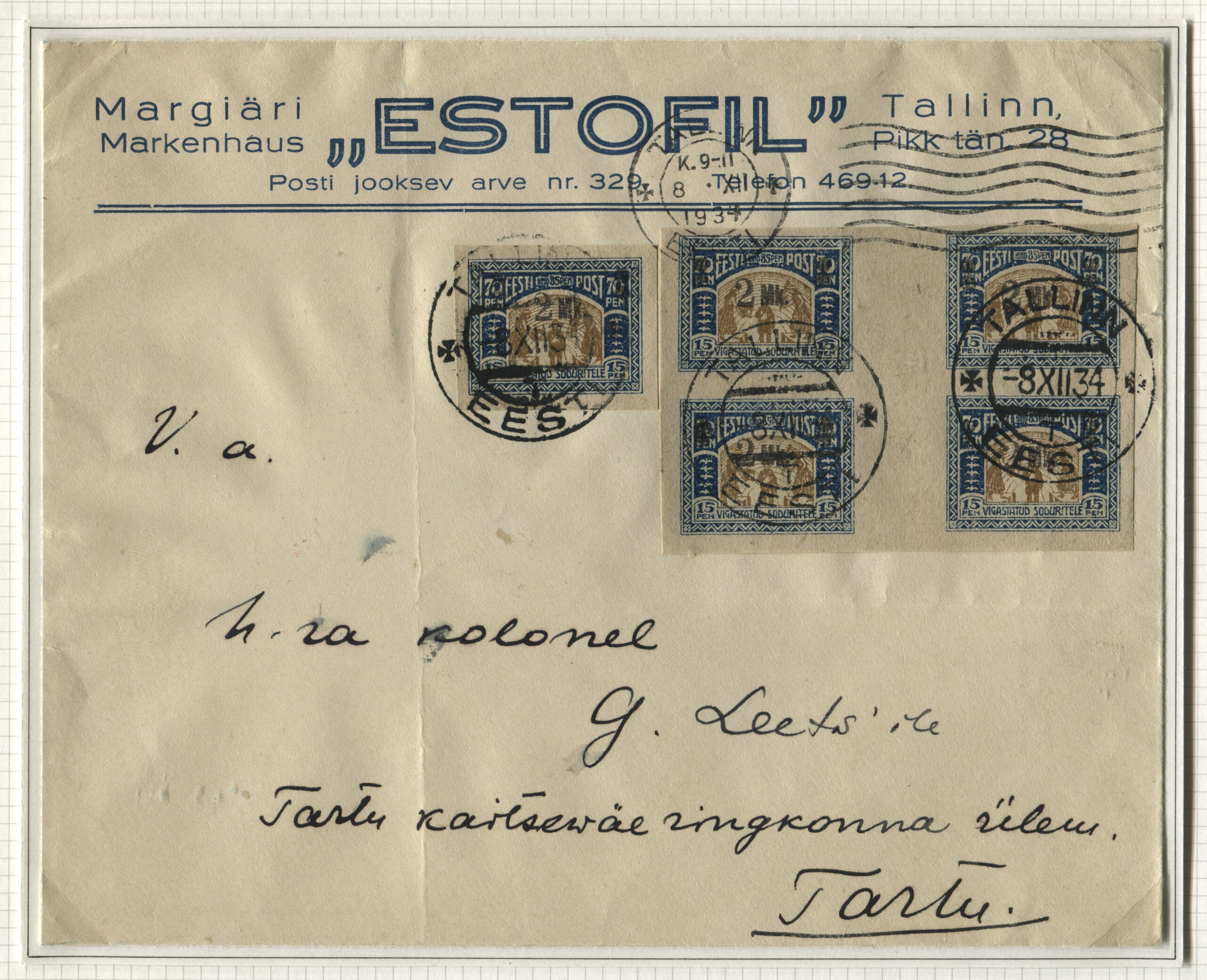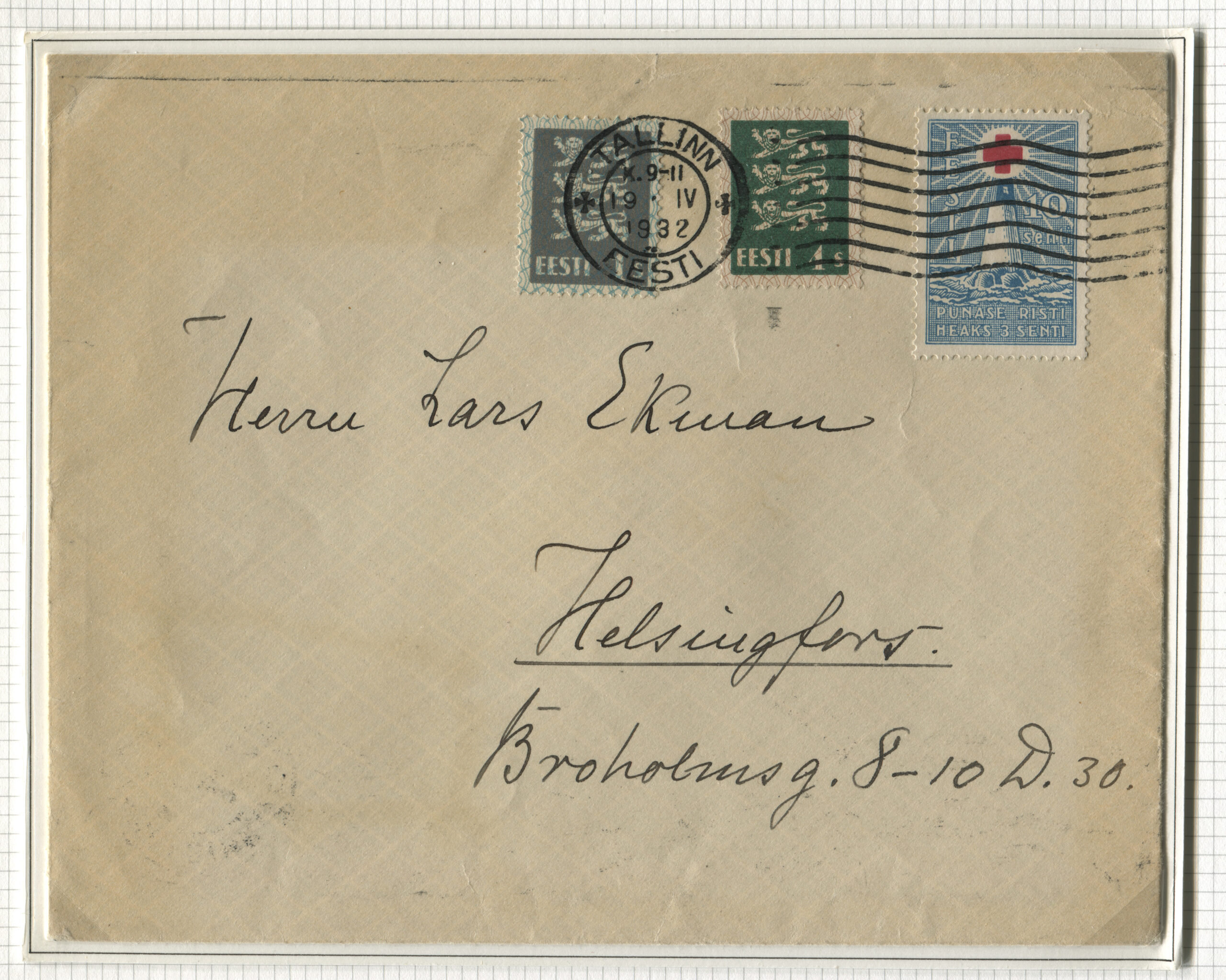 ErakoguTähitud kiri Tallinnast 15.02.1932 Helsingisse 18.02.1932.