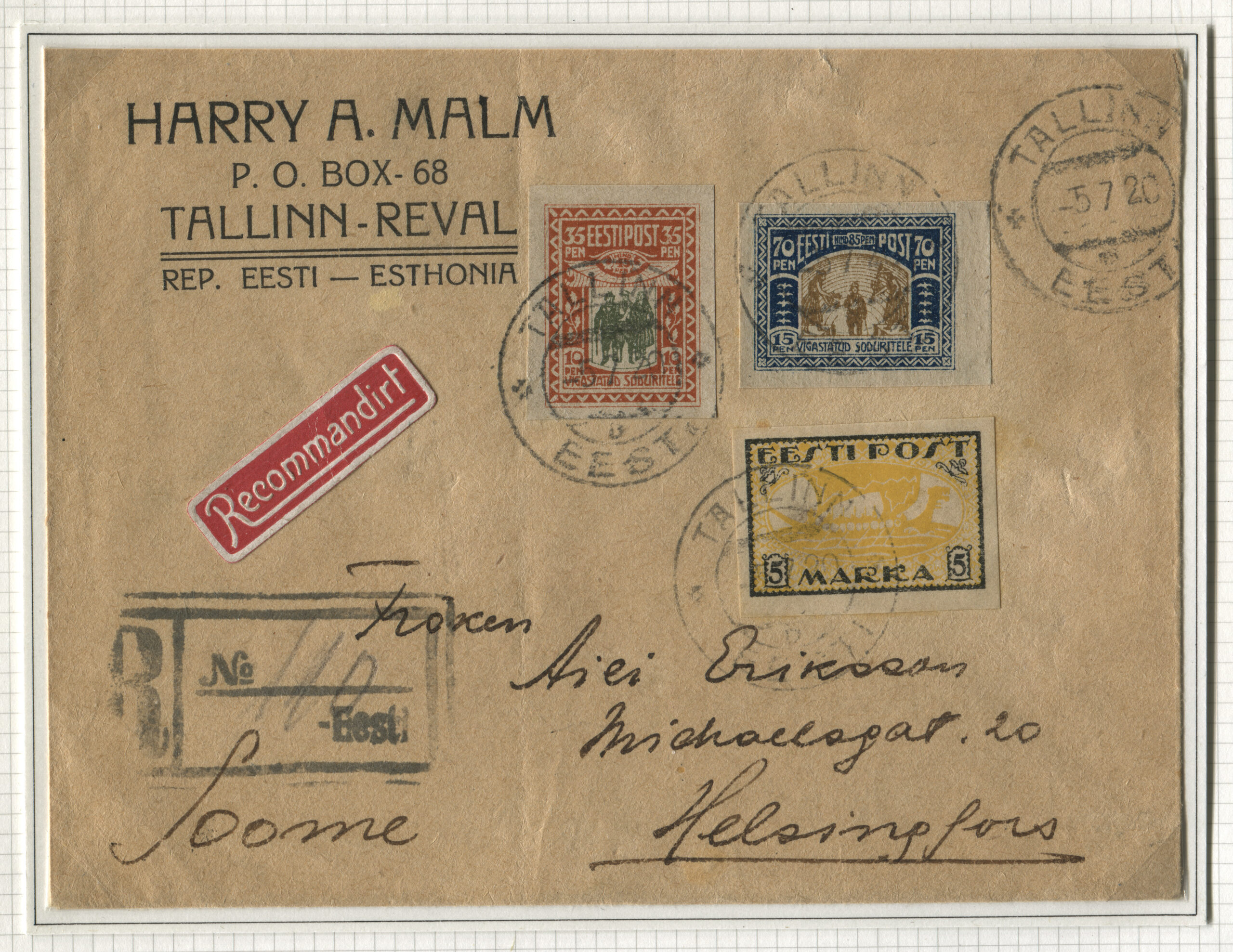 ErakoguKiri saadetud Tallinnast Helsingi, 5.07.1920.