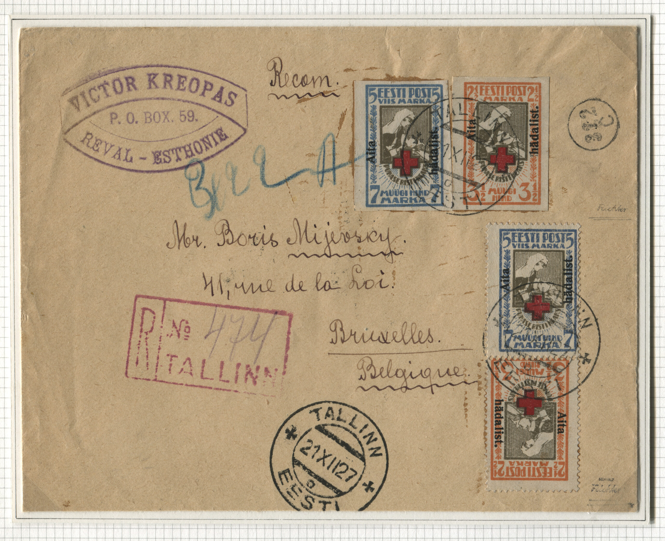 ERMi koguTähitud kiri Tallinnast 21.12.1927 Bruxellesi (Brüssel, Belgia). Tagaküljel lisatud 25 marga vääringus marke.