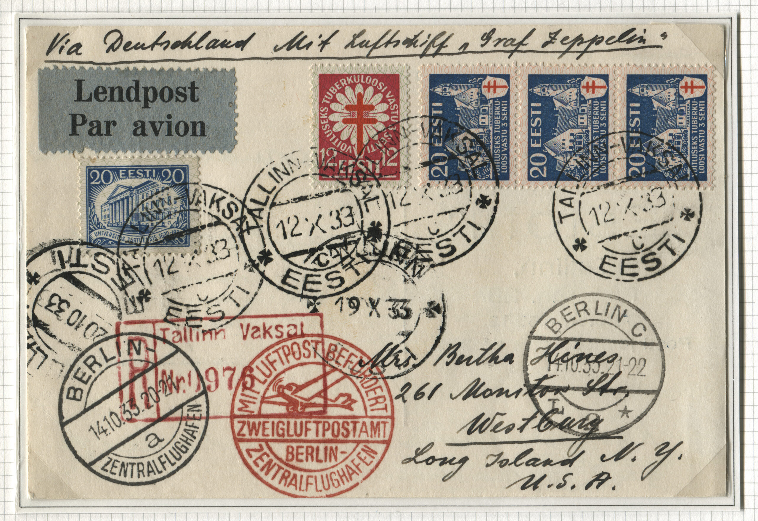 ErakoguTähitud õhupostikiri Tallinnast 12.10.1933 Westbury. Tagasi saadetud Berliinist 14.10.1933 Tallinna 19.10.1933 hilinenud saabumise tõttu. Zeppelini lennud Põhja-Ameerikasse toimusid 3.09.–10.10.1933.