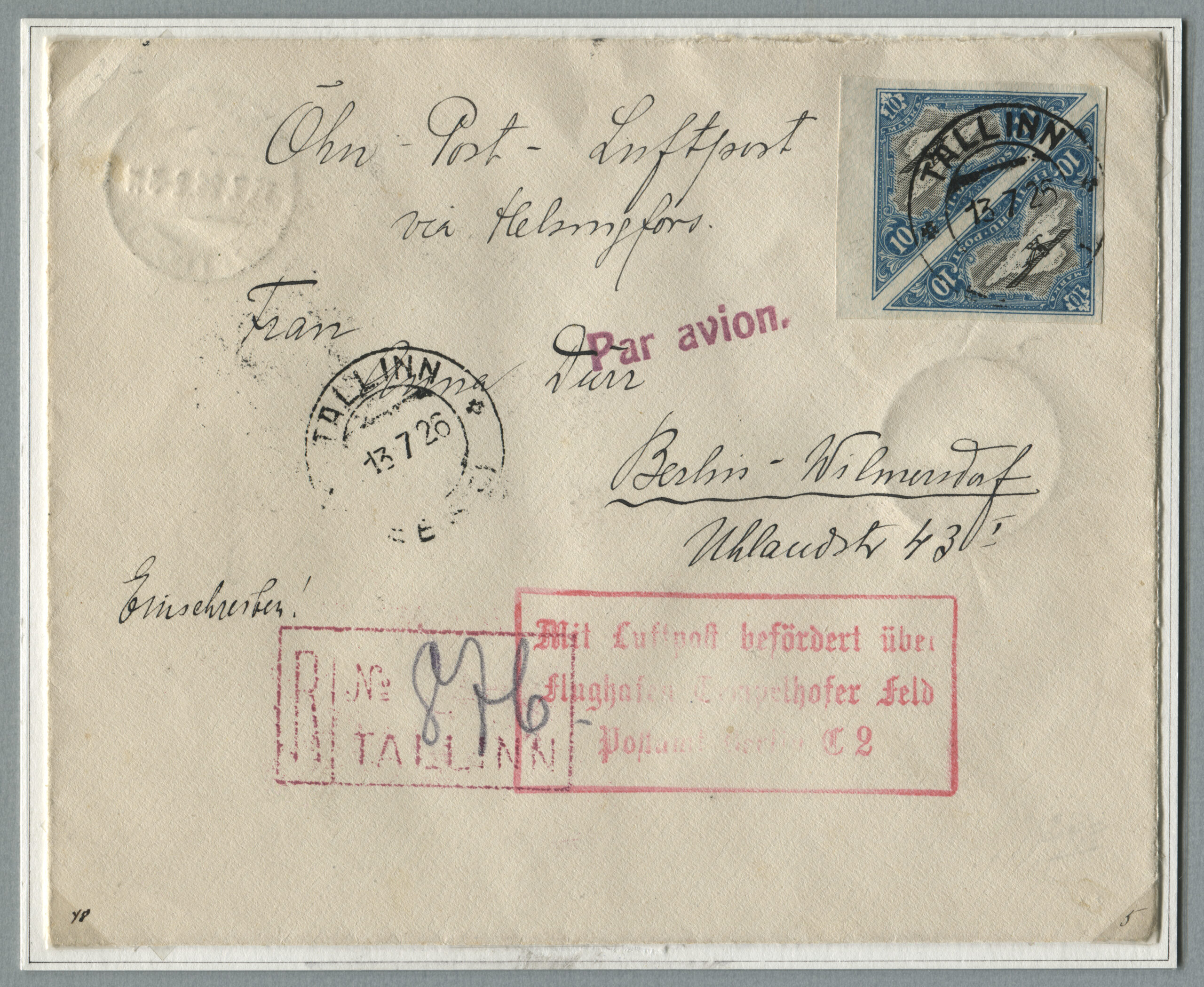 ERMi koguTähitud õhupostikiri Tallinnast 13.07.1926 Berliini 15.07.1926.