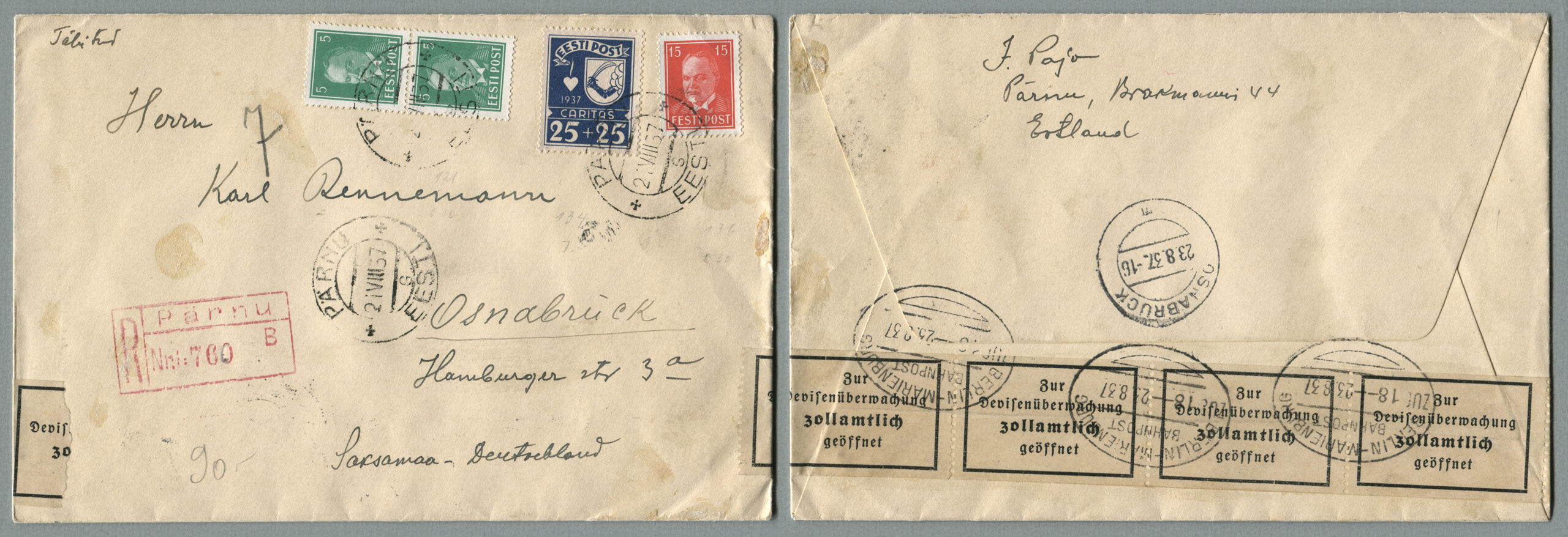 ERMi koguTähitud kiri Pärnust 21.08.1937 Osnabrücki (Saksamaa) 23.08.1937.
