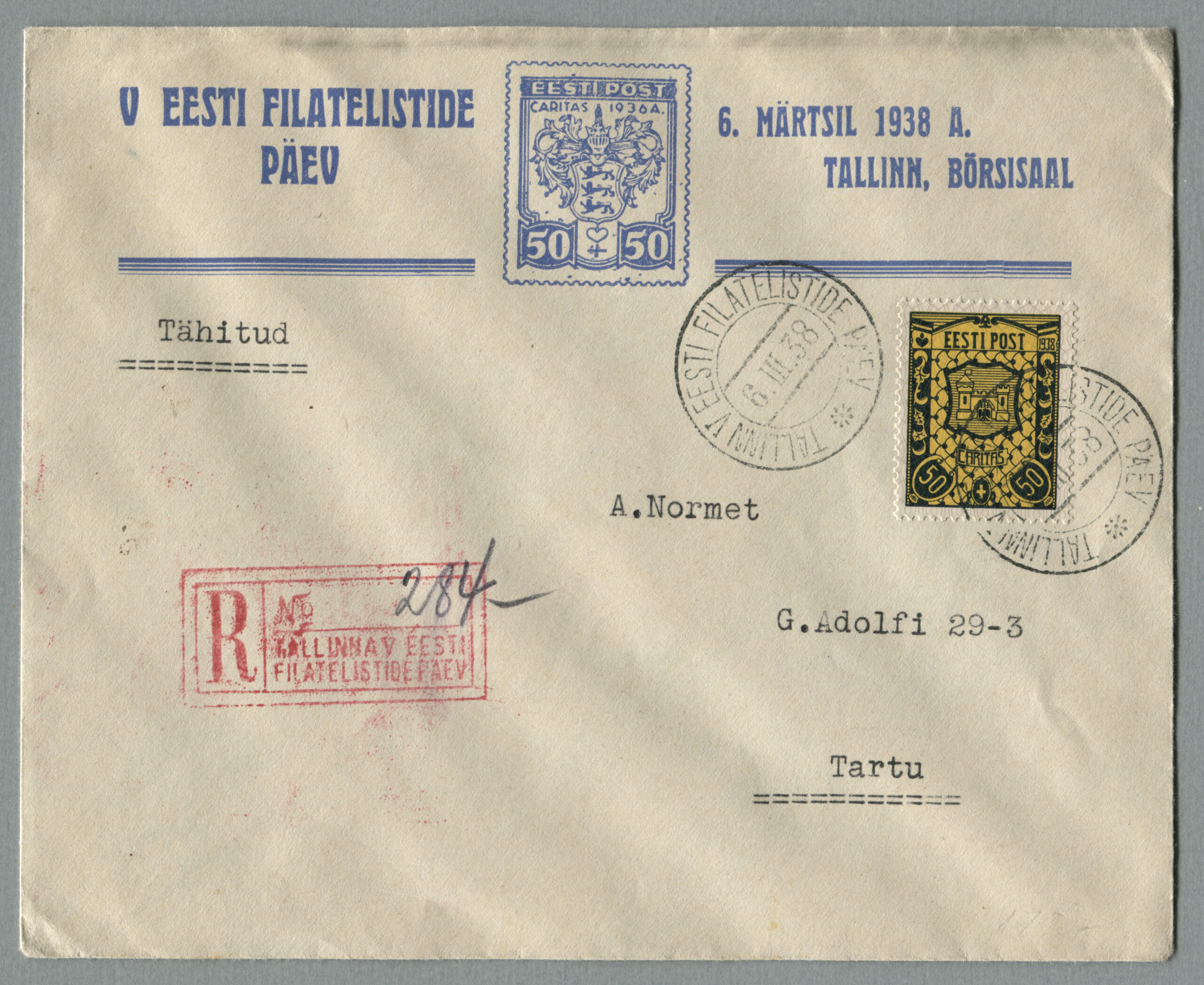 ERMi koguTähitud kiri Tallinnast Tartusse 7.03.1938. Ümbrik: V Eesti filateliste päevad, 6.märtsil 1938 a. Tallinn, Börsisaal.