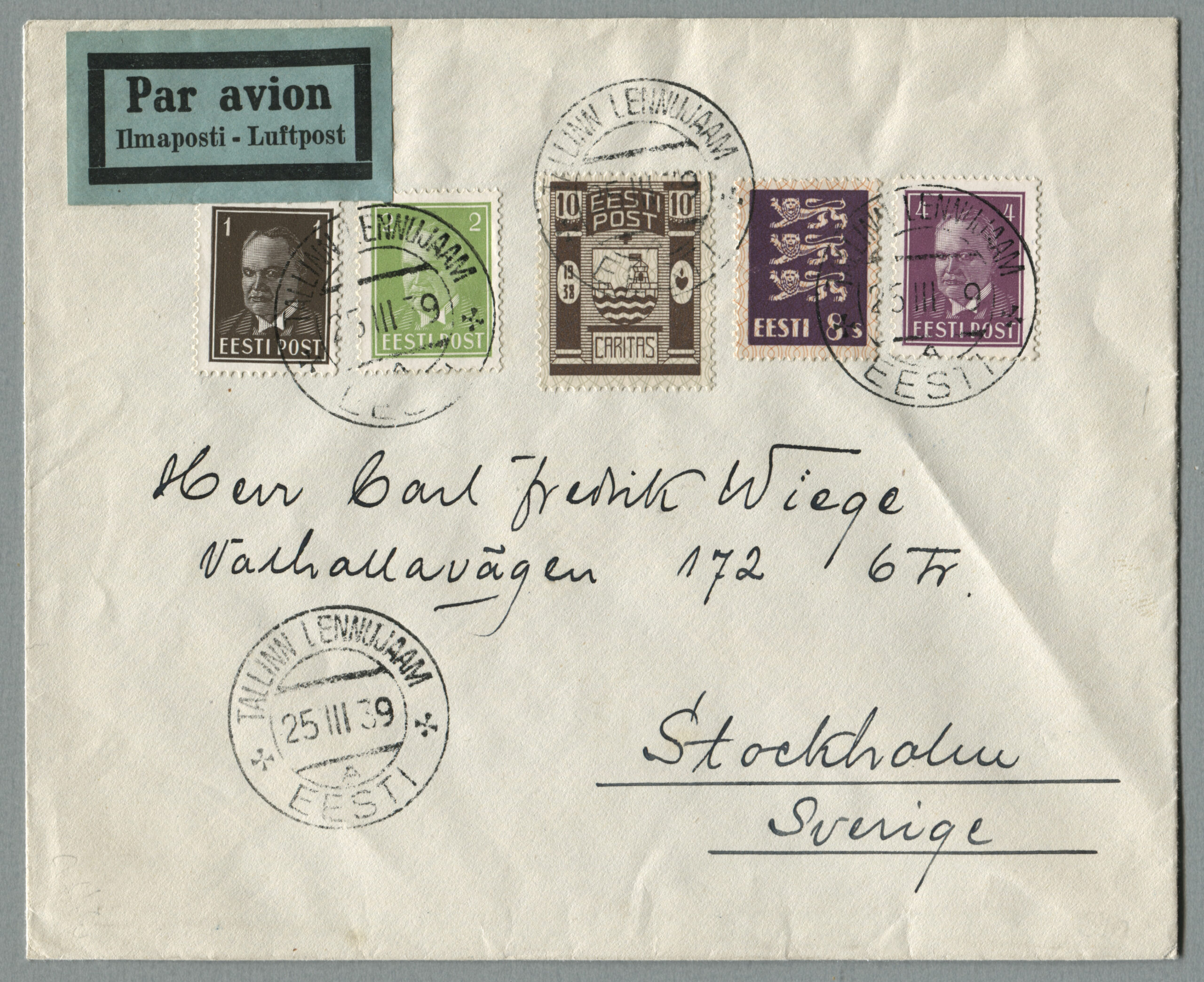 ERMi koguLennupostikiri Tallinnast 25.03.1939 Stockholmi.
