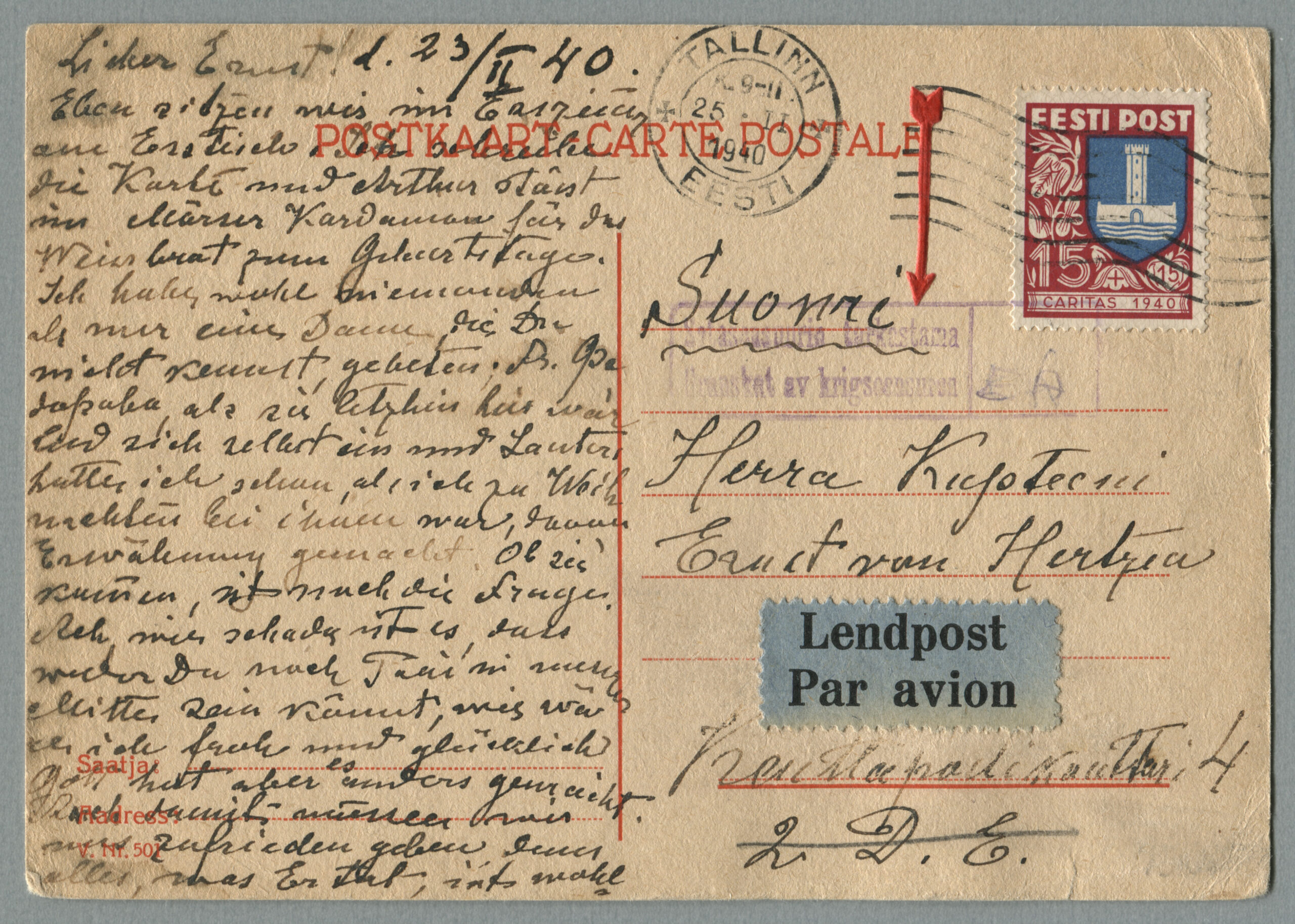 Lennupostikiri, saadetud 25.02.1940 Soome. Sõjatsensuuri tempel soome ja rootsi keeles.
