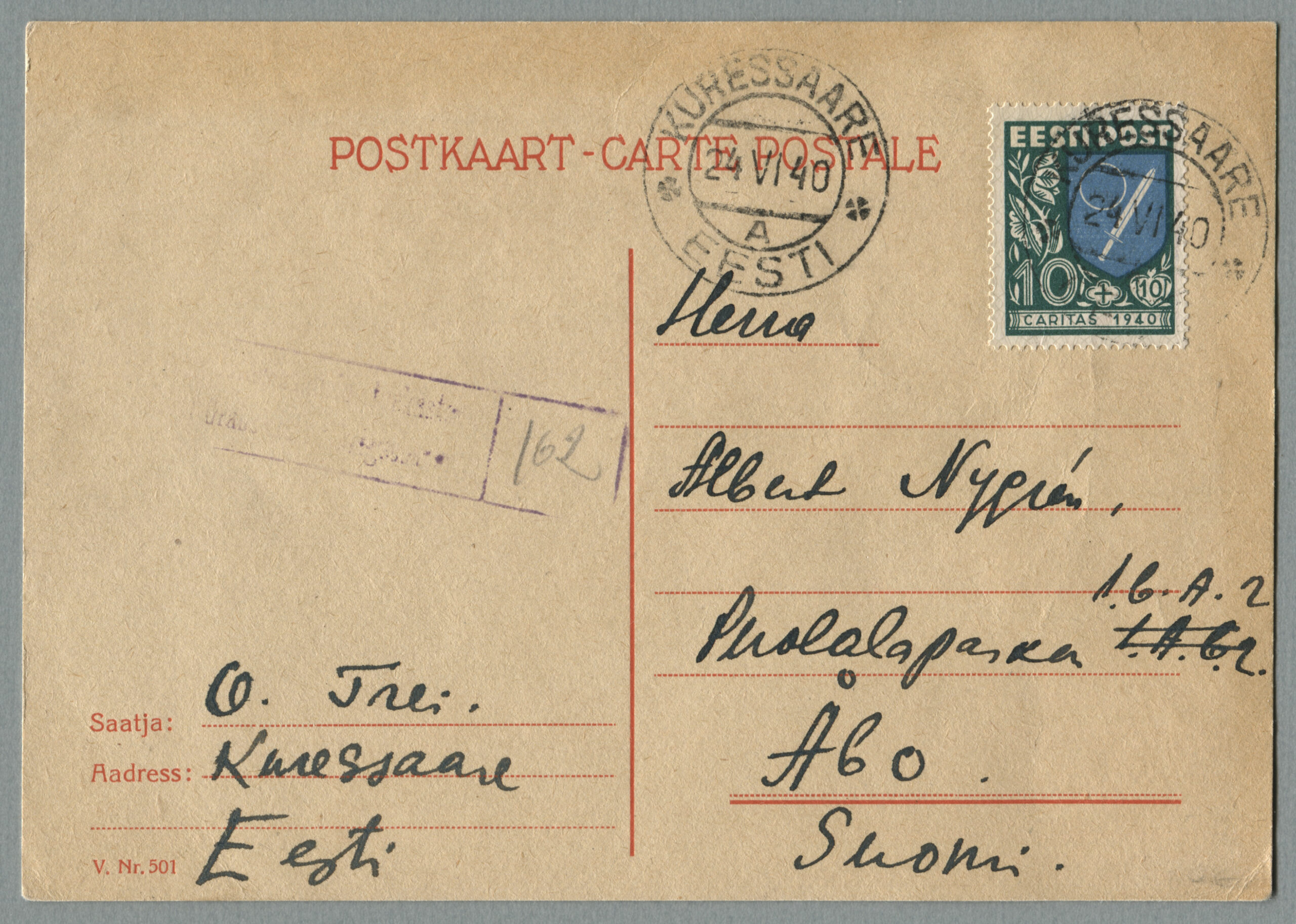 ERMi koguPostkaart Kuressaarest 24.06.1940 Soome. Sõjatsensuuri tempel soome ja rootsi keeles.