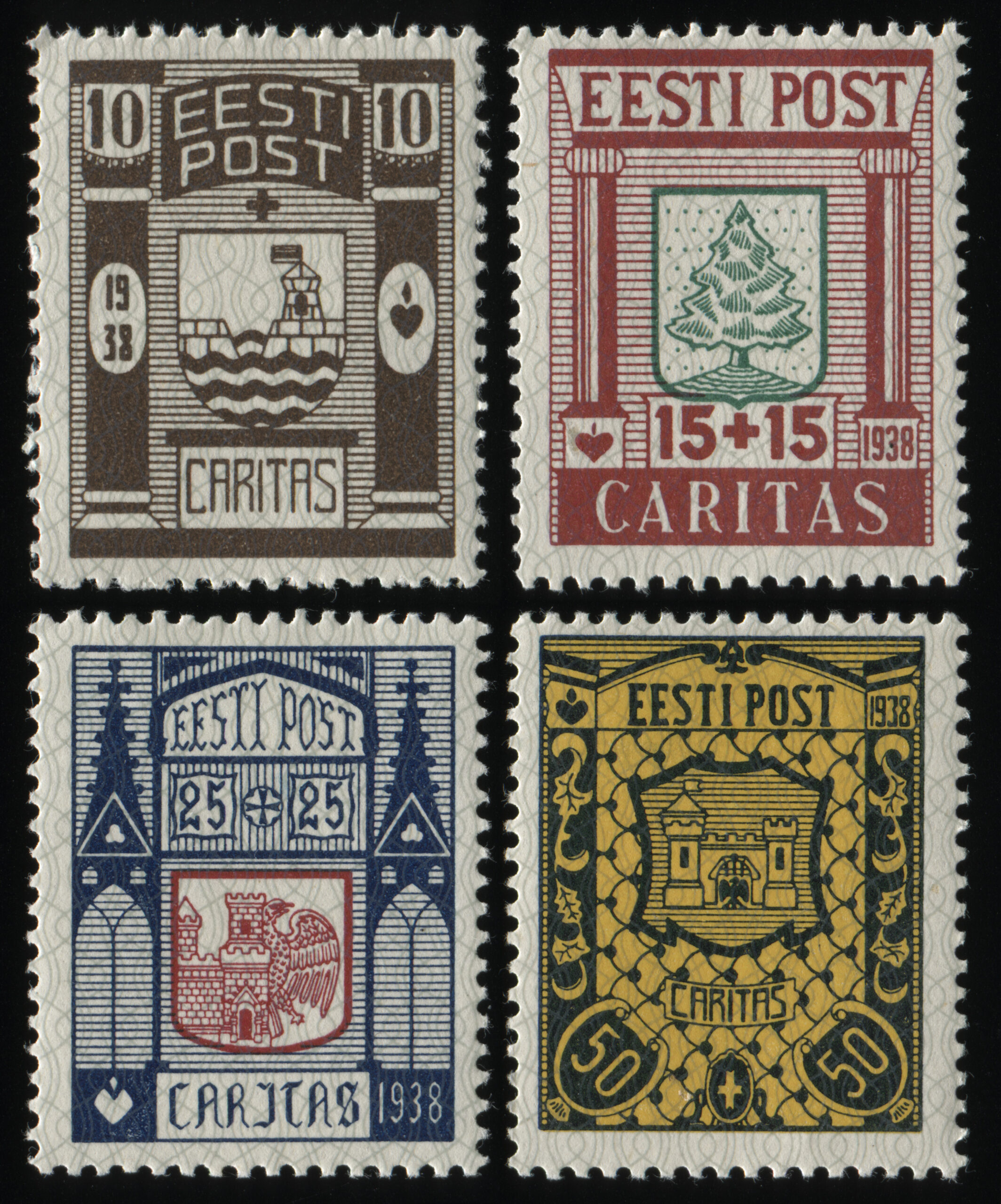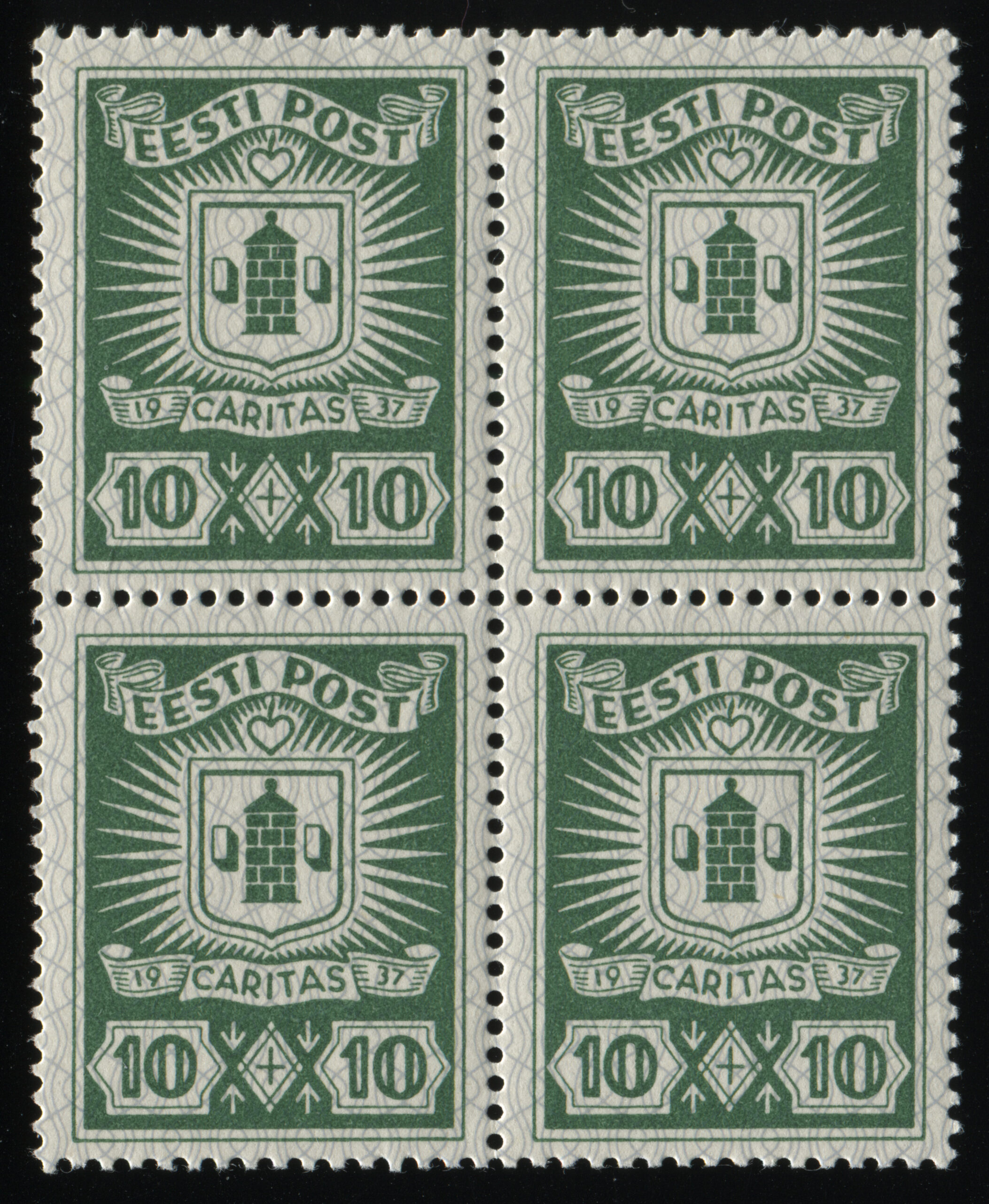 ERMi koguCaritas. Heategevusväljaanne „Ühisabi“ heaks. Eesti linnade vapid. Margiplokk, 21.01.1938, kujundanud Mihail Sidorov.